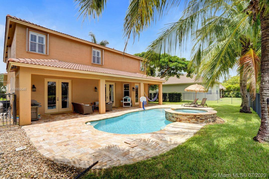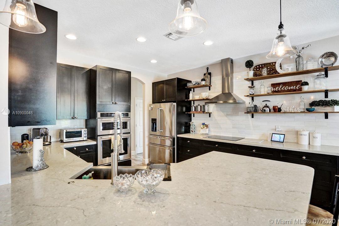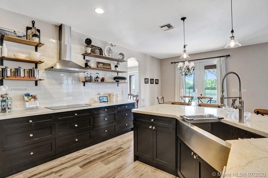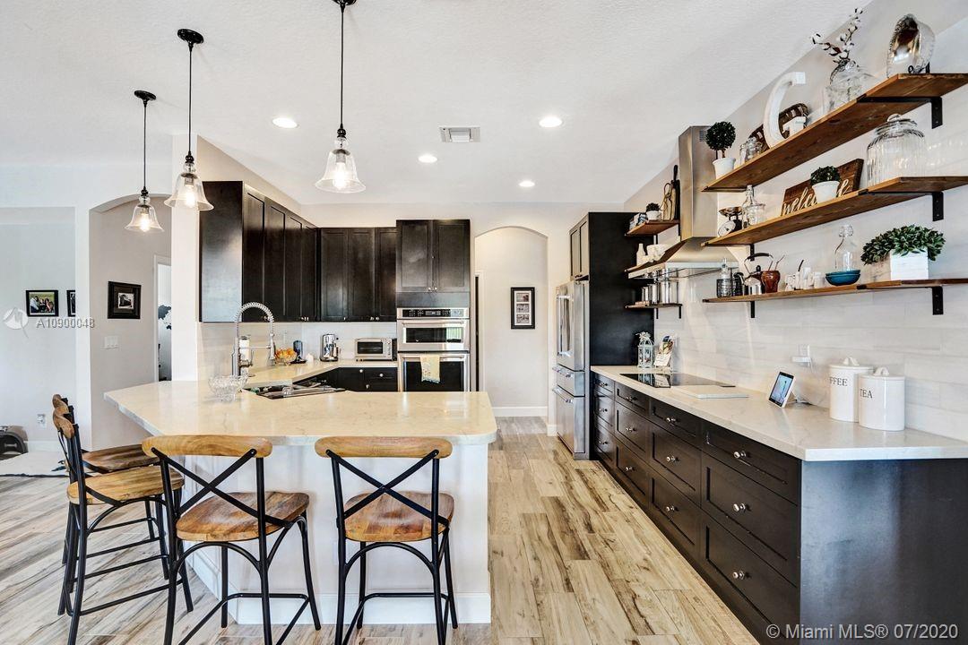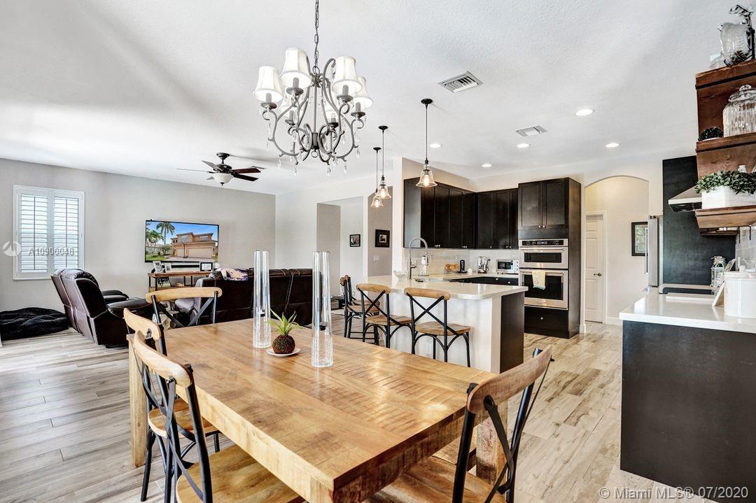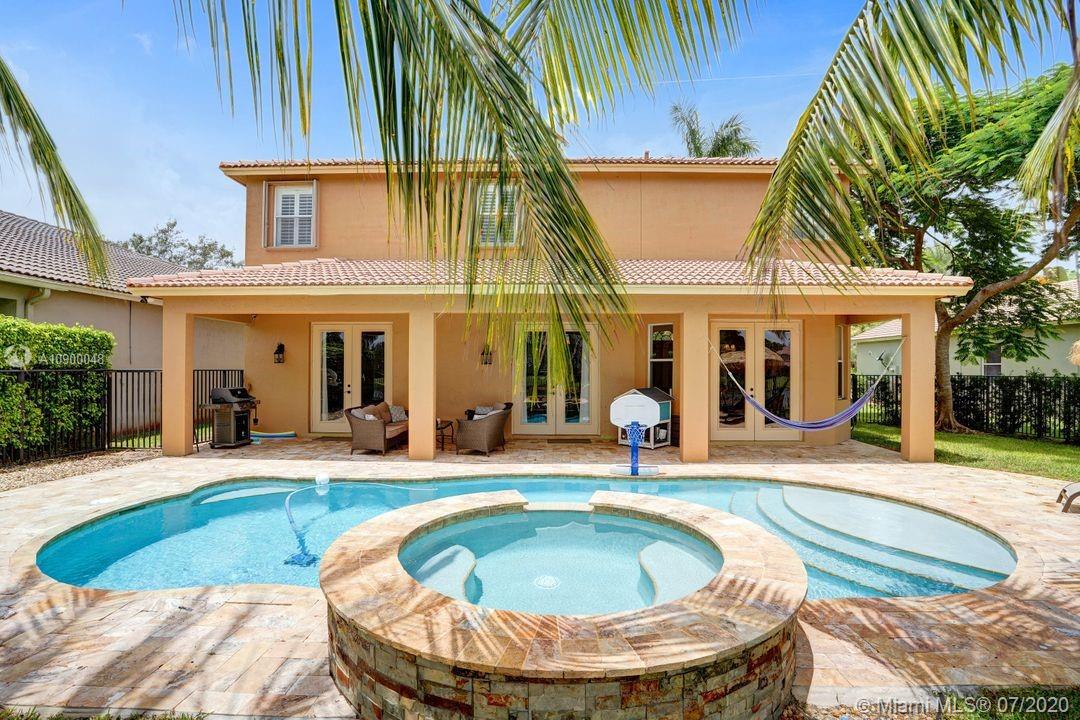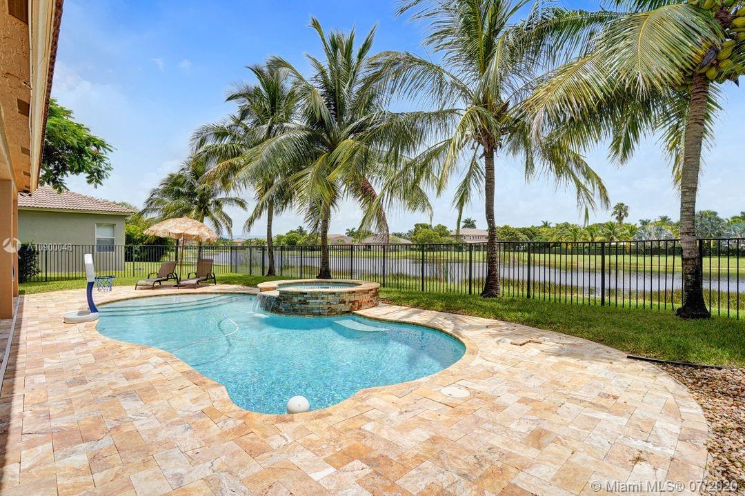 This is a beautifully updated 5/4 home and truly spectacular to any buyer looking for that modern home. Soaring two story foyer and living area with high ceilings and bright natural light. Simply amazing model like kitchen with dark wood cabinets, stainless steel appliances, quartz counter tops, subway marble back splash and breakfast area. Modern wood like tile downstairs with one bedroom and remodeled bathroom. Upstairs you have a huge loft for entertainment, dark wood flooring, two nicely remodeled bathrooms, plantation shutters and grand master suite with water views. Gorgeous salt chlorinated free form pool with jacuzzi and tumbled marble pavers.Tranquil water views and very large covered patio on over sized lot with lush tropical landscaping. Accordion shutters and more.Welcome home!