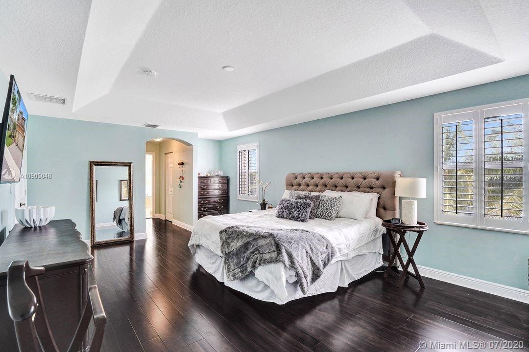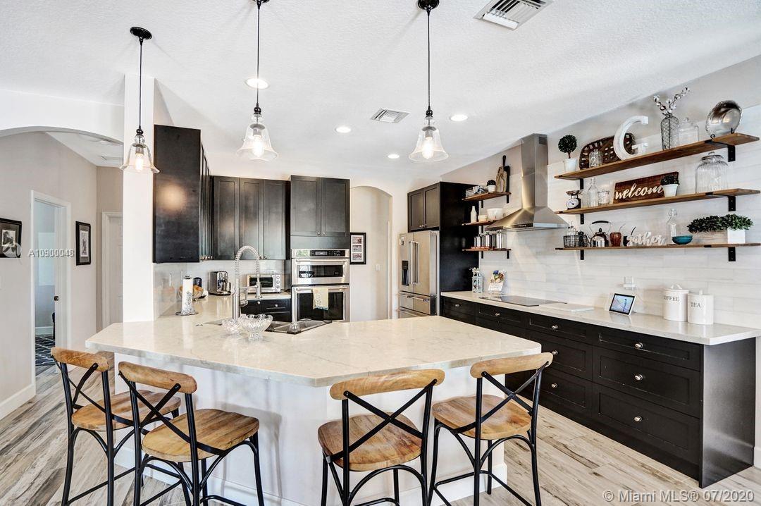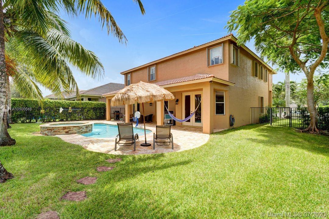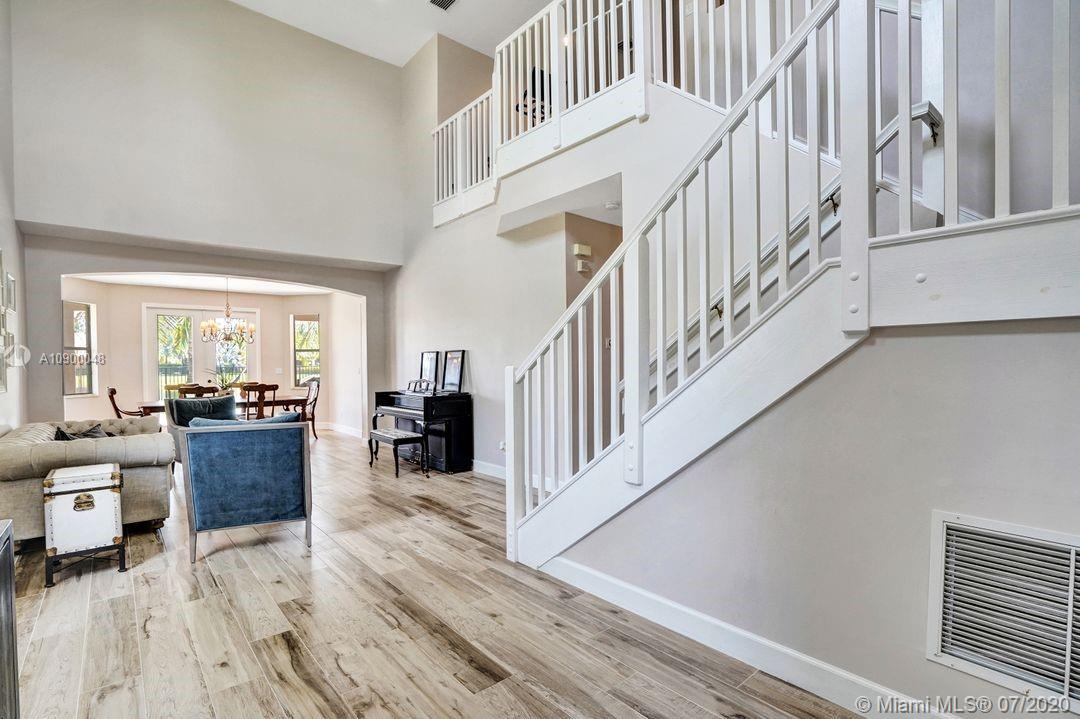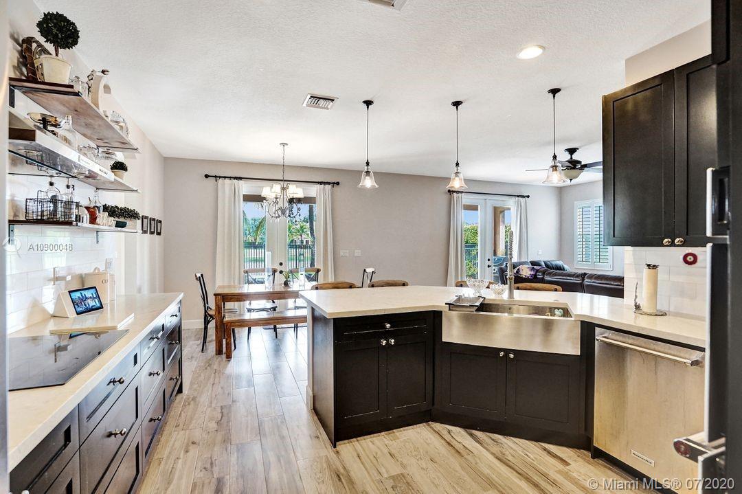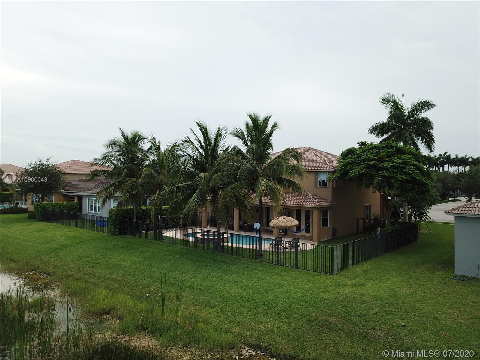 This is a beautifully updated 5/4 home and truly spectacular to any buyer looking for that modern home. Soaring two story foyer and living area with high ceilings and bright natural light. Simply amazing model like kitchen with dark wood cabinets, stainless steel appliances, quartz counter tops, subway marble back splash and breakfast area. Modern wood like tile downstairs with one bedroom and remodeled bathroom. Upstairs you have a huge loft for entertainment, dark wood flooring, two nicely remodeled bathrooms, plantation shutters and grand master suite with water views. Gorgeous salt chlorinated free form pool with jacuzzi and tumbled marble pavers.Tranquil water views and very large covered patio on over sized lot with lush tropical landscaping. Accordion shutters and more.Welcome home!