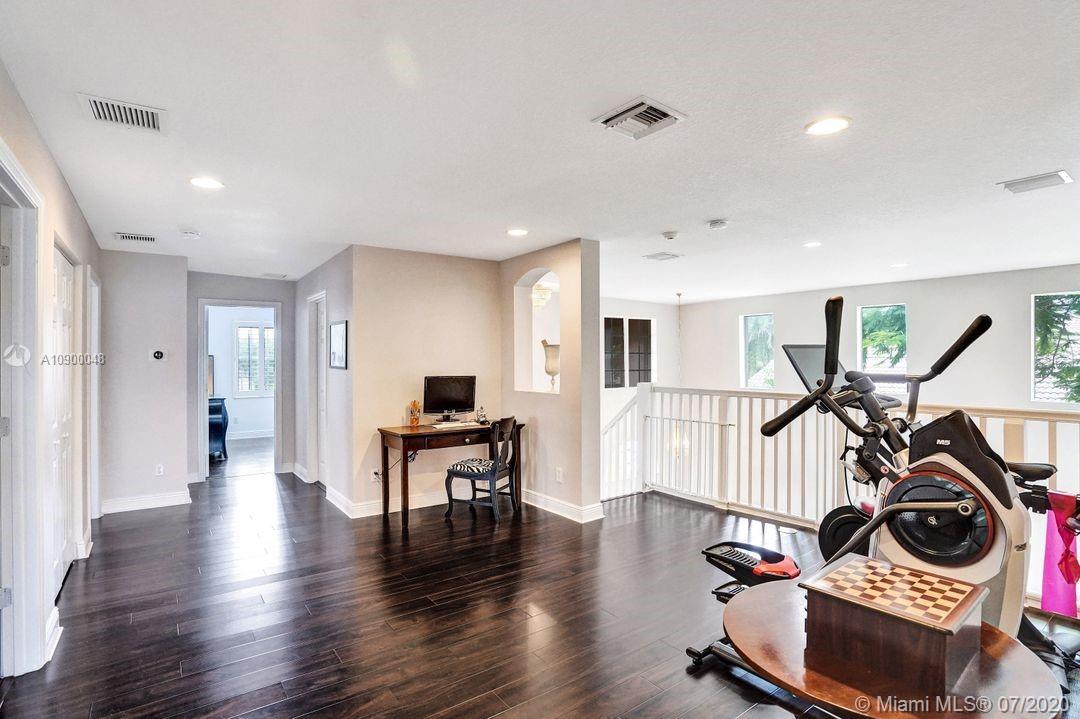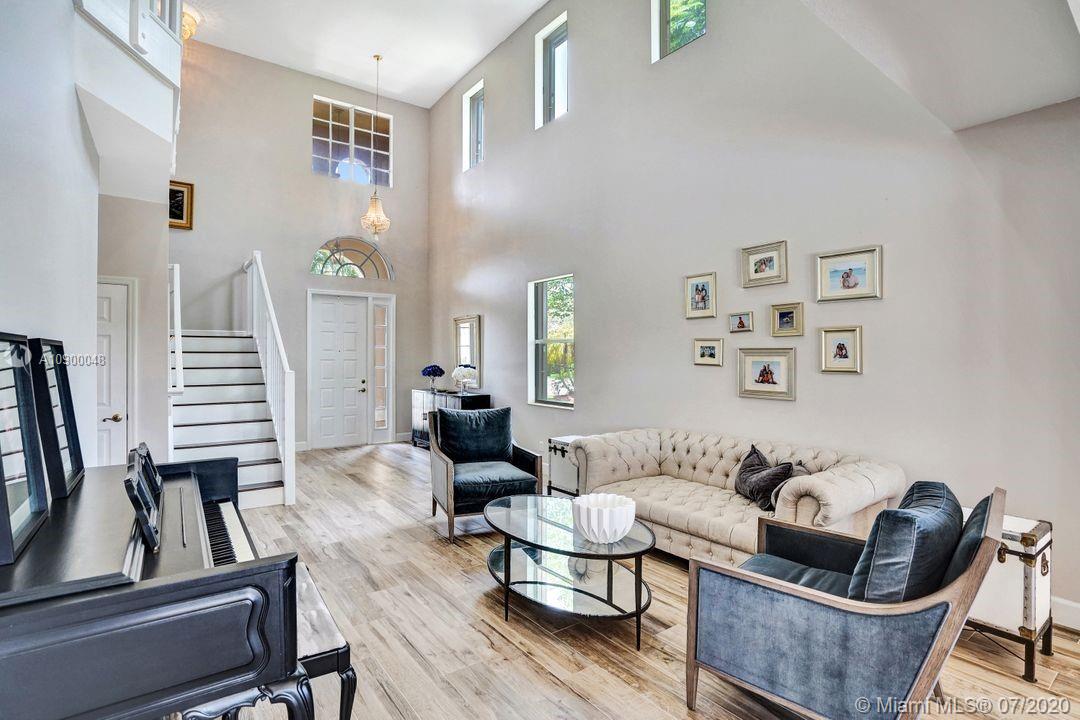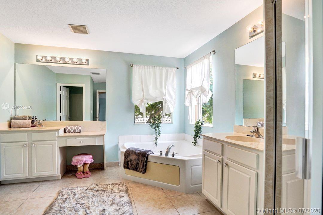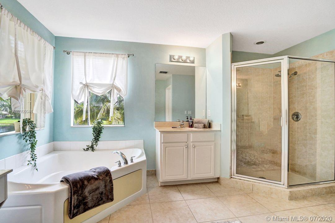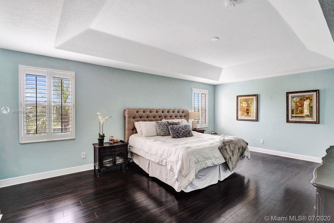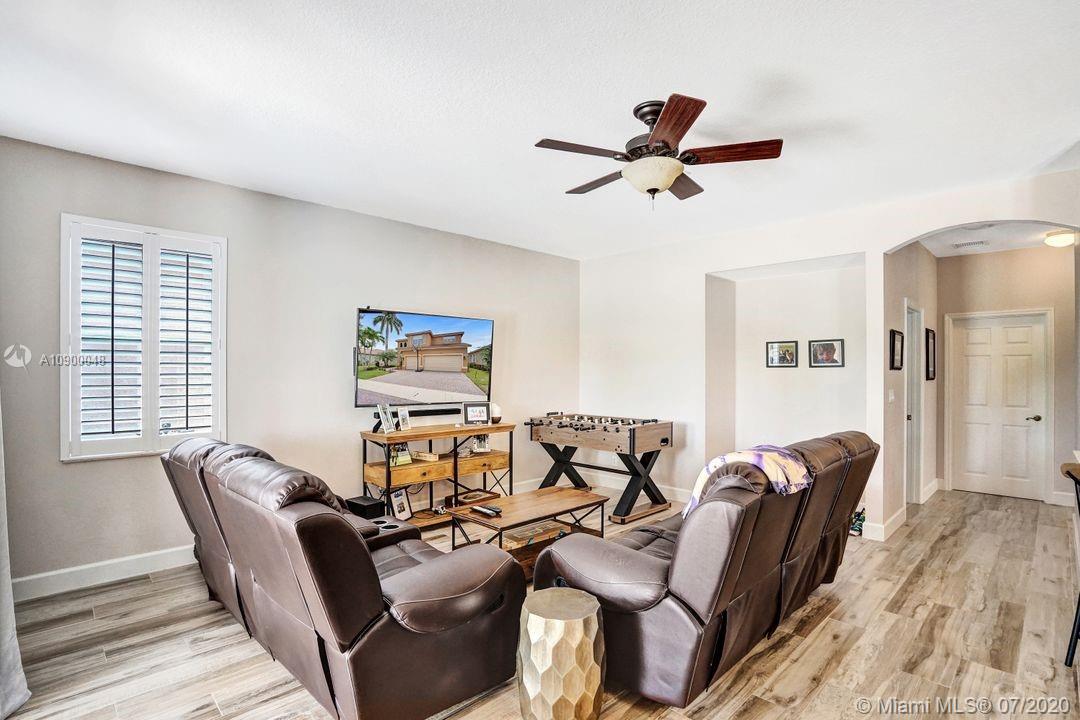 This is a beautifully updated 5/4 home and truly spectacular to any buyer looking for that modern home. Soaring two story foyer and living area with high ceilings and bright natural light. Simply amazing model like kitchen with dark wood cabinets, stainless steel appliances, quartz counter tops, subway marble back splash and breakfast area. Modern wood like tile downstairs with one bedroom and remodeled bathroom. Upstairs you have a huge loft for entertainment, dark wood flooring, two nicely remodeled bathrooms, plantation shutters and grand master suite with water views. Gorgeous salt chlorinated free form pool with jacuzzi and tumbled marble pavers.Tranquil water views and very large covered patio on over sized lot with lush tropical landscaping. Accordion shutters and more.Welcome home!