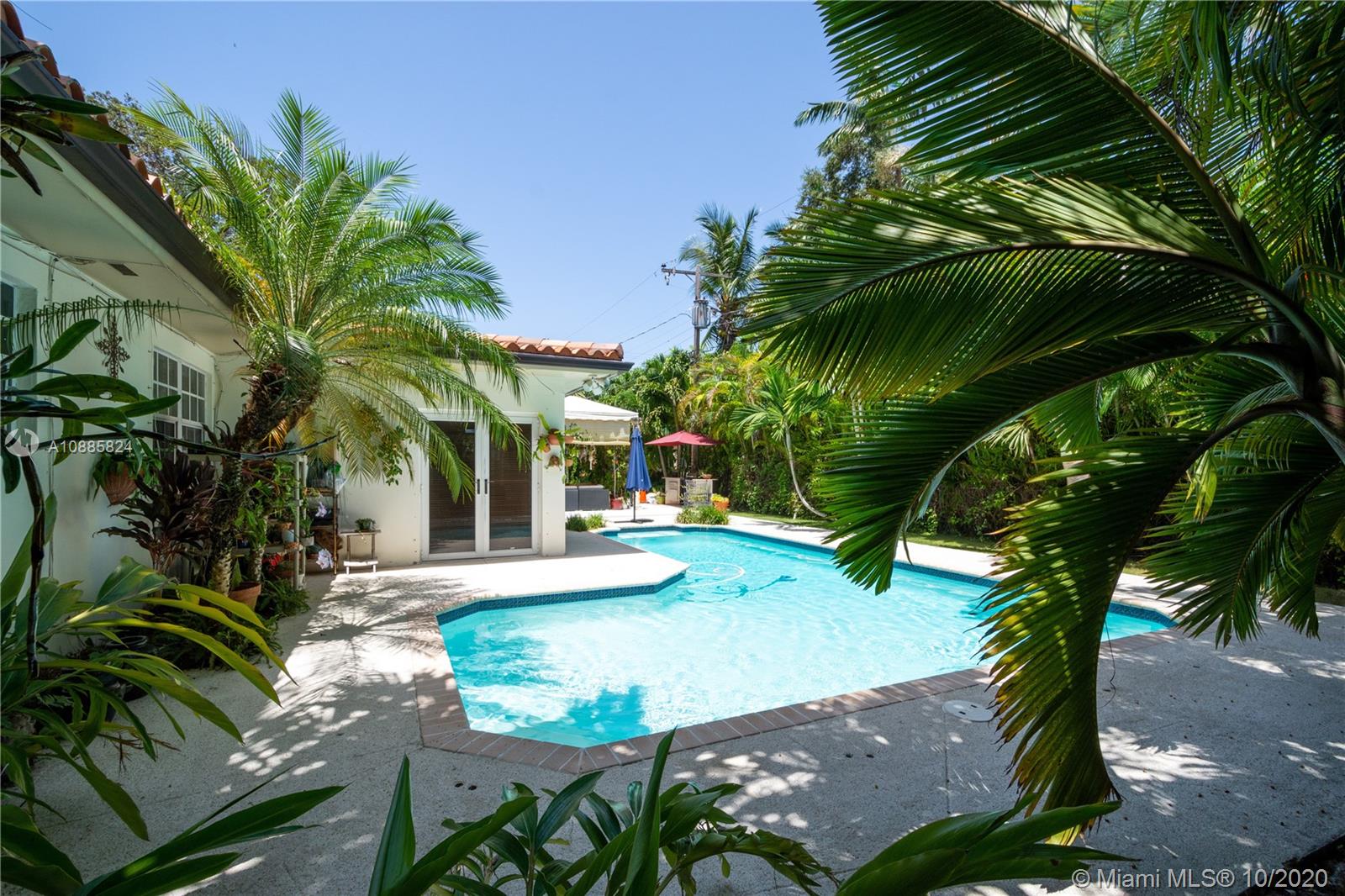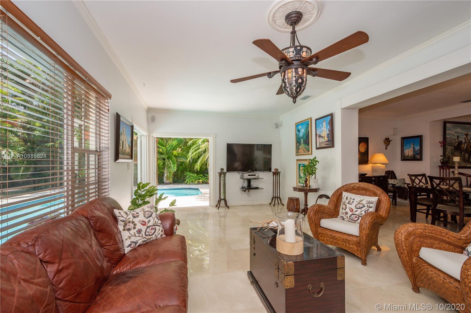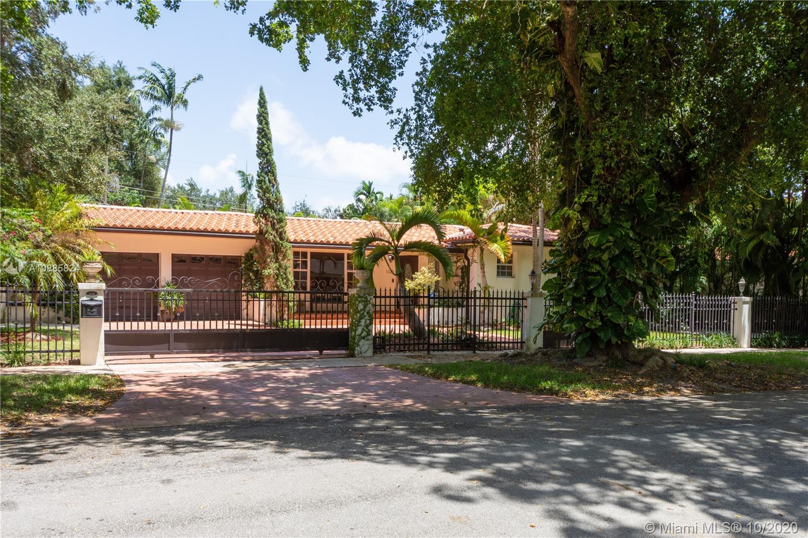 Charming walled and gated home on picturesque tree-lined Bayamo, situated in a central South Gables area. A foyer entrance leads to a lovely open concept layout: formal living room, spacious dining and a light and bright entertainment room open to a romantic pool area are all conducive to memorable gatherings in and outdoors. Great kitchen with open counter, stainless steel appliances and ample closet space throughout. Comfortable principal en-suite; two other bedrooms and bath. Marble floors, recessed lighting, two-car garage, two air conditioning units. Close to the University of Miami, A-rated public and private schools. Must see!