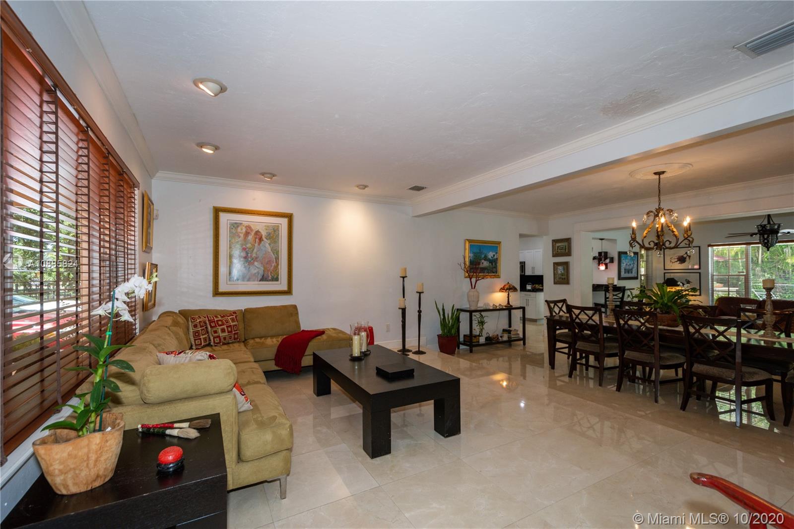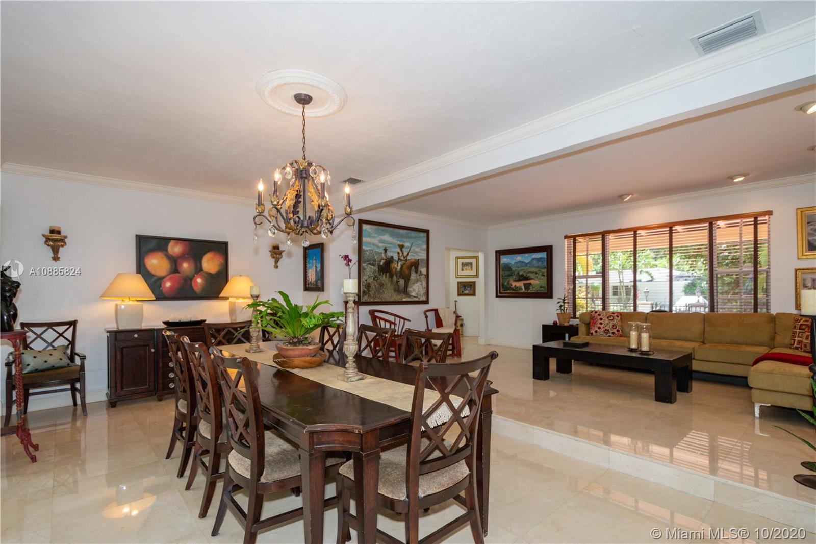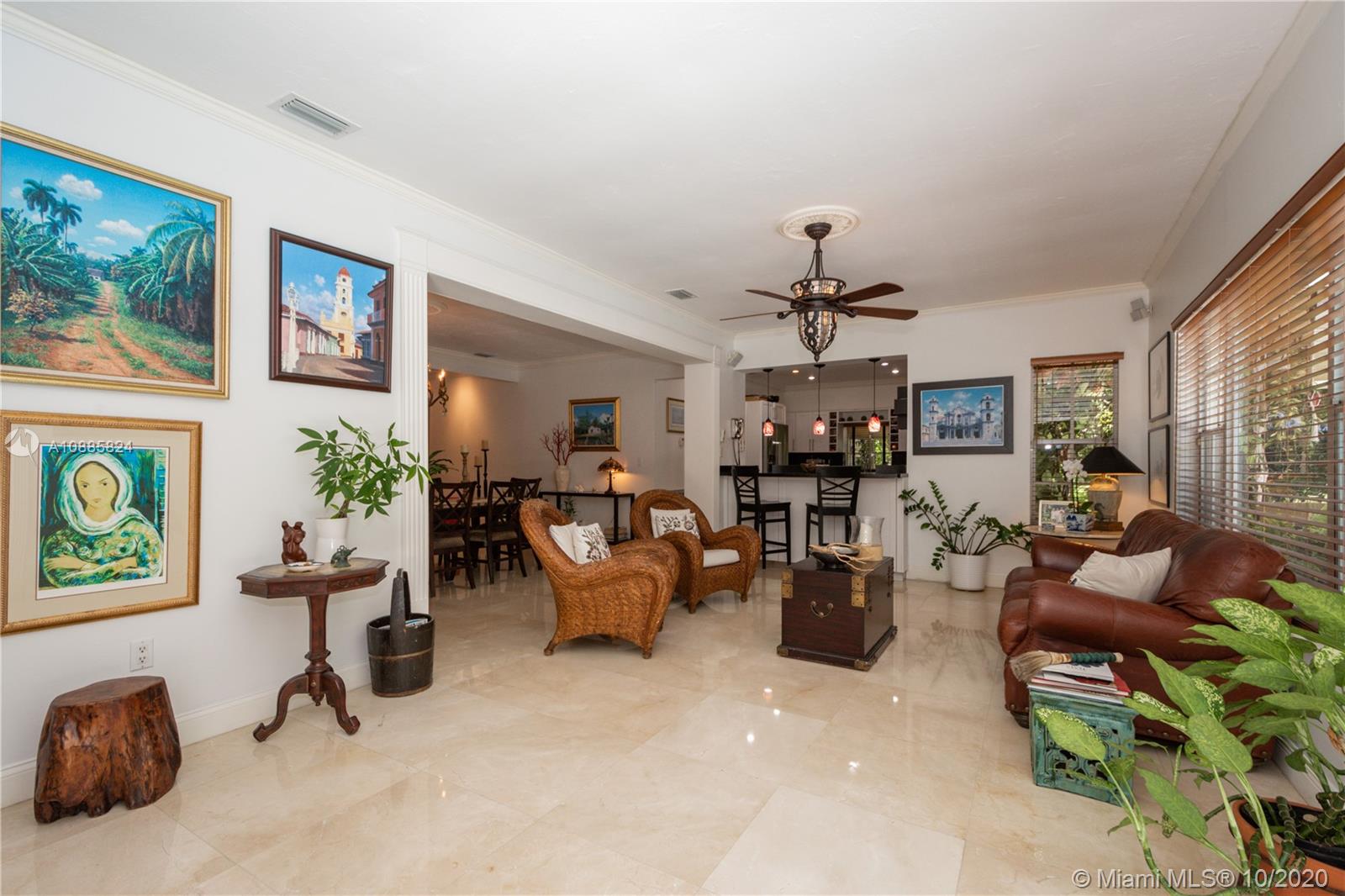 Charming walled and gated home on picturesque tree-lined Bayamo, situated in a central South Gables area. A foyer entrance leads to a lovely open concept layout: formal living room, spacious dining and a light and bright entertainment room open to a romantic pool area are all conducive to memorable gatherings in and outdoors. Great kitchen with open counter, stainless steel appliances and ample closet space throughout. Comfortable principal en-suite; two other bedrooms and bath. Marble floors, recessed lighting, two-car garage, two air conditioning units. Close to the University of Miami, A-rated public and private schools. Must see!