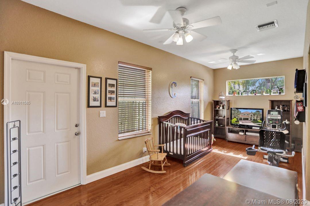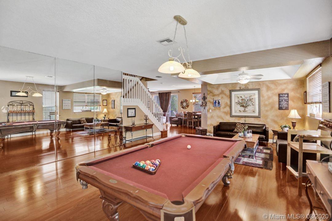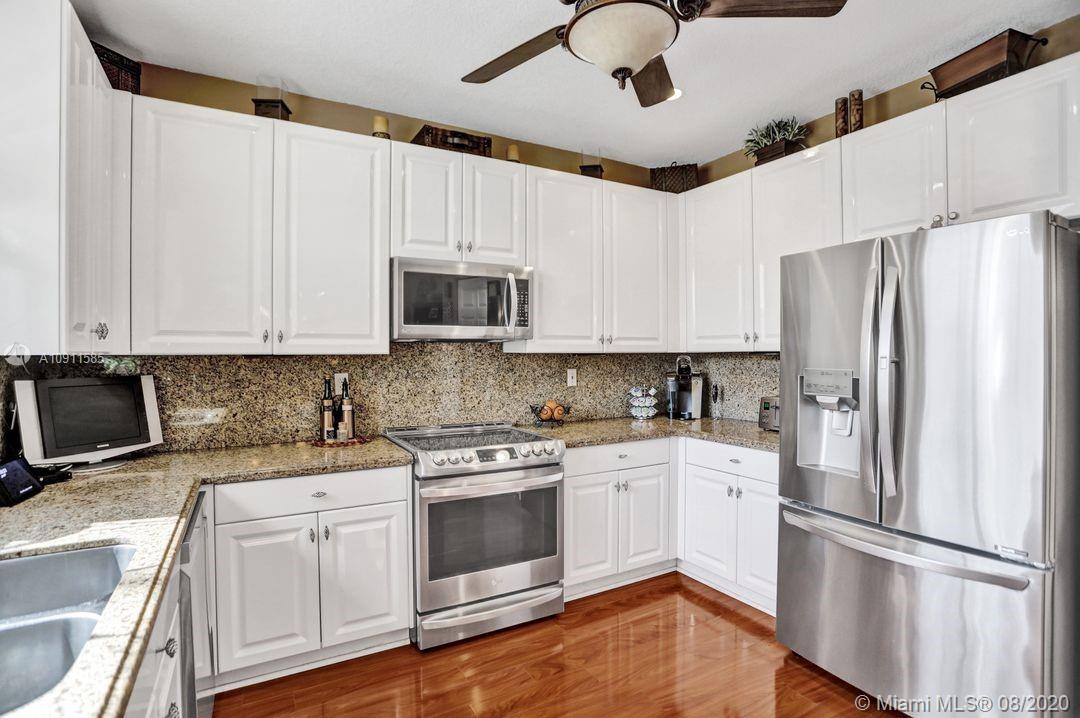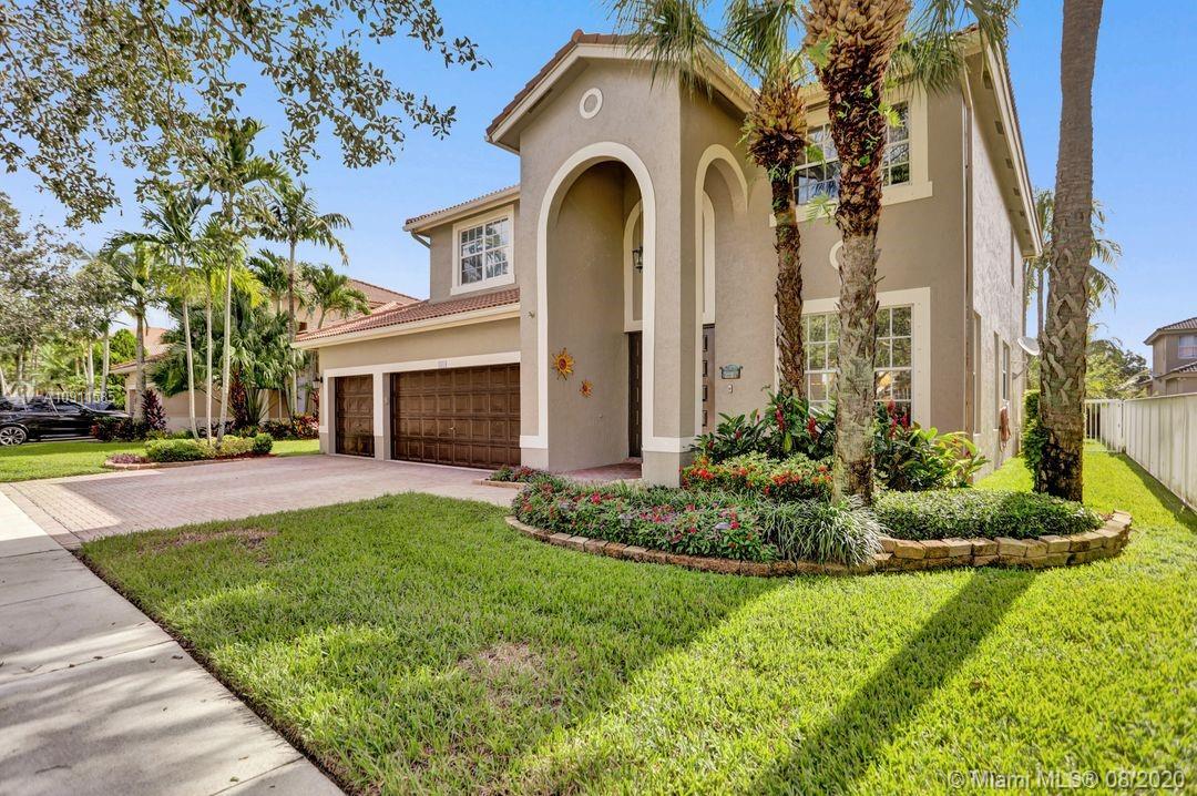 This is a truly beautiful home with 5 bedrooms and 3 full baths of which one large bedroom downstairs with bath and a 3 car garage. Very nice kitchen with white cabinets, granite counters and stainless steel appliances. Cherry colored wood flooring downstairs and upstairs. Amazing private backyard with free form pool, covered patio with balcony and lush landscaping. Home has a new AC unit and water heater. This home is well maintained and a great family home located in one of the best communities in Weston. HOA includes landscaping, community pool, fitness room and is guard gated. Minutes to great schools, restaurants, shopping and major highways. Won't last!