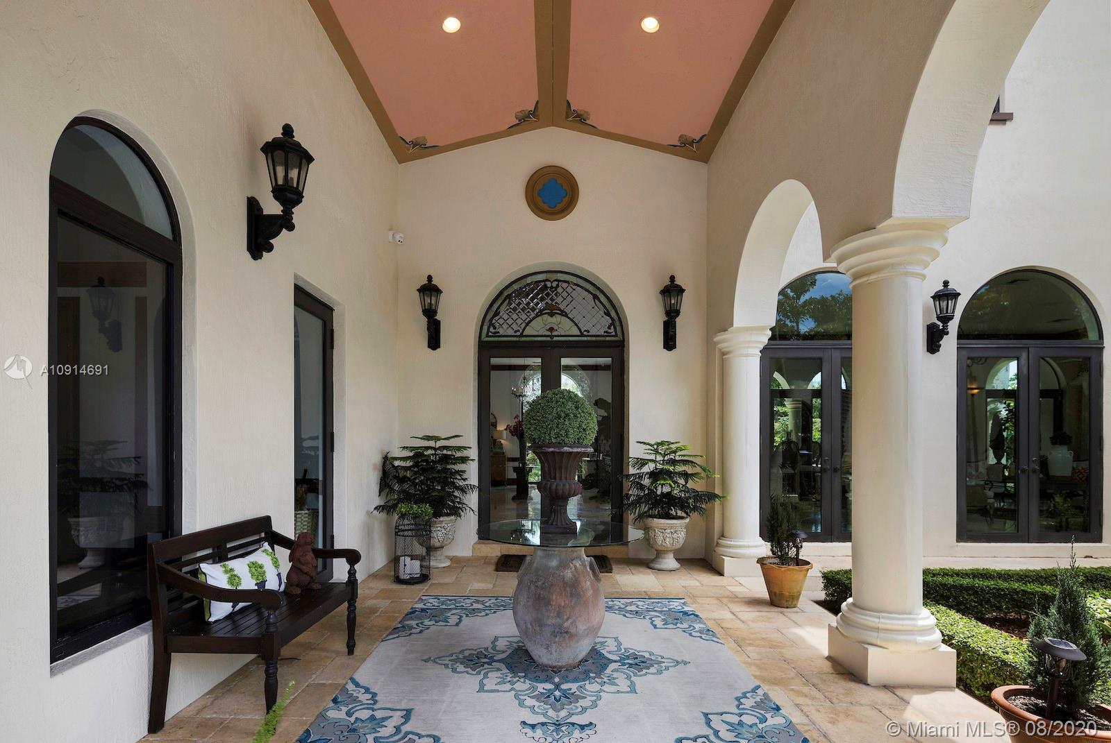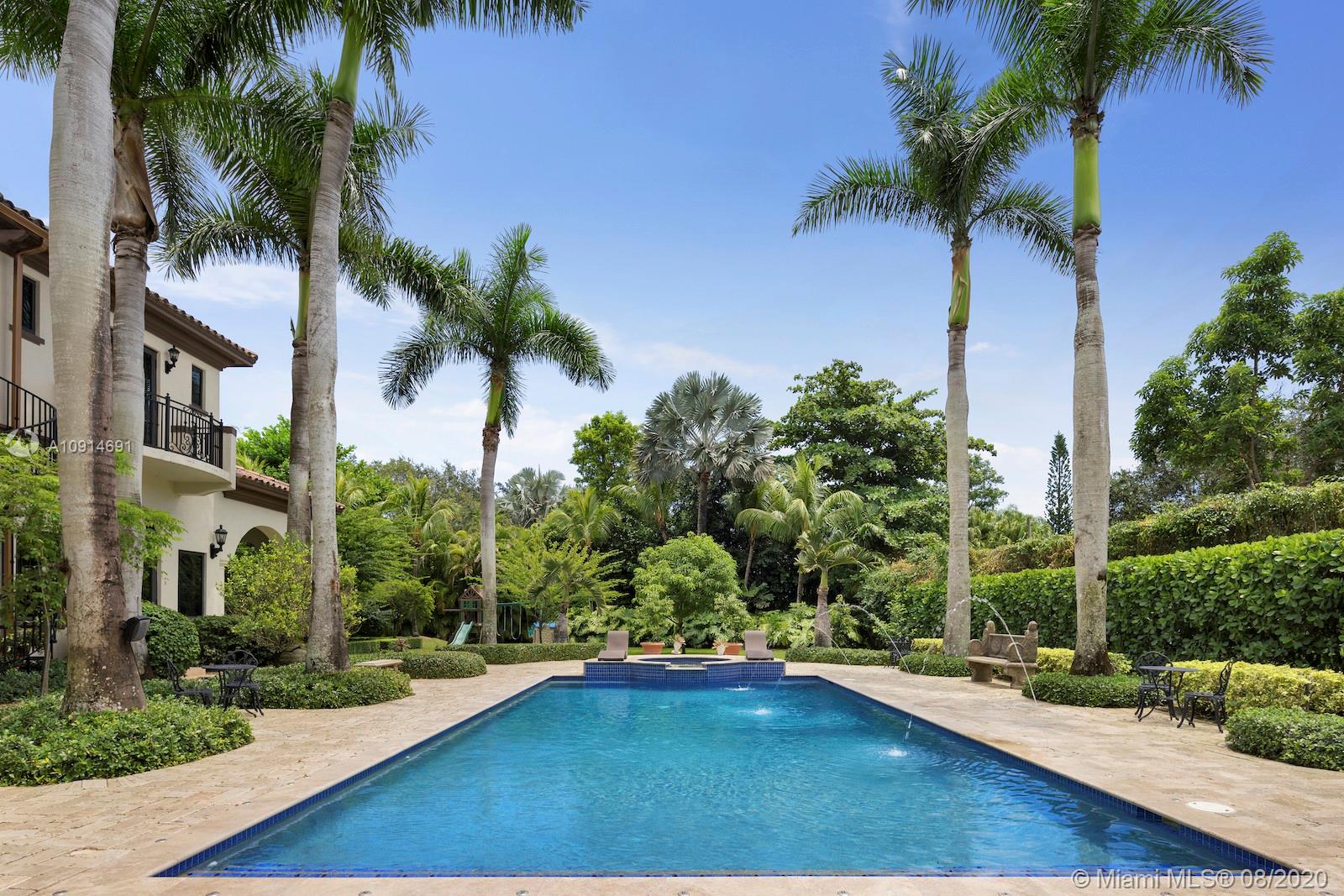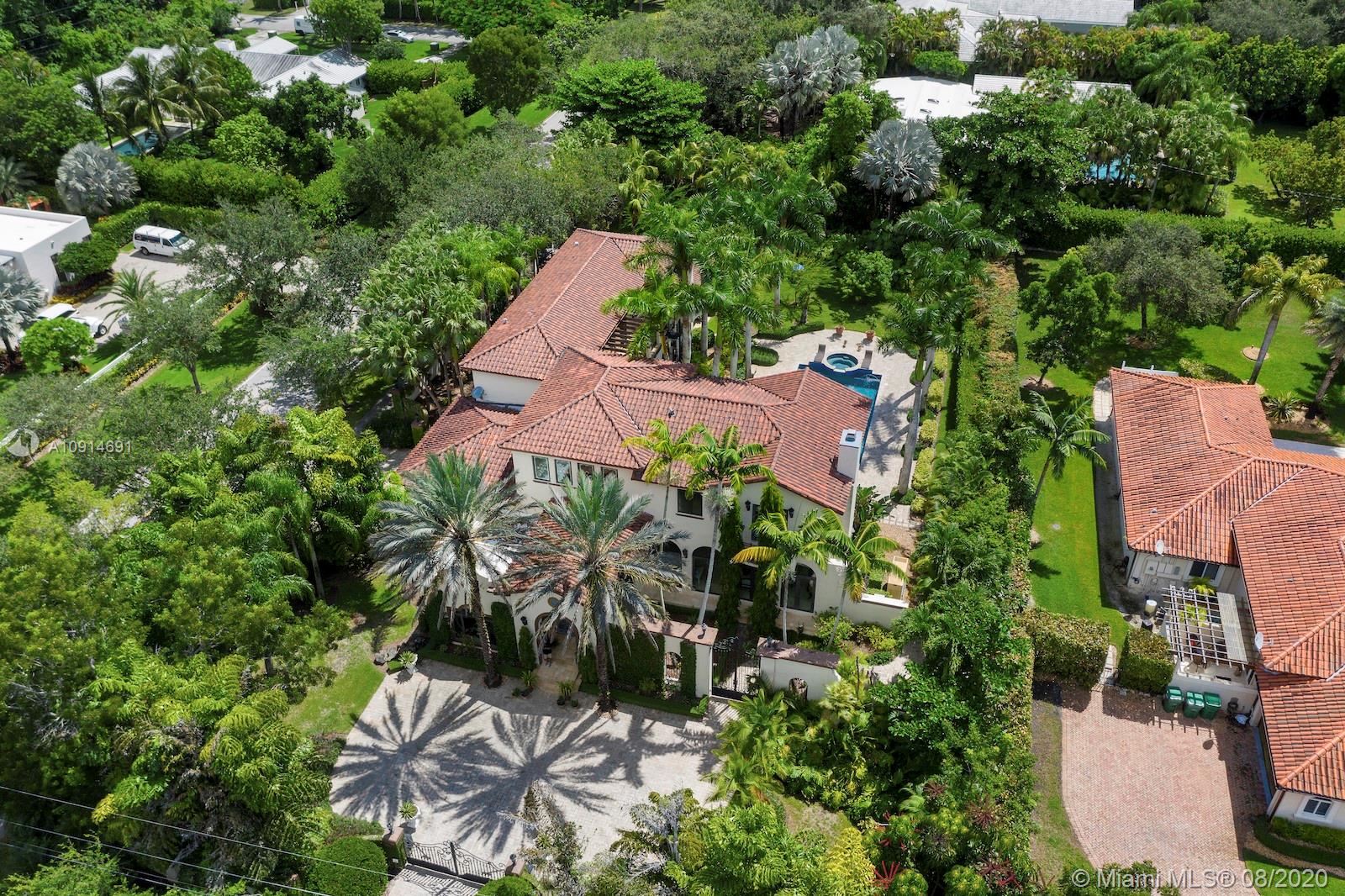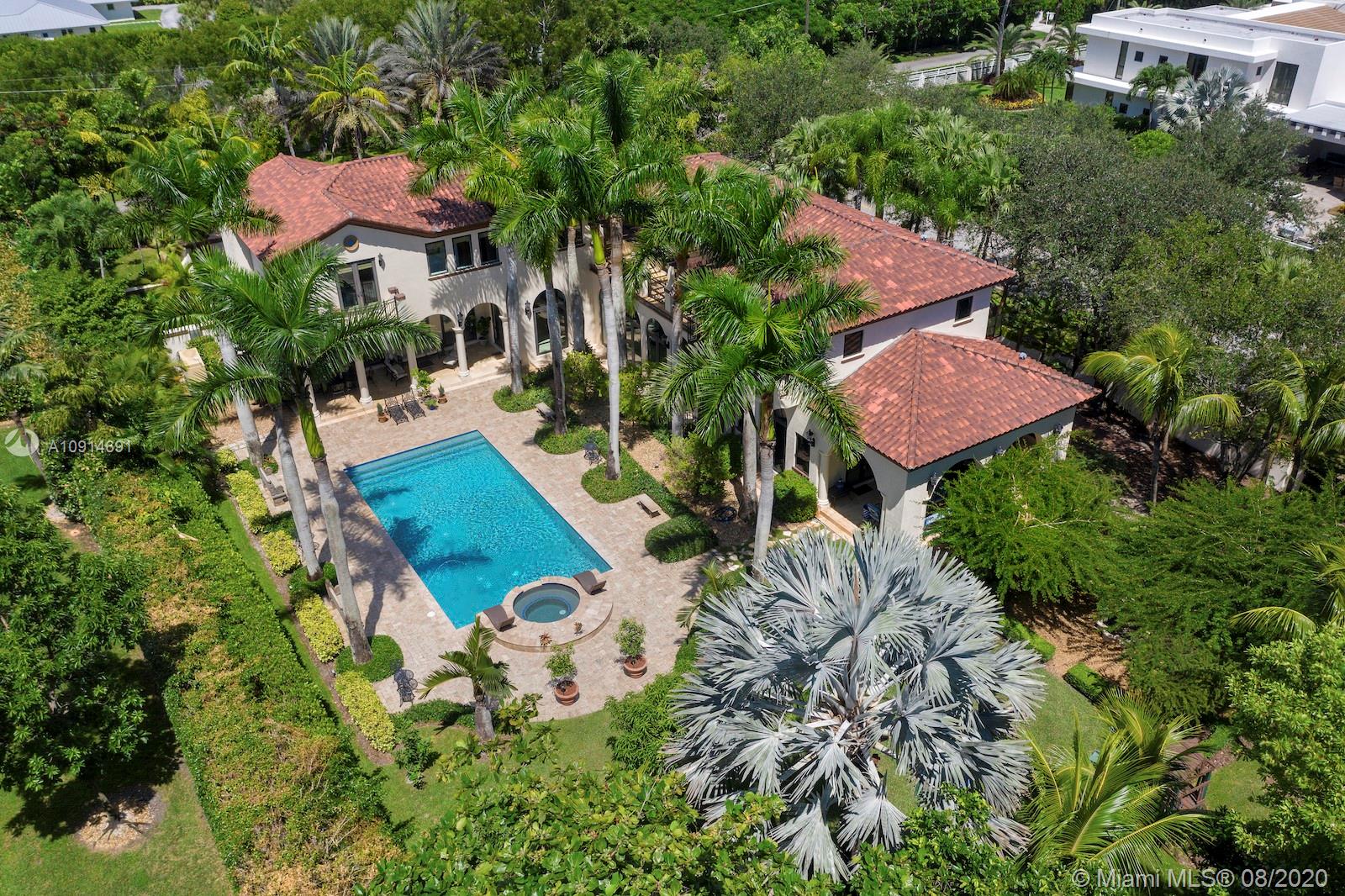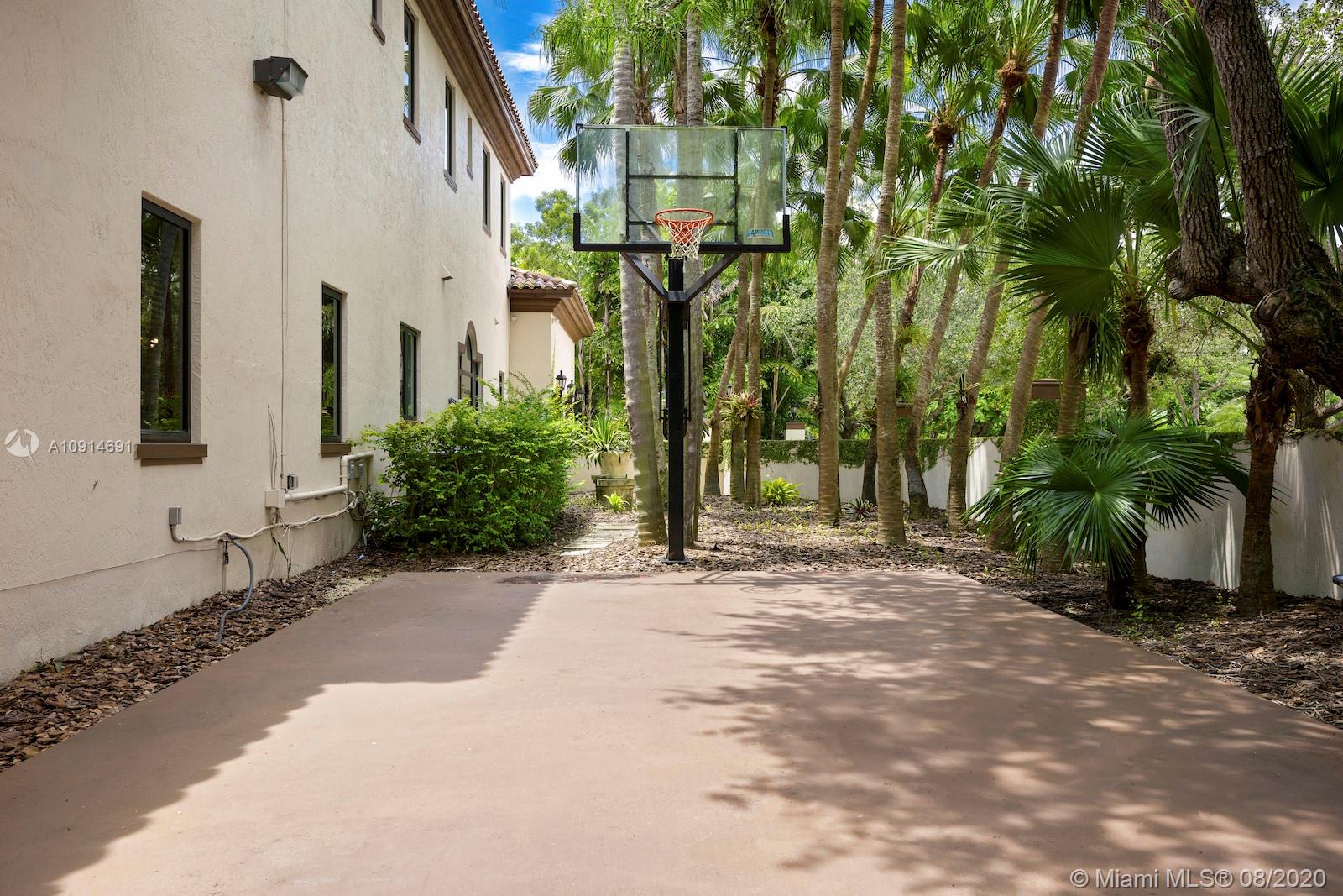 Prime corner home in Pinecrest, on nearly an acre lot. Stunning foyer entry & formal living room with high ceilings, glass doors letting in natural light & views of the Italian manicured garden & pool, a gas fireplace & built-in bar, a perfect setting for entertaining. The striking kitchen has double ovens, induction cooktop, large kitchen island, & elegant white marble with an eat-in counter & breakfast area. Master suite plus 3 ensuite beds on 2nd level, add’l room on 1st flr that could be a gym, office or in-law suite, with its own entrance. Serene backyard has summer kitchen, 2 covered areas, and sparkling pool with water feature.Gated front entry leads to motor court for guests, & the 2-car garage (room for lifts) at separate entrance around the corner. Generator. 1/2 court basketball