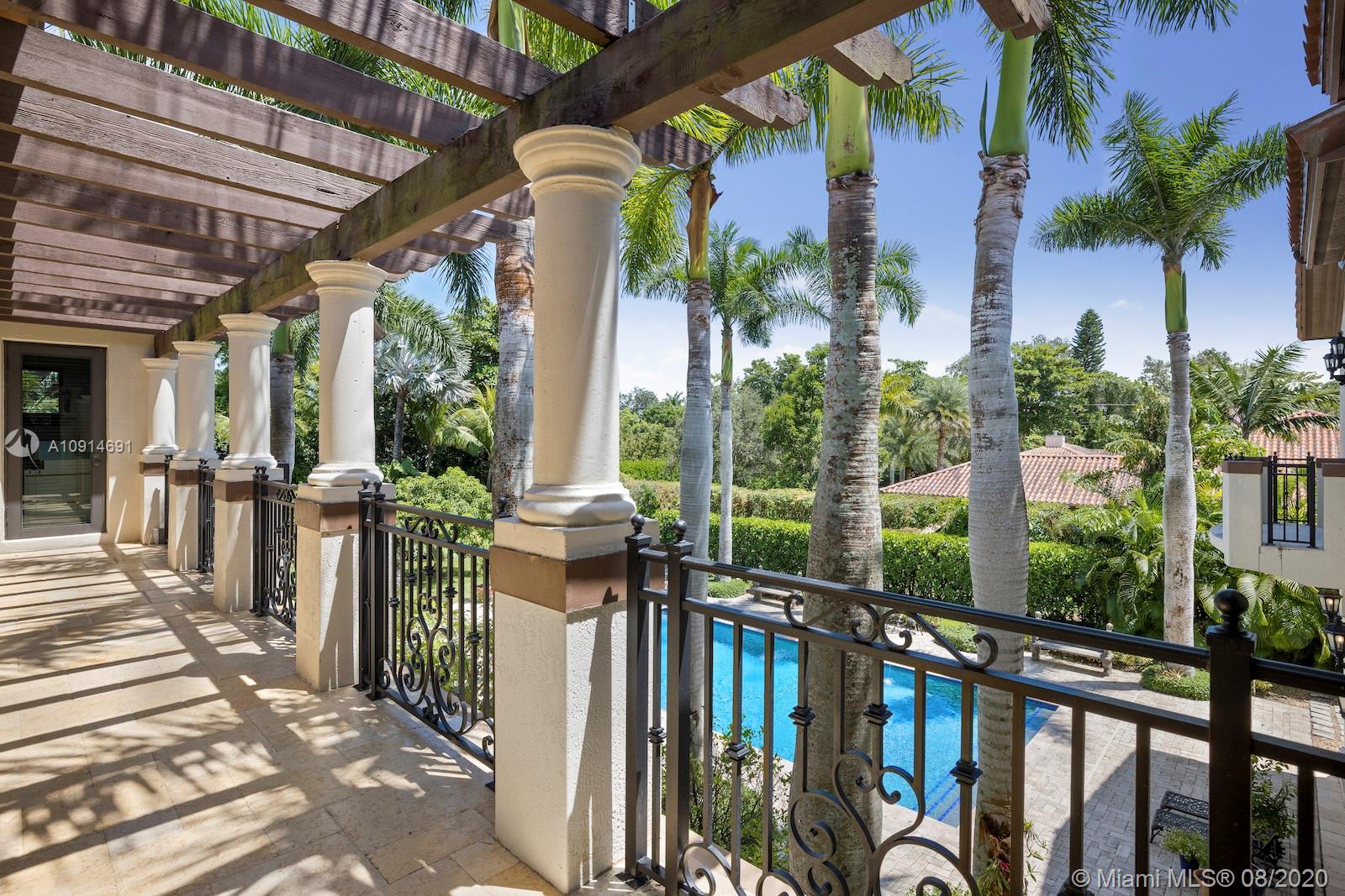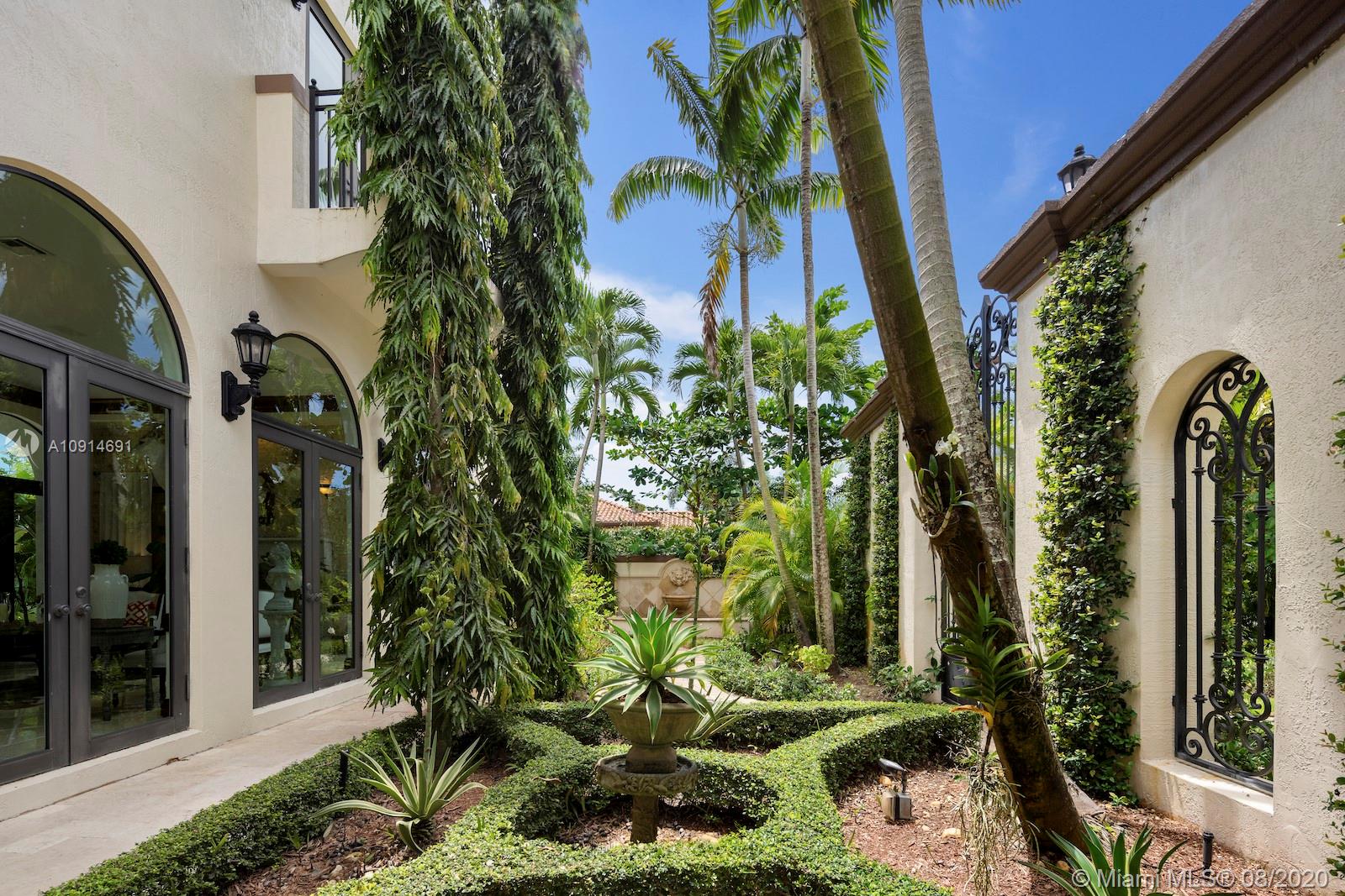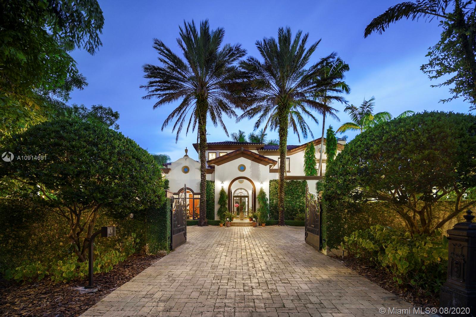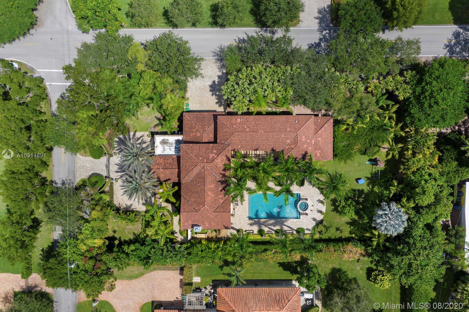 Prime corner home in Pinecrest, on nearly an acre lot. Stunning foyer entry & formal living room with high ceilings, glass doors letting in natural light & views of the Italian manicured garden & pool, a gas fireplace & built-in bar, a perfect setting for entertaining. The striking kitchen has double ovens, induction cooktop, large kitchen island, & elegant white marble with an eat-in counter & breakfast area. Master suite plus 3 ensuite beds on 2nd level, add’l room on 1st flr that could be a gym, office or in-law suite, with its own entrance. Serene backyard has summer kitchen, 2 covered areas, and sparkling pool with water feature.Gated front entry leads to motor court for guests, & the 2-car garage (room for lifts) at separate entrance around the corner. Generator. 1/2 court basketball