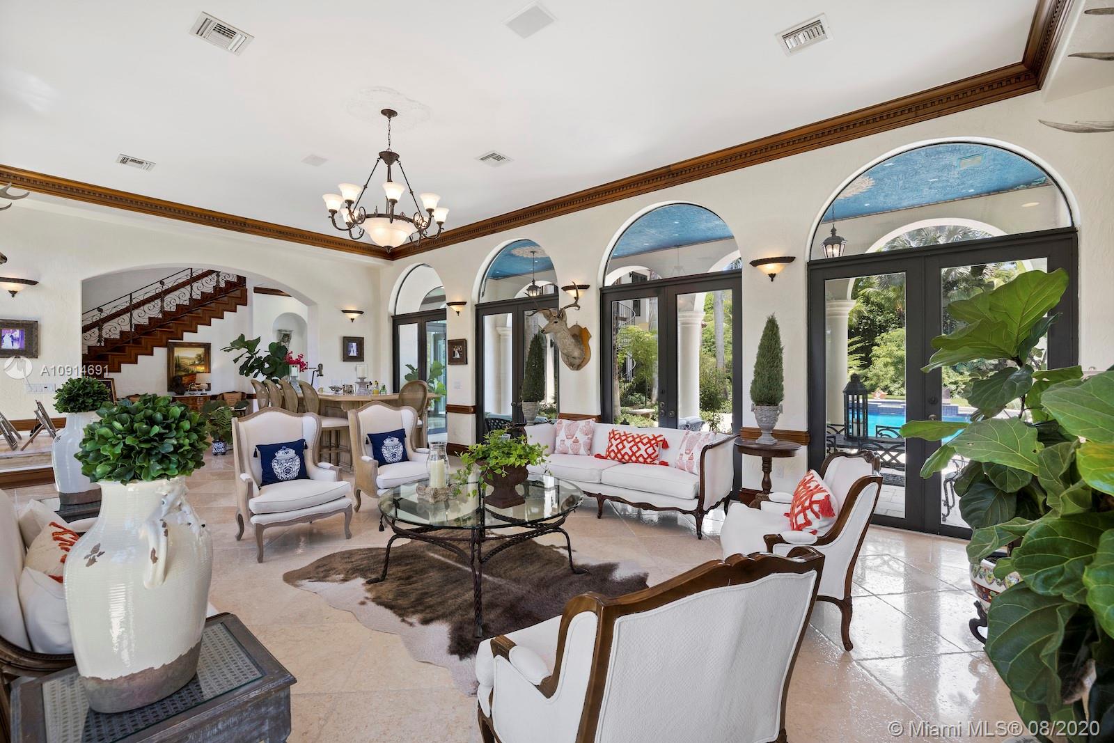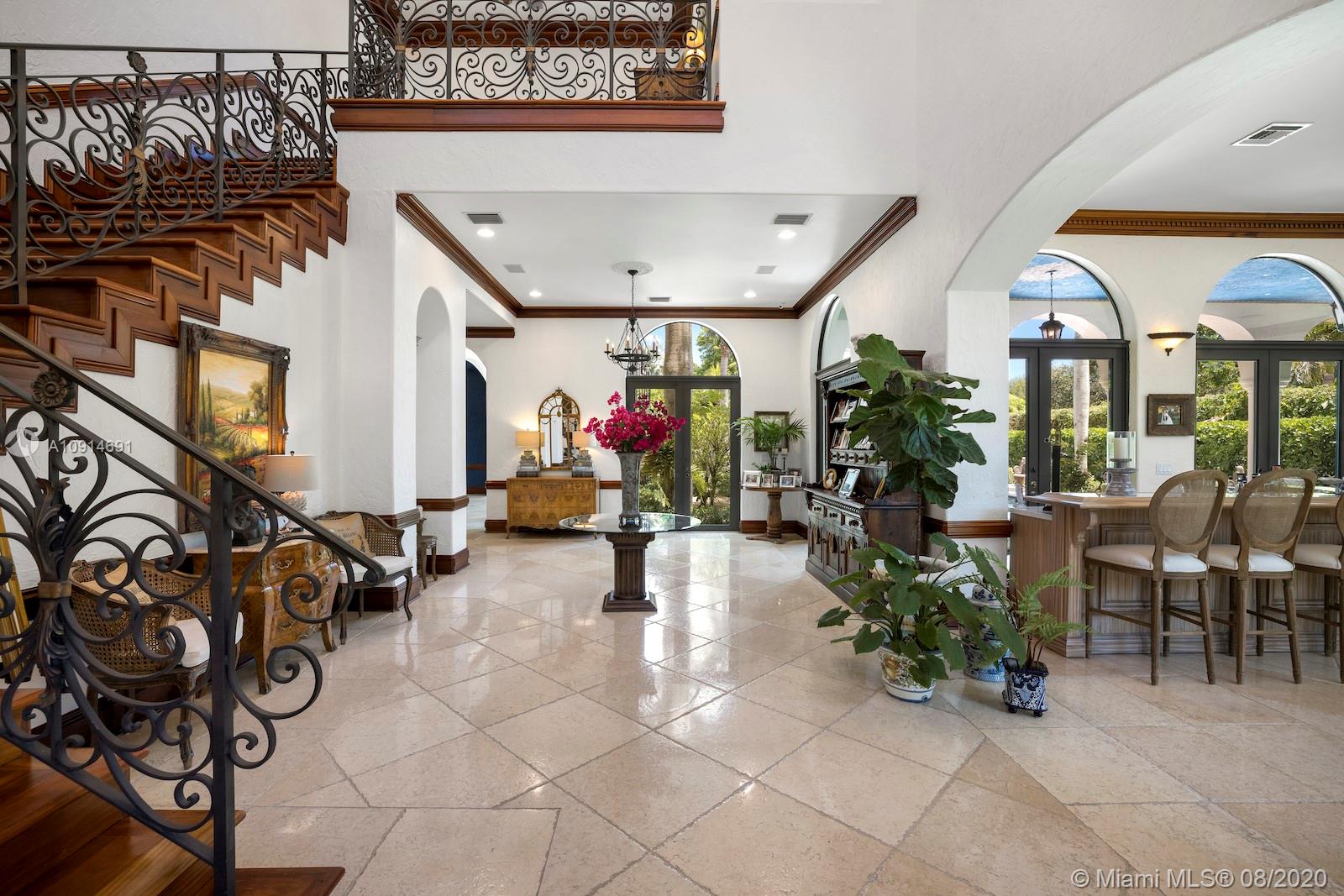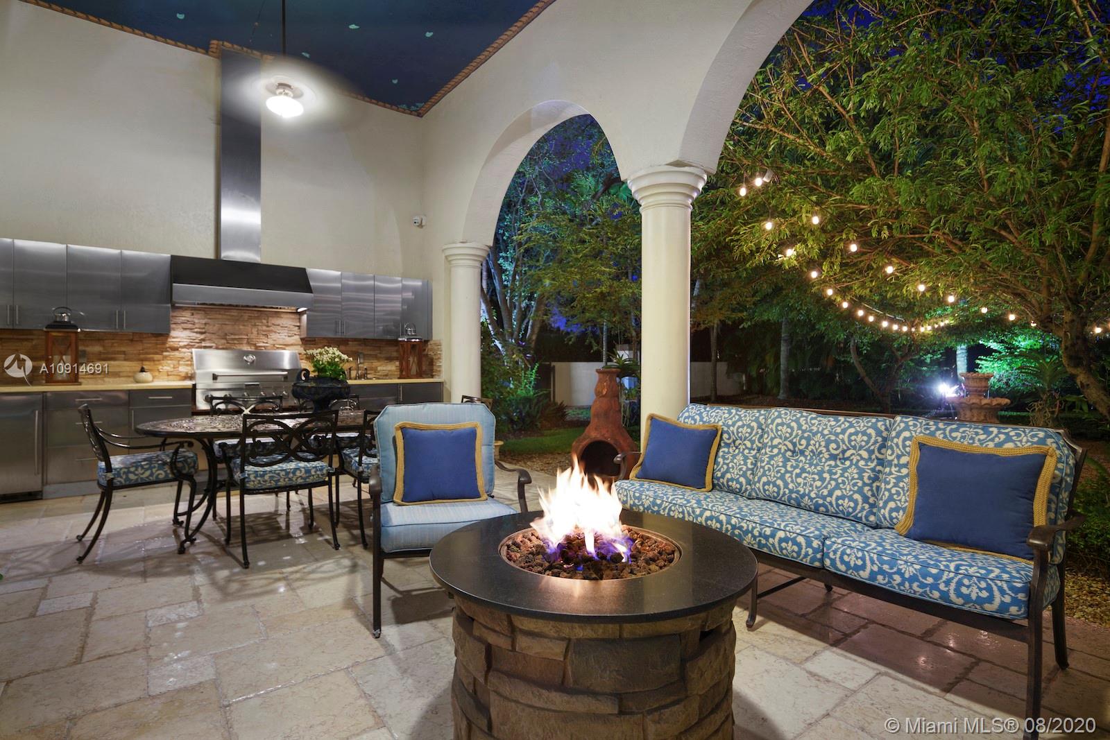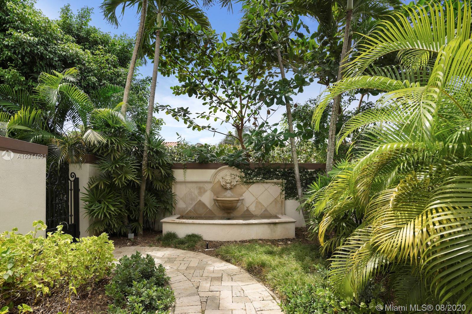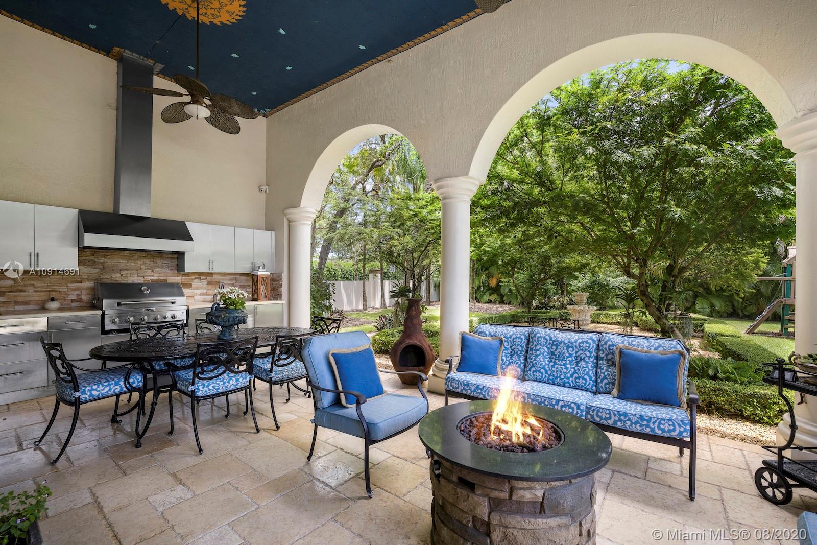 Prime corner home in Pinecrest, on nearly an acre lot. Stunning foyer entry & formal living room with high ceilings, glass doors letting in natural light & views of the Italian manicured garden & pool, a gas fireplace & built-in bar, a perfect setting for entertaining. The striking kitchen has double ovens, induction cooktop, large kitchen island, & elegant white marble with an eat-in counter & breakfast area. Master suite plus 3 ensuite beds on 2nd level, add’l room on 1st flr that could be a gym, office or in-law suite, with its own entrance. Serene backyard has summer kitchen, 2 covered areas, and sparkling pool with water feature.Gated front entry leads to motor court for guests, & the 2-car garage (room for lifts) at separate entrance around the corner. Generator. 1/2 court basketball