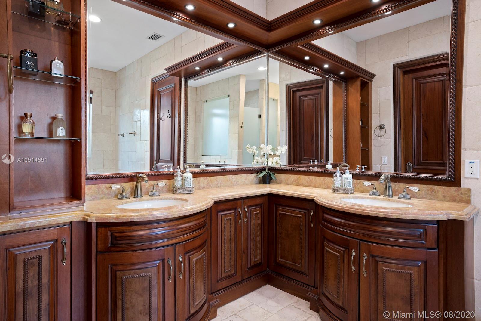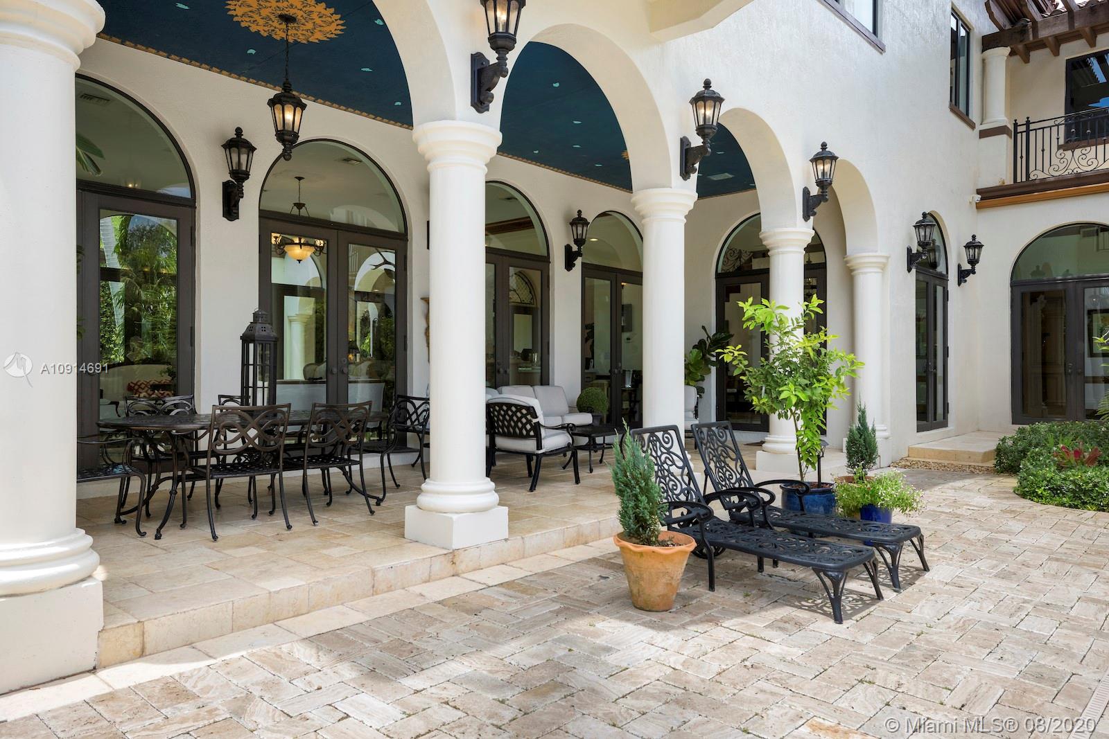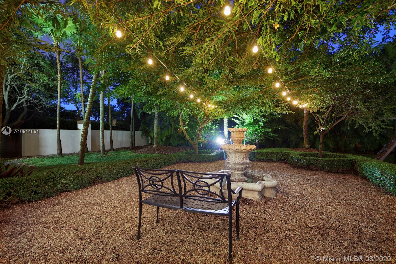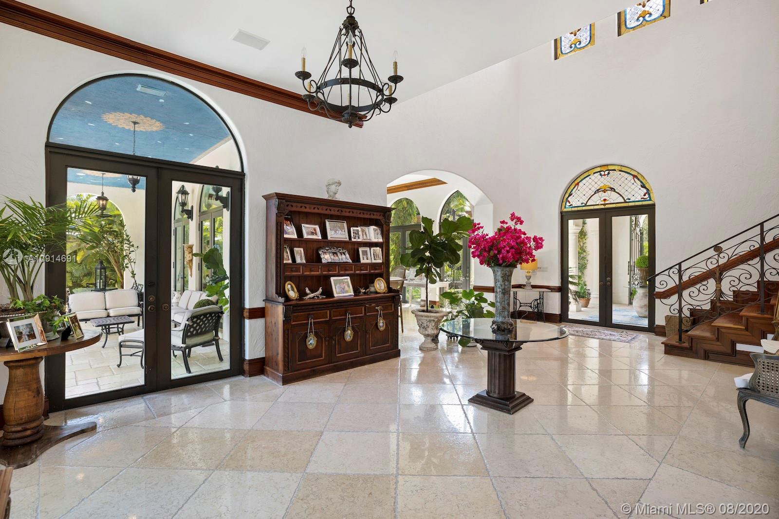 Prime corner home in Pinecrest, on nearly an acre lot. Stunning foyer entry & formal living room with high ceilings, glass doors letting in natural light & views of the Italian manicured garden & pool, a gas fireplace & built-in bar, a perfect setting for entertaining. The striking kitchen has double ovens, induction cooktop, large kitchen island, & elegant white marble with an eat-in counter & breakfast area. Master suite plus 3 ensuite beds on 2nd level, add’l room on 1st flr that could be a gym, office or in-law suite, with its own entrance. Serene backyard has summer kitchen, 2 covered areas, and sparkling pool with water feature.Gated front entry leads to motor court for guests, & the 2-car garage (room for lifts) at separate entrance around the corner. Generator. 1/2 court basketball