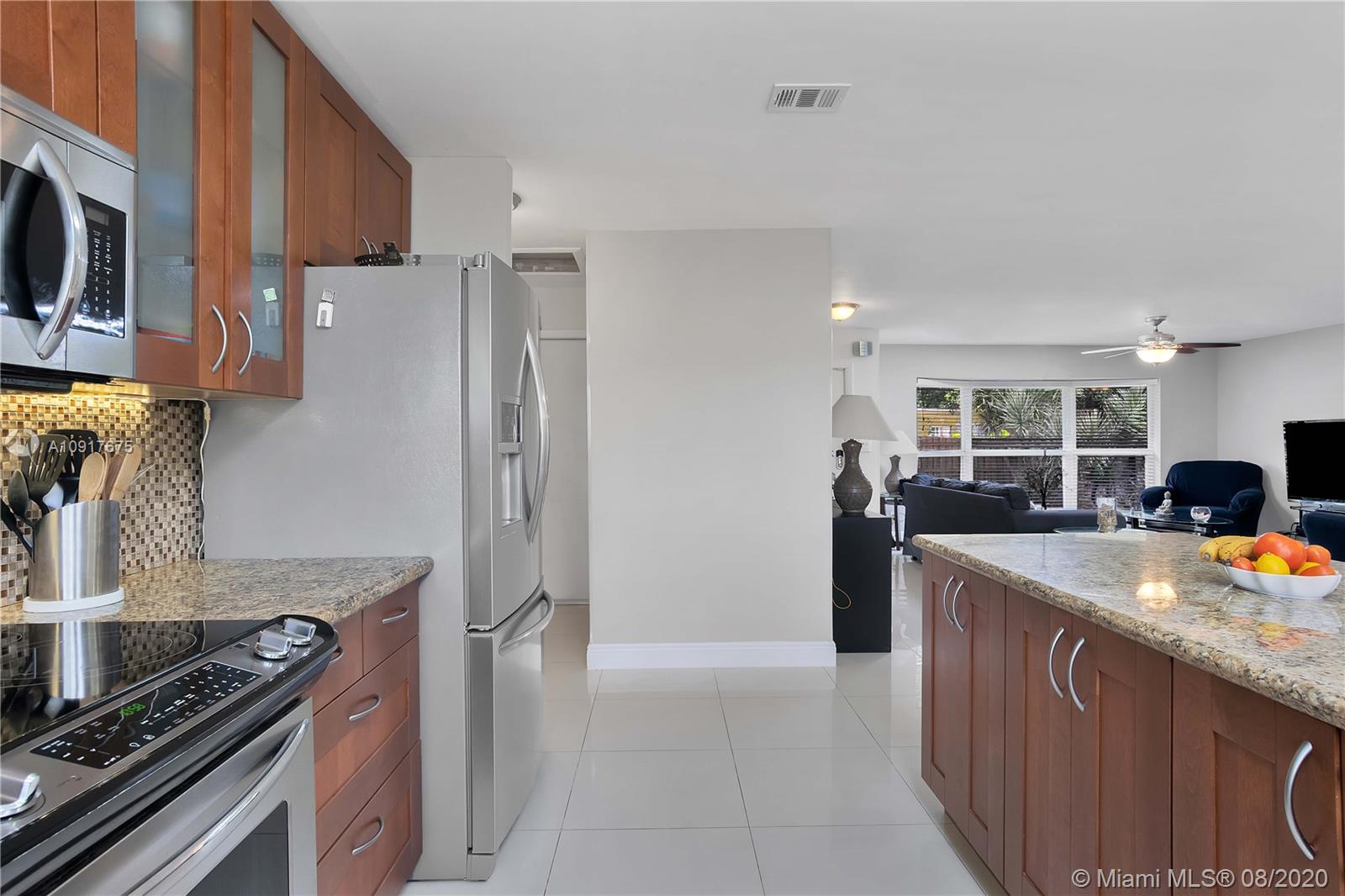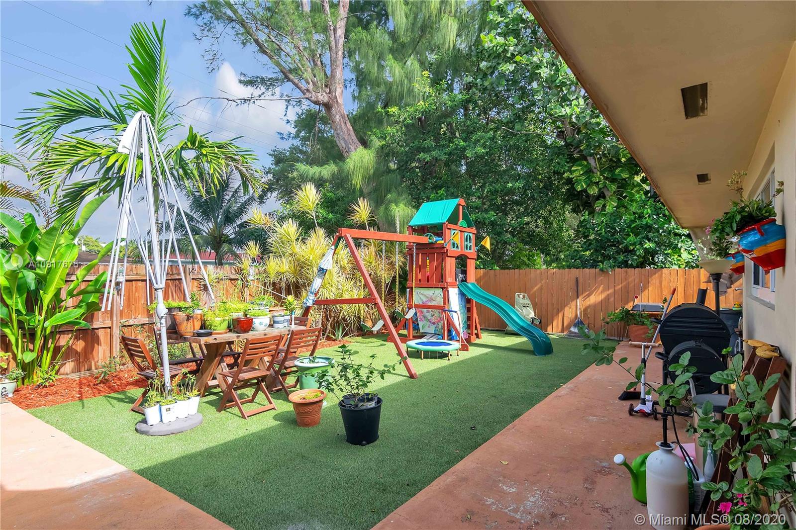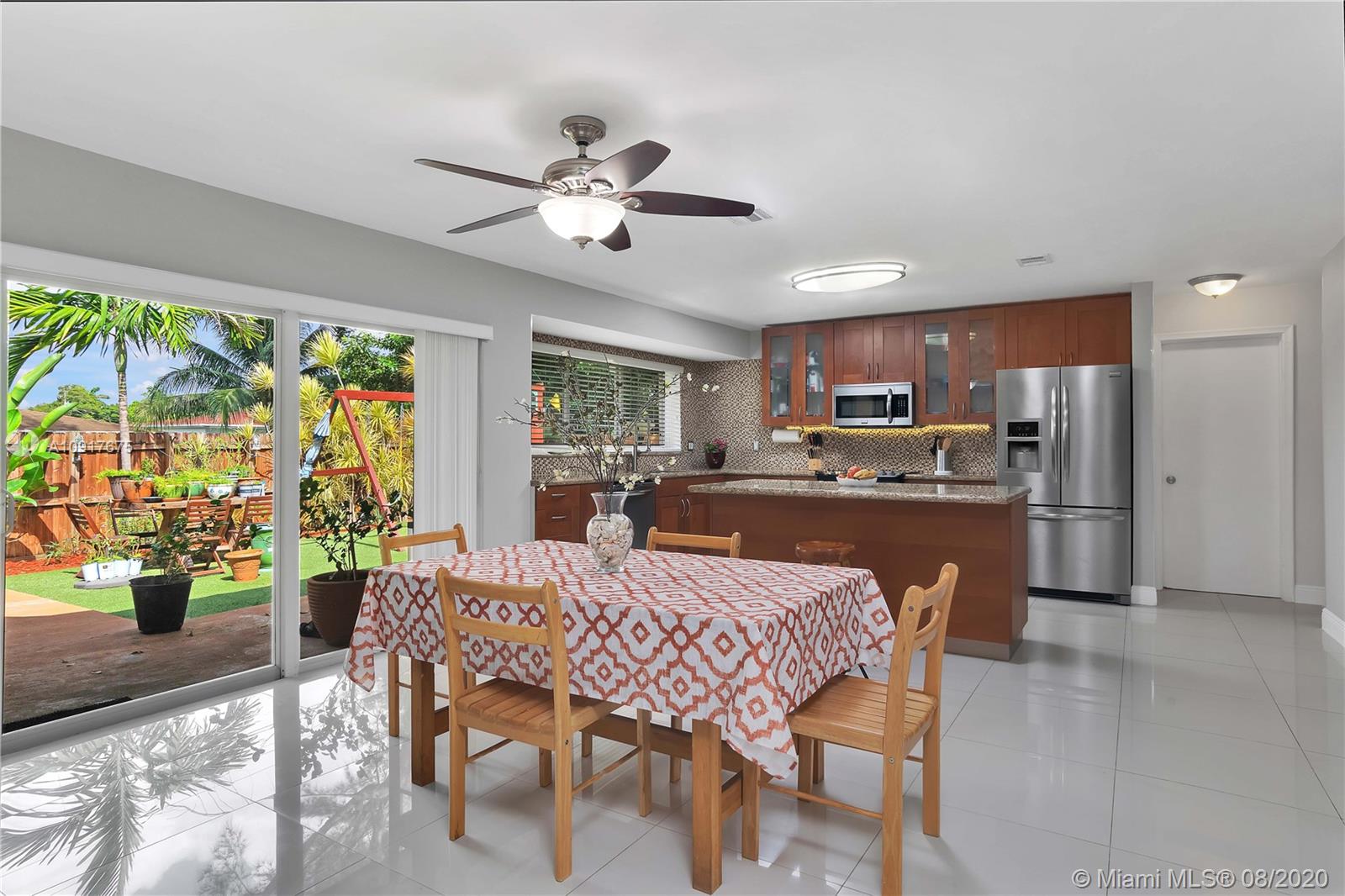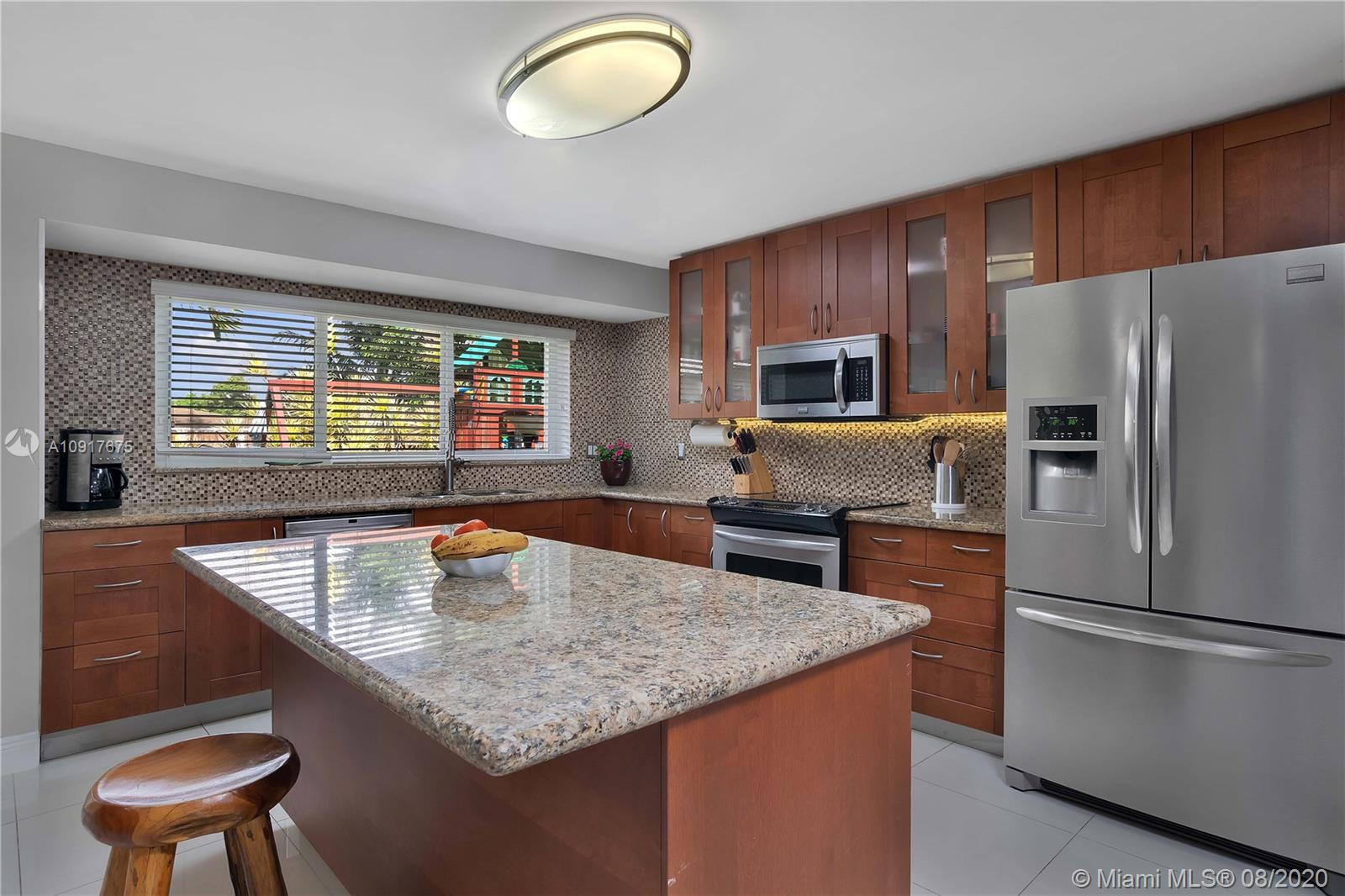 A Gem in Hallandale Beach. 4 bedroom, 3 bath with 2 car garage residence tucked away on a private and secluded road with low traffic. Move in Ready! Upgrades throughout include full replacement of roof in 2018, Impact window, Impact sliding doors, 2 master suites with sliding doors opening to the backyard, porcelain tile throughout, split floor plan bay windows in the living room. Open layout kitchen with stainless steel appliances, mosaic tile backsplash, granite countertops, custom pantry lots of storage and an island great for entertaining, formal dining room. Kids playground and wooden backyard table will stay. Just minutes from the Beach, Gulfstream Park & Casino, Aventura and Major Highways.