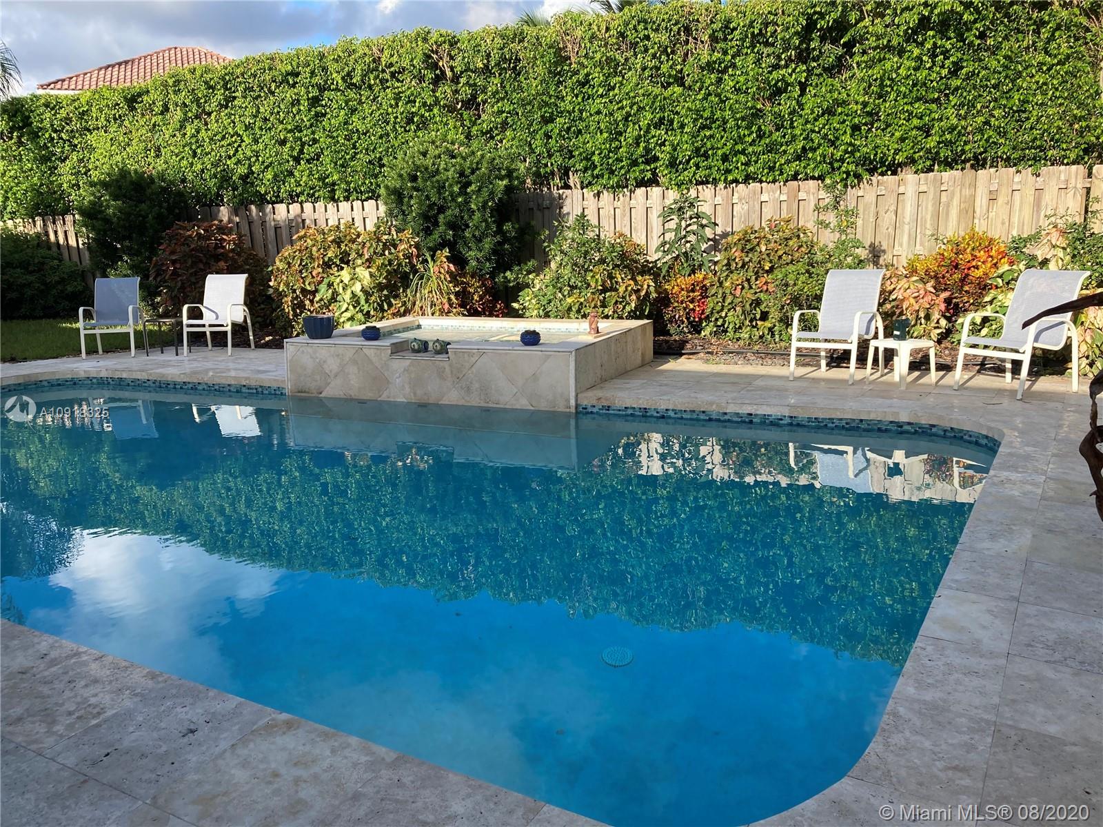 Elegantly updated, open, light and bright 4/2.5 one story pool home at small prestigious 24-hour man gated Coco Plum Estates in Jacaranda Country Club. The home features truly open floor plan in all living areas, formal living and dining rooms and large comfortable family room facing the outside porch. The home is full of natural light. It has marble, tile and carpeted floors, vaulted ceilings a working fire place and loads of closet place. Kitchen cabinets are custom made cream color wood with granite counter tops and high quality LG and GE Profile appliances and an multipurpose island. There is a huge covered porch that faces the sparkling pool and spa. Home is totally fenced in for perfect privacy. Coco Plum Estates is a small, beautifully manicured community. Show with pride.