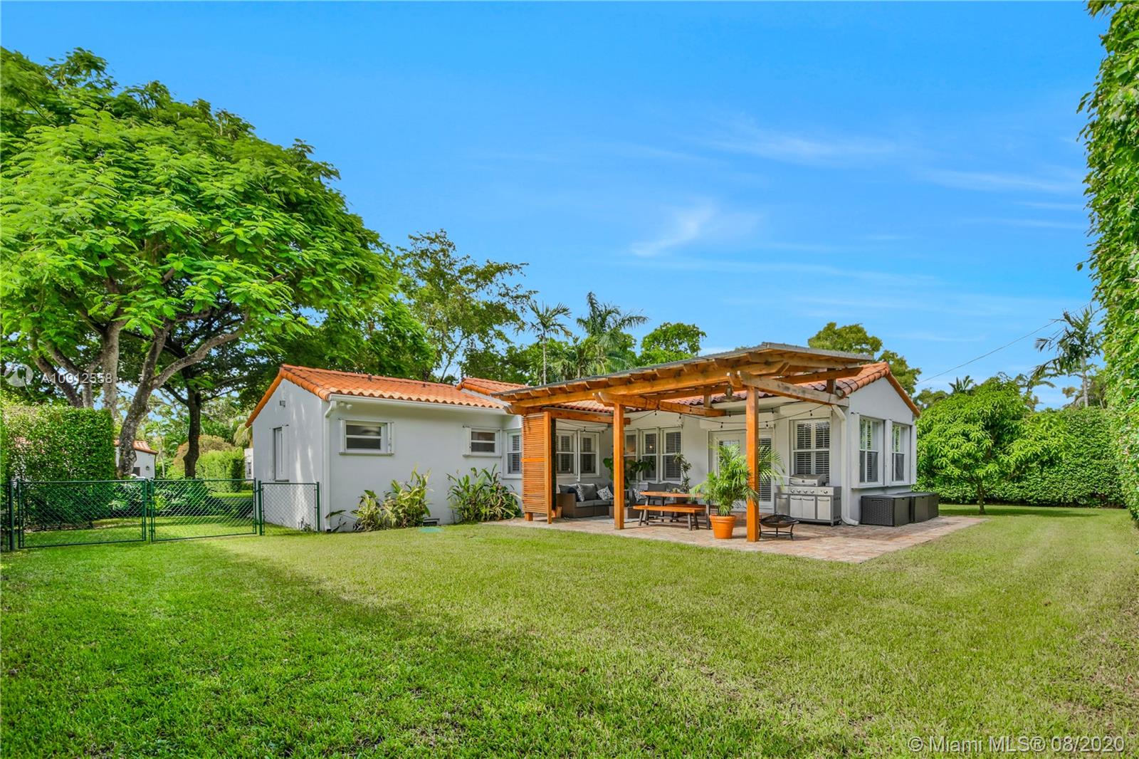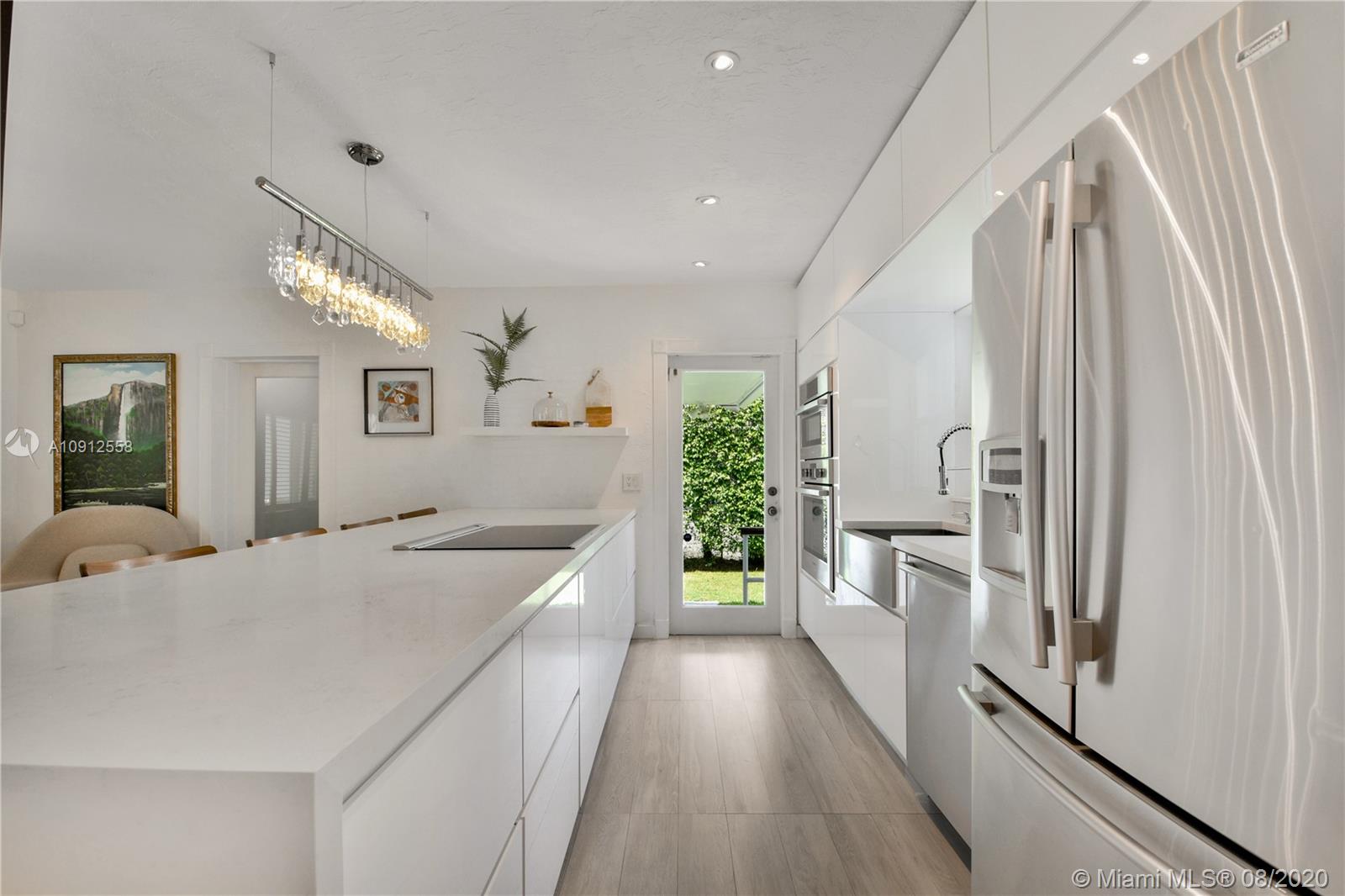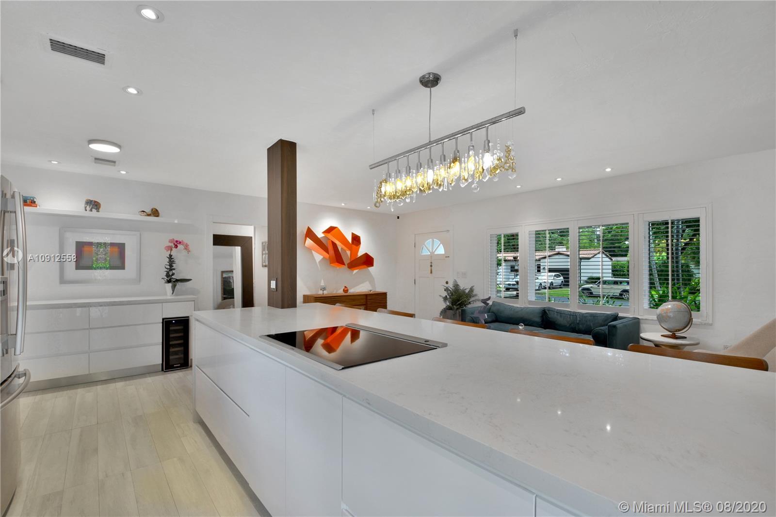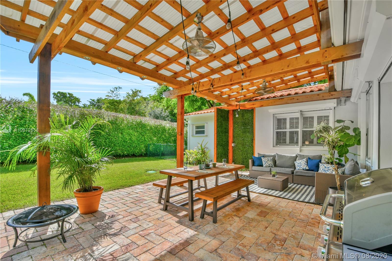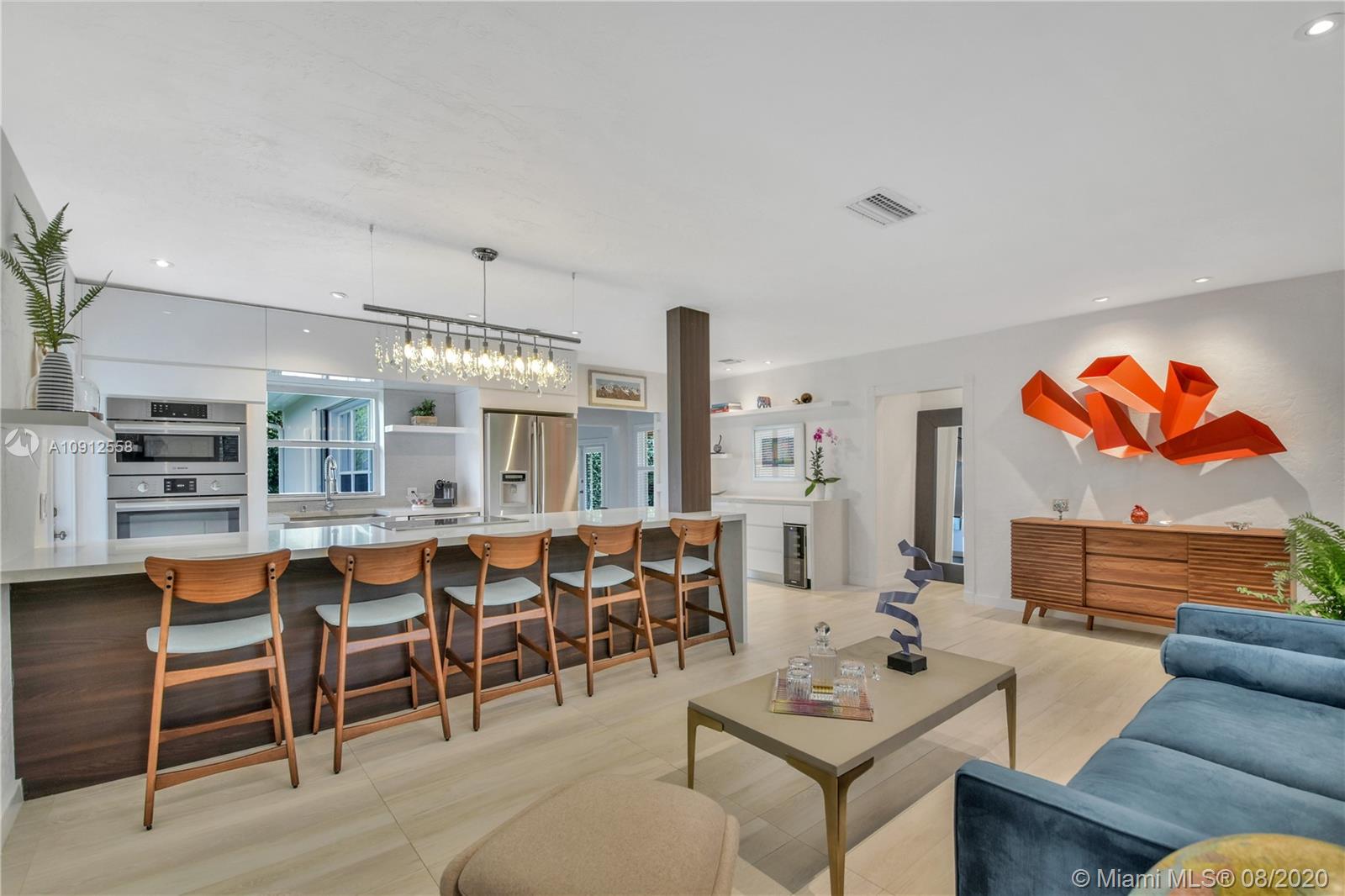 This elegant and lovely Mediterranean/Modern home sits on a quiet dead end tree-lined street in the heart of Coral Gables. The seamless spacious floor plan is truly amazing, with lots of natural bright light shinning throughout. Exquisitely remolded with Italian porcelain tile across all rooms with a state-of-the-art kitchen, which includes top of the line Bosch oven, microwave, cook-top, and downdraft. White cabinetry and a 12-ft quartz island with a waterfall finish, including a stainless steel farmhouse sink, while the kitchen sidebar includes a wine fridge. Enjoy your private and delightful oasis of tropical landscaping for relaxing and entertaining under your beautiful natural cedar wood pergola. Close to Miracle Mile, which is filled with world class restaurants and art galleries.