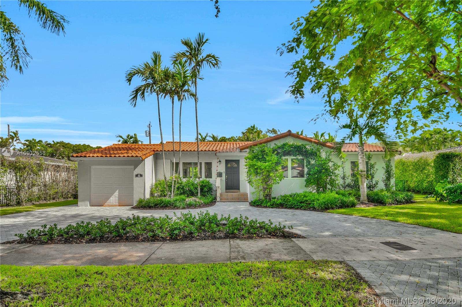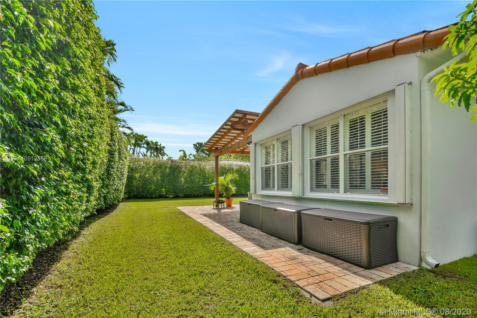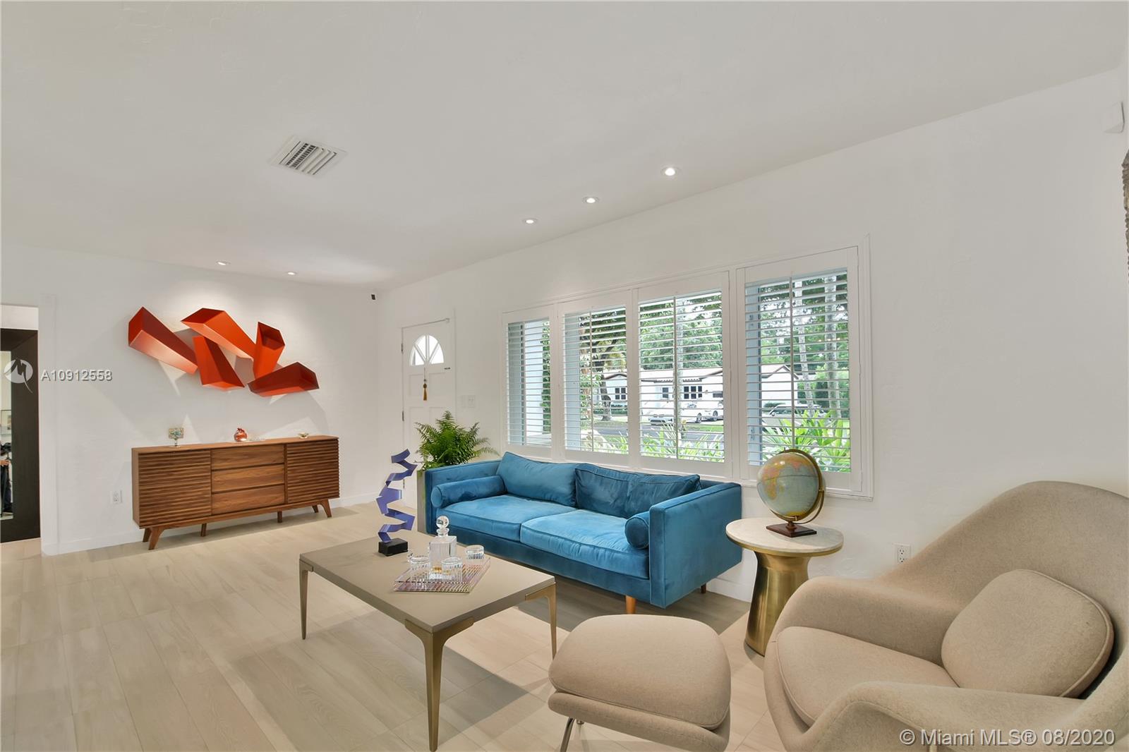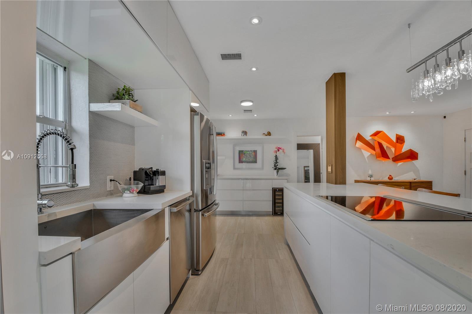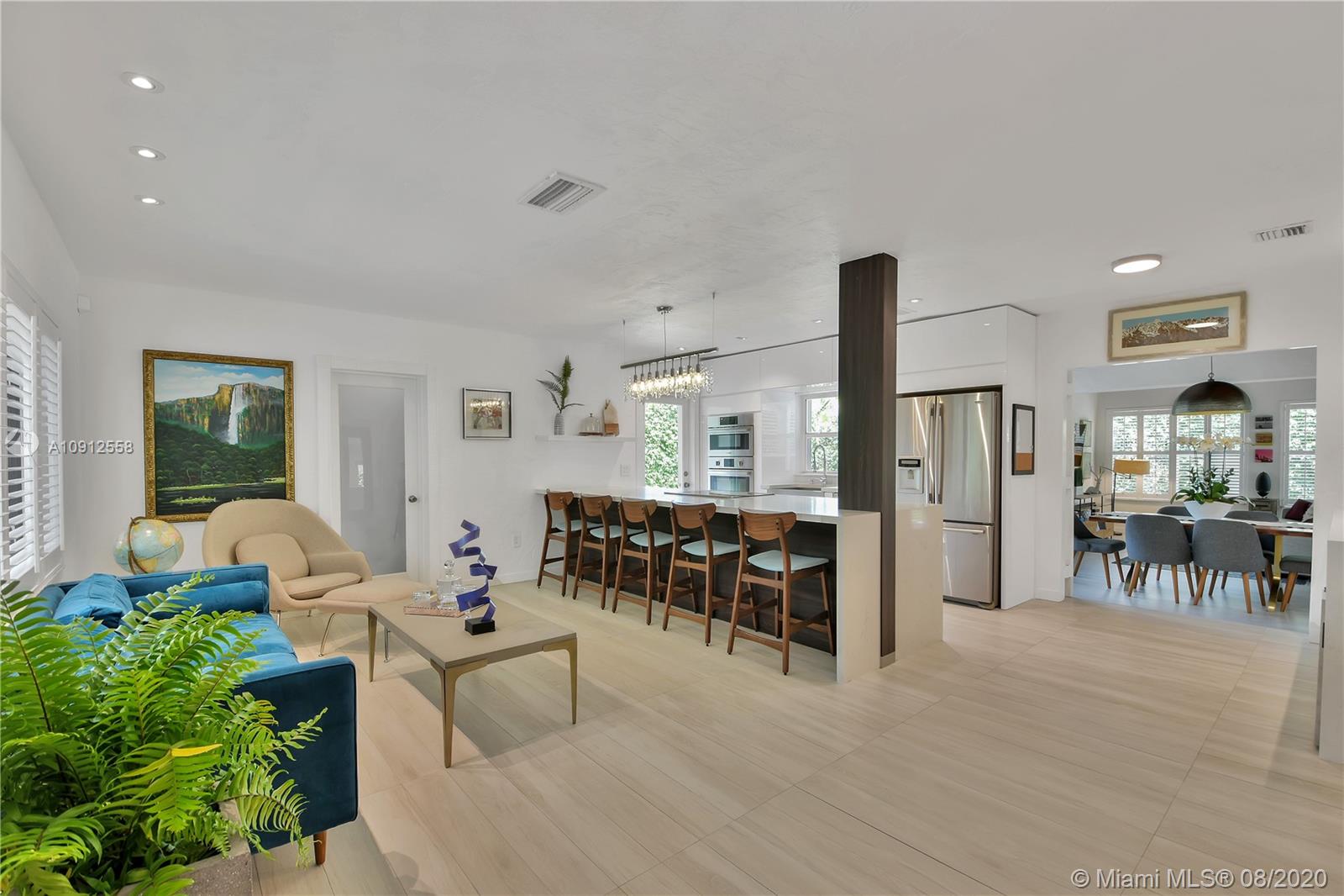 This elegant and lovely Mediterranean/Modern home sits on a quiet dead end tree-lined street in the heart of Coral Gables. The seamless spacious floor plan is truly amazing, with lots of natural bright light shinning throughout. Exquisitely remolded with Italian porcelain tile across all rooms with a state-of-the-art kitchen, which includes top of the line Bosch oven, microwave, cook-top, and downdraft. White cabinetry and a 12-ft quartz island with a waterfall finish, including a stainless steel farmhouse sink, while the kitchen sidebar includes a wine fridge. Enjoy your private and delightful oasis of tropical landscaping for relaxing and entertaining under your beautiful natural cedar wood pergola. Close to Miracle Mile, which is filled with world class restaurants and art galleries.