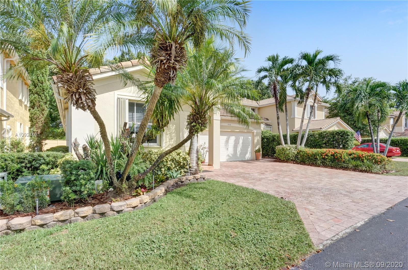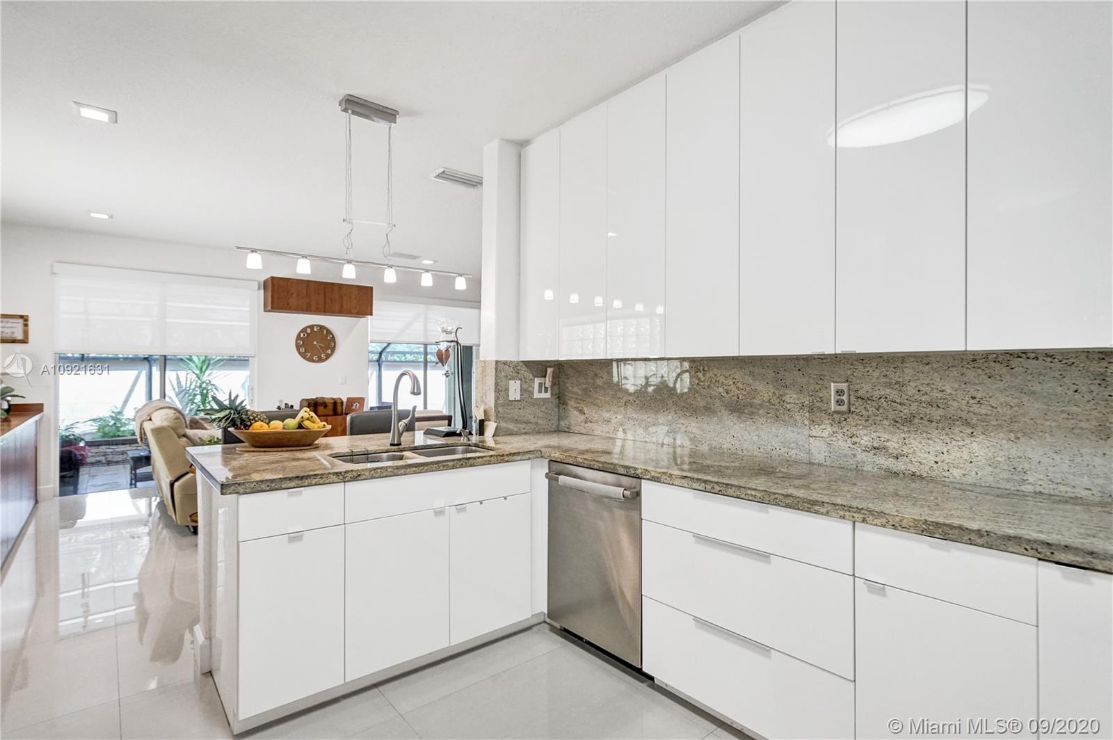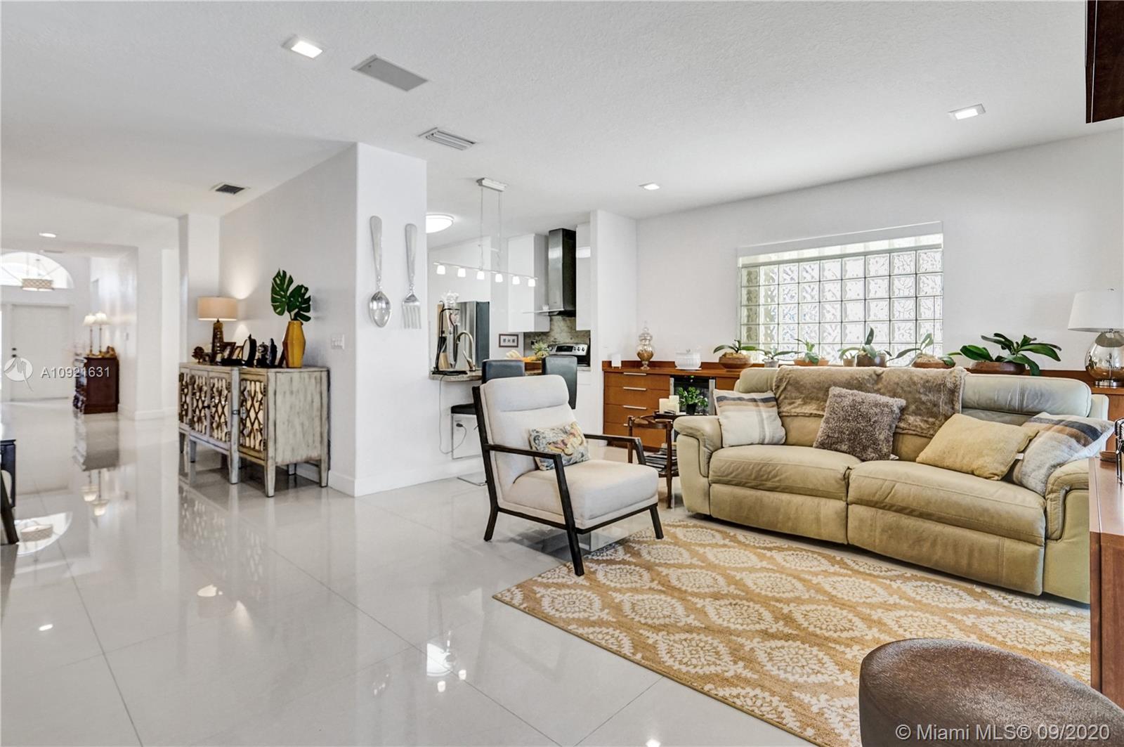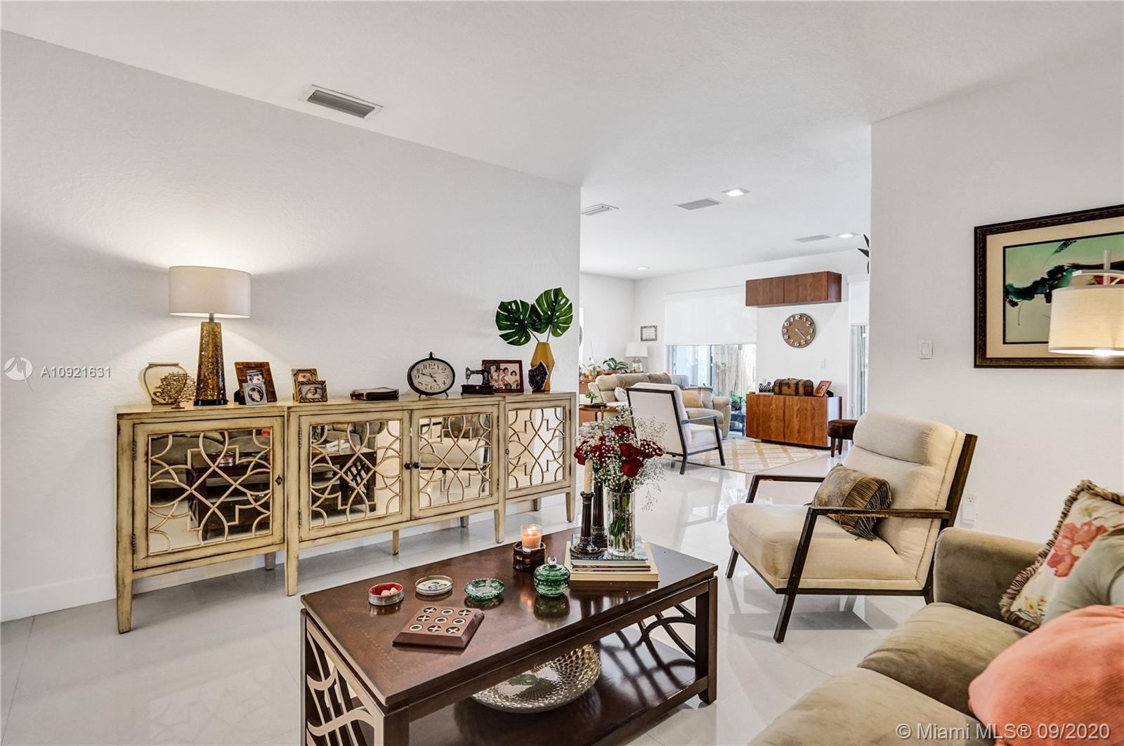 Charming one story home situated in a quiet gated community of Goldvue at Doral. NO NEIGHBOR in the back. Featuring 4 bedrooms 3 baths, 2 car garage + driveway for 2 more cars. Exquisite remodeled home with upgraded kitchen with stainless steel appliances, cover screen terrace. Low maintenance fee includes 24 hours security, common areas, basic cable, alarm monitoring, community pool.
