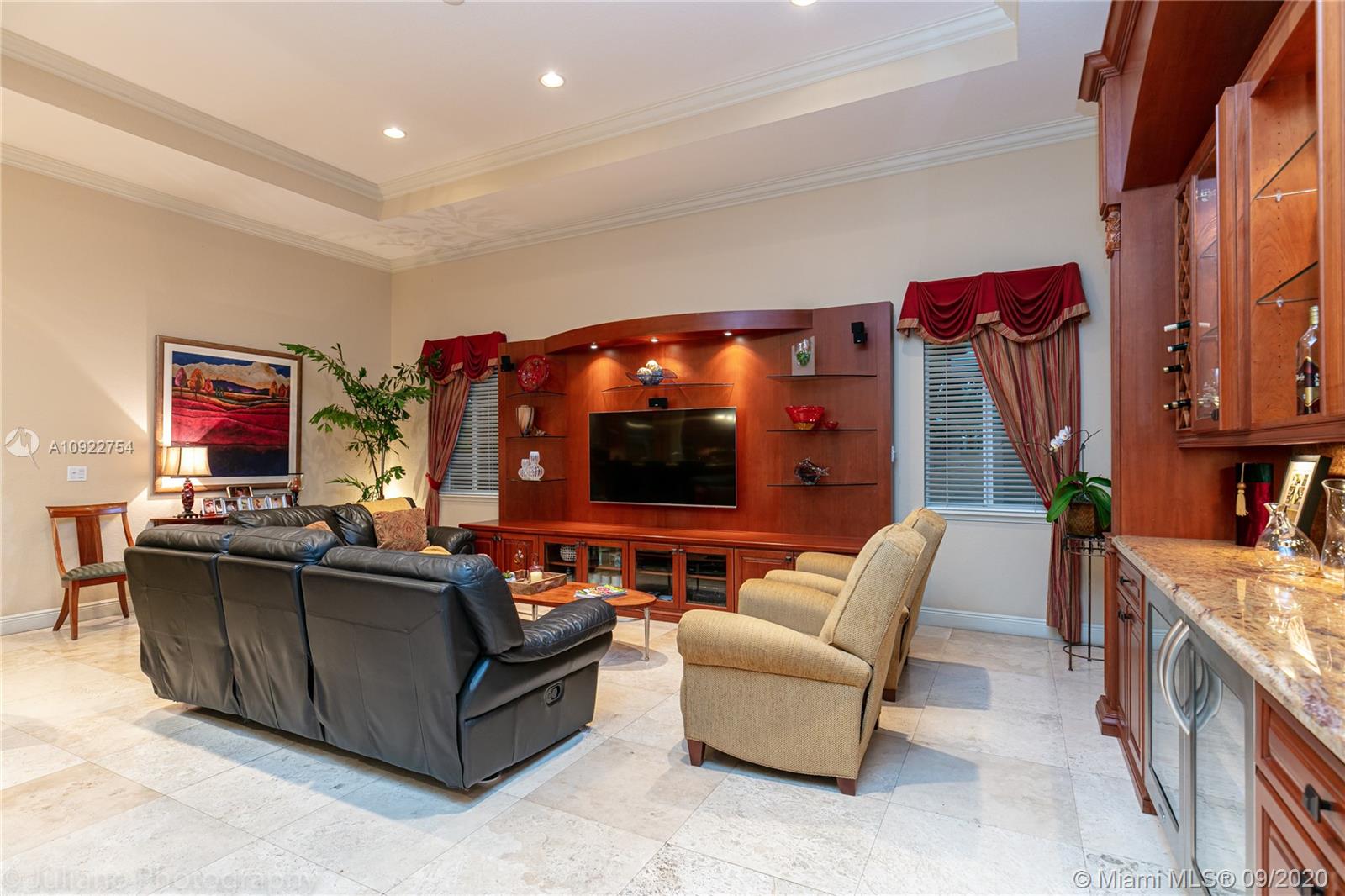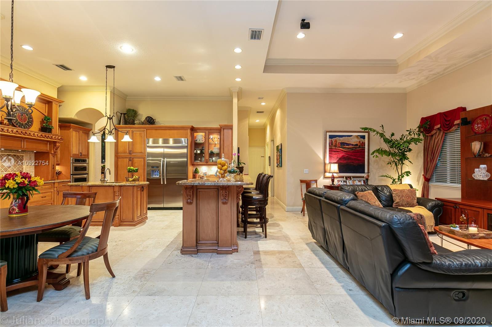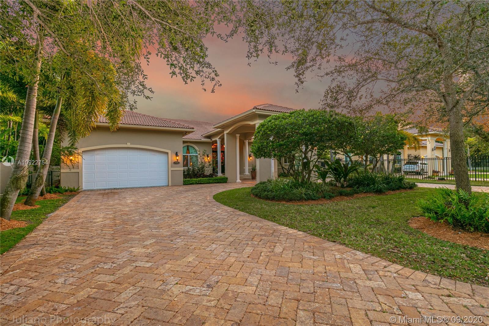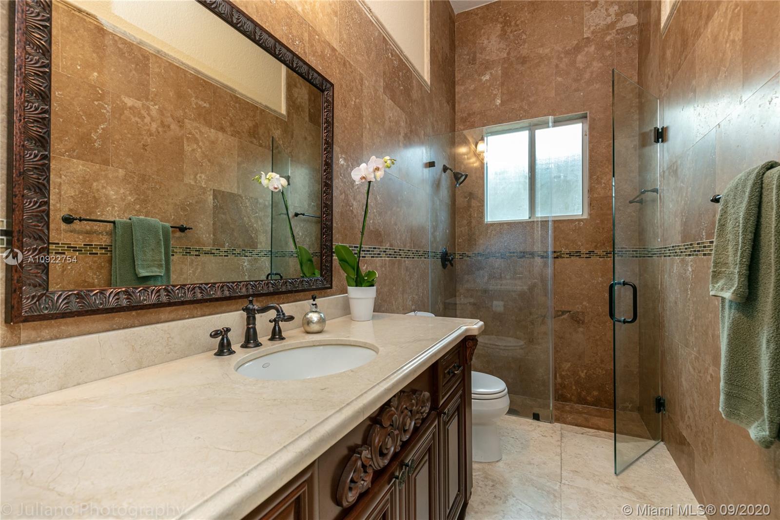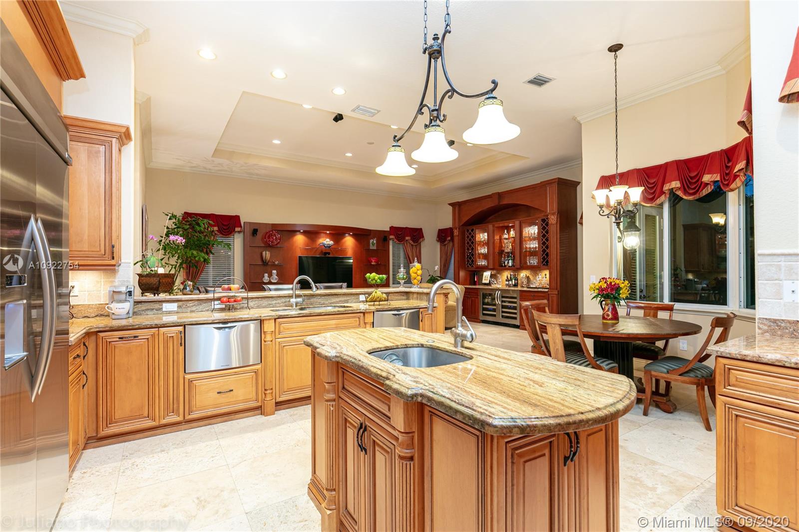 Priced to sell: One story Pinecrest estate with superb details!. Custom built by owners in 2007, first time on market. Mediterranean style 5/4, 2 car garage, soaring tray ceilings, travertine floors throughout, impact windows & doors, porte de cochere, free-form pool with cascade, all on lush 17K lot with fruit trees. This is THE perfect home for a family who loves to entertain! Spacious kitchen has custom built solid wood cabinets, S/S appliances 2 dishwashers, double sinks. It opens to FL room with built-in bar & TV wall unit. Inviting large master suite has his/her walk-in closets, vanities, jacuzzi + shower, it overlooks the gorgeous pool & backyard. Surround sound system inside and in patio remain. USE SHOW ASSIST, 24 hours notice a must. Bring your pickiest buyer, this home is a gem!
