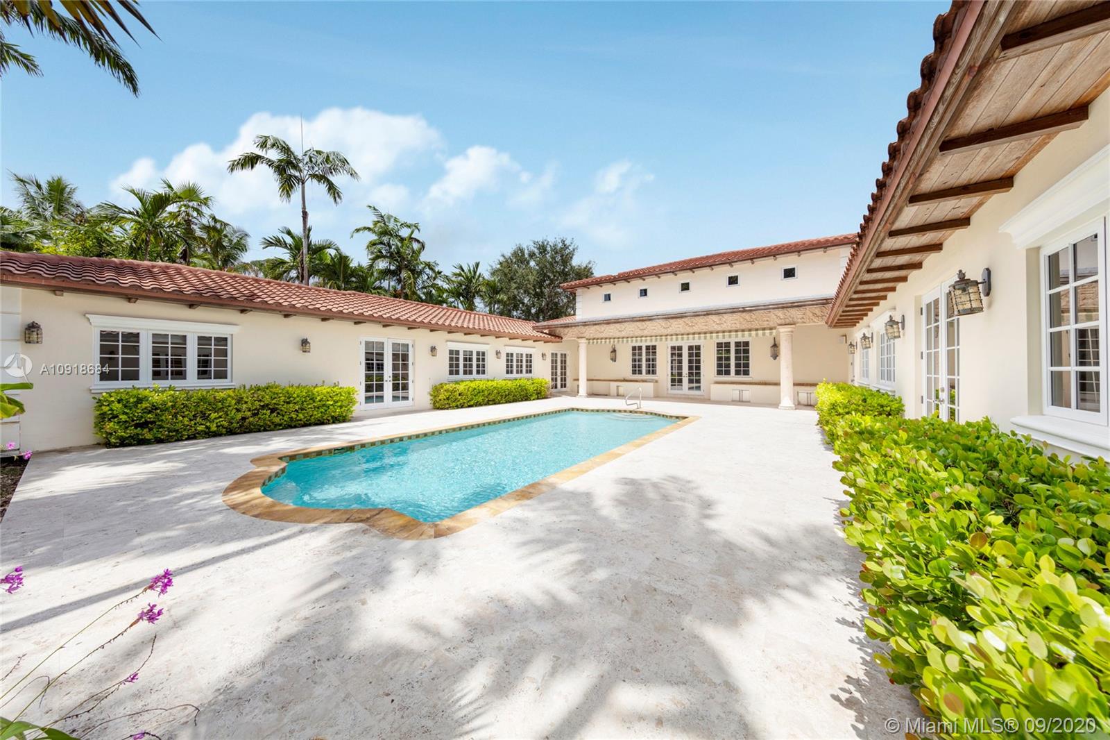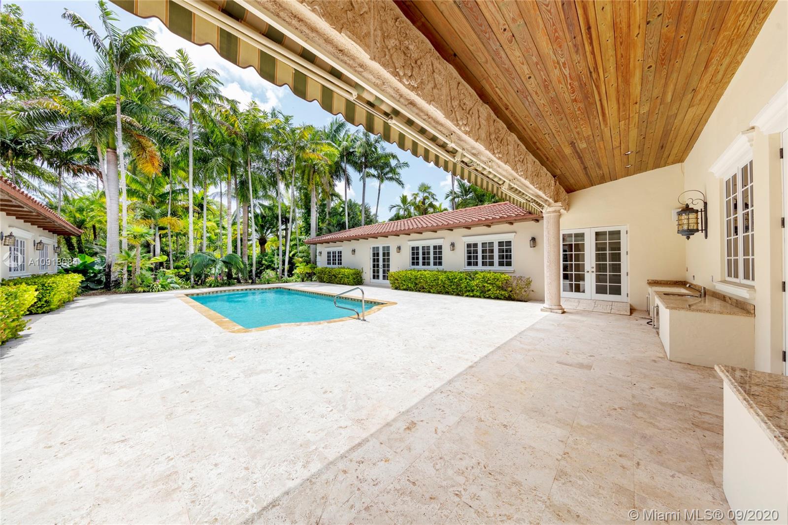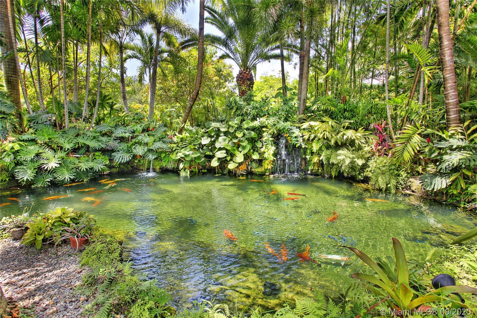 One-story home on a deep gated acre located on a top street close to the best schools and a great lifestyle. Perfect for large or extended families. Two separate wings each include a master bedroom, additional bedrooms, bonus rooms, laundry rooms, and 2 car garages. Large living room with 24’ ceilings. Library and office with custom built ins, family room and dining room. Everyone will gather in the real cook’s eat-in kitchen. The home is built around a large pool with summer kitchen and great outdoor spaces for family fun. Serene pond with Koi, running waterfall, and lush landscaping. Room for a Tennis Court and space for other great outdoor possibilities. Live-in quarters with separate entrance. Whole house generator. All impact windows & doors. A must see! Some photos virtually staged.