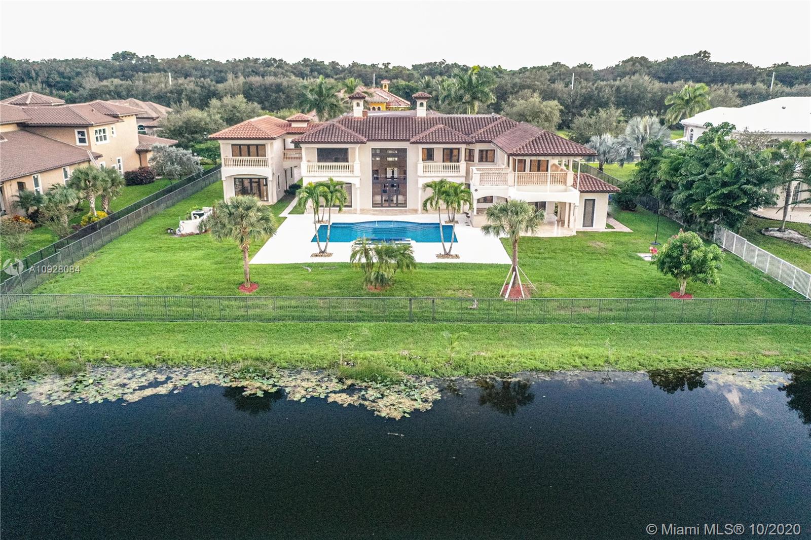 Elegant custom built lakefront home with a 2 story guesthouse in exclusive, GRAND OAKS ESTATES! A stunning 10,395 SqFt estate, featuring a breathtaking foyer entrance with 2 statement staircases and a fireplace. Spacious kitchen with stainless steel appliances, large island for seating while overlooking the family room. Second floor master suite features private balcony, modern finishes and custom closets. Chic oversize salt water pool with jacuzzi & waterfall features along with a covered patio showcasing the summer kitchen. Guesthouse features family room & kitchen along with 2 bedrooms. Control 4 automation system, LED lighting, space for an elevator, impact windows & doors, 2 car garage with double-entrance driveway that can accommodate up to 20 cars. Gated entrance with tennis court.