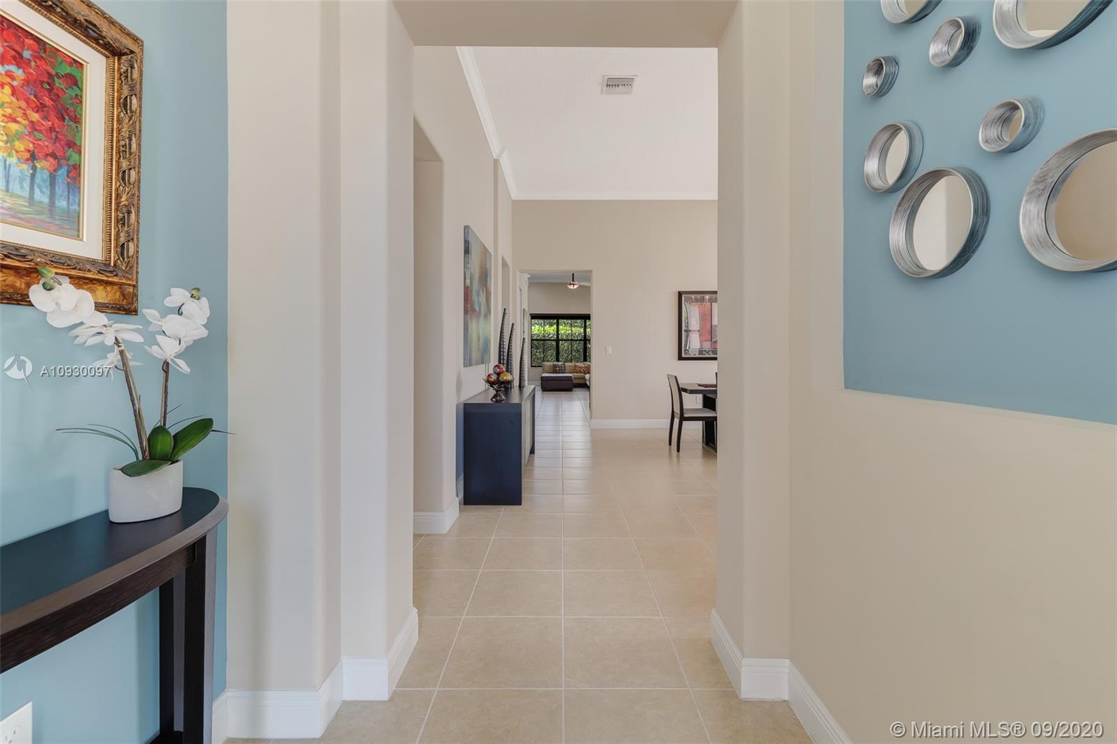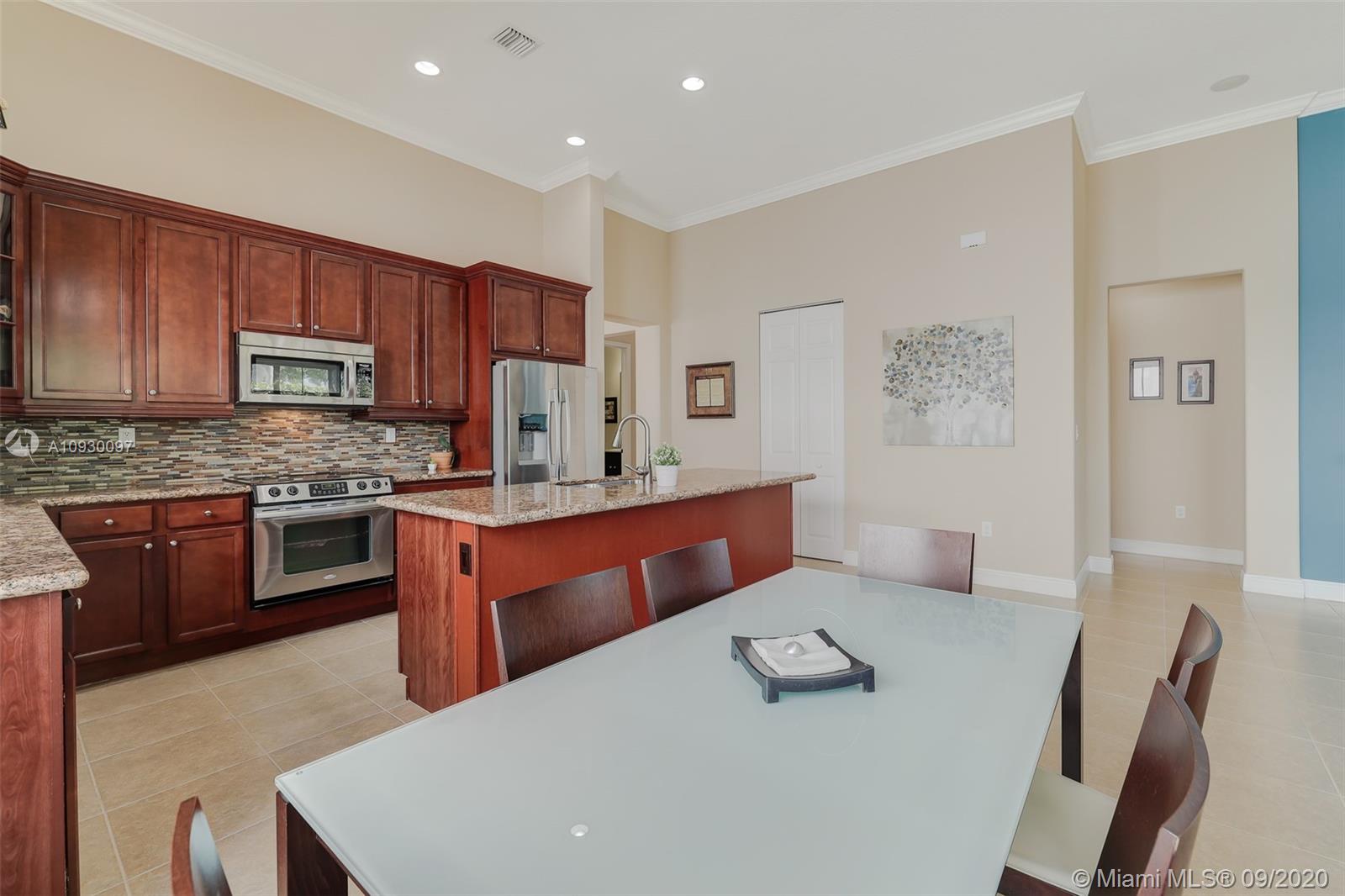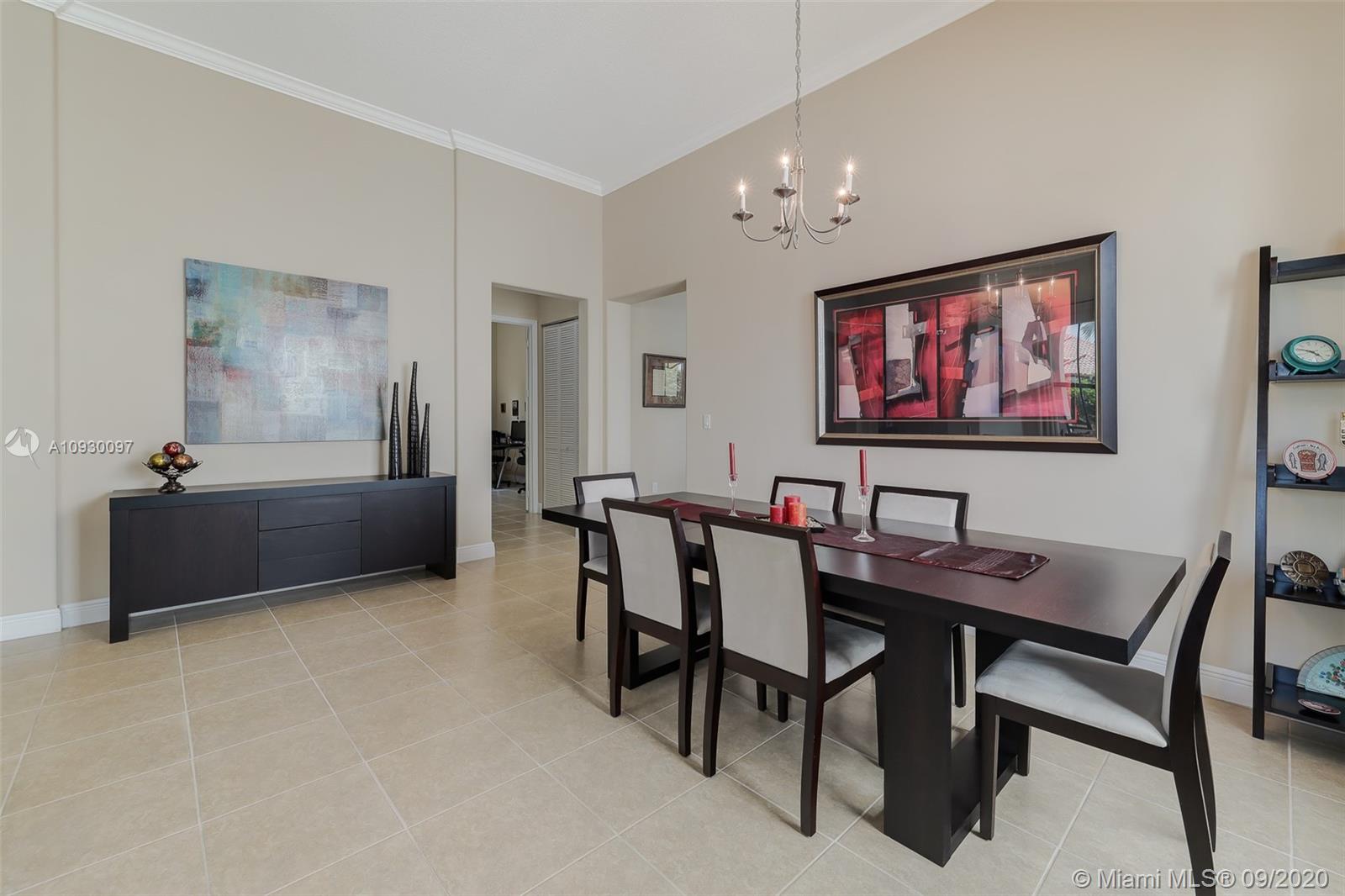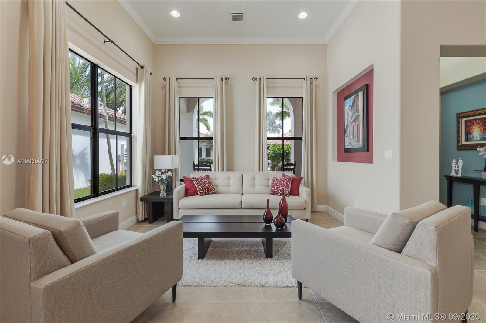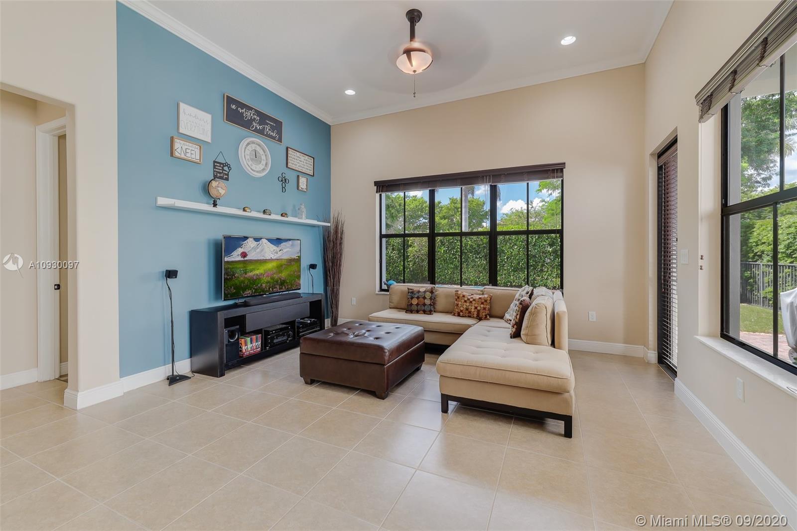 Stunning three bedrooms plus a Den, three full bathrooms home in desirable gated community- Monterra surrounded by pristine lakes and natural preserves. This rarely available Chapala Model features elegant 12' raised ceilings throughout, dramatic coffered ceiling in master suite, textured finish walls & ceilings, hurricane doors, hurricane panels. Walk through the luxurious foyer, into an open & bright formal living and dinning room area, flowing well with accent walls, open kitchen with stainless steel appliances, wood cabinetry with 42" upper cabinets, granite countertops with 4" backsplash, overhead recessed lighting. Community features resort style amenities including over 8,500SF clubhouse & pool, tennis & basketball courts gym & more. Cooper City is known by having the best schools.