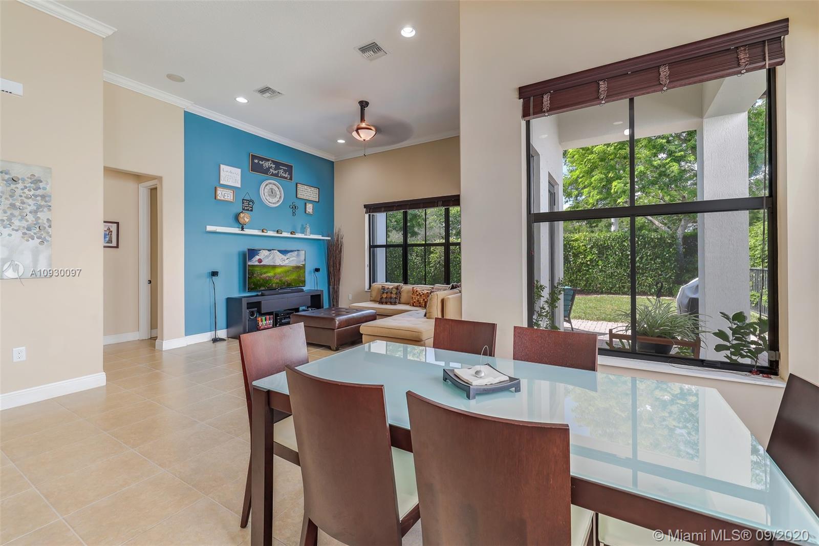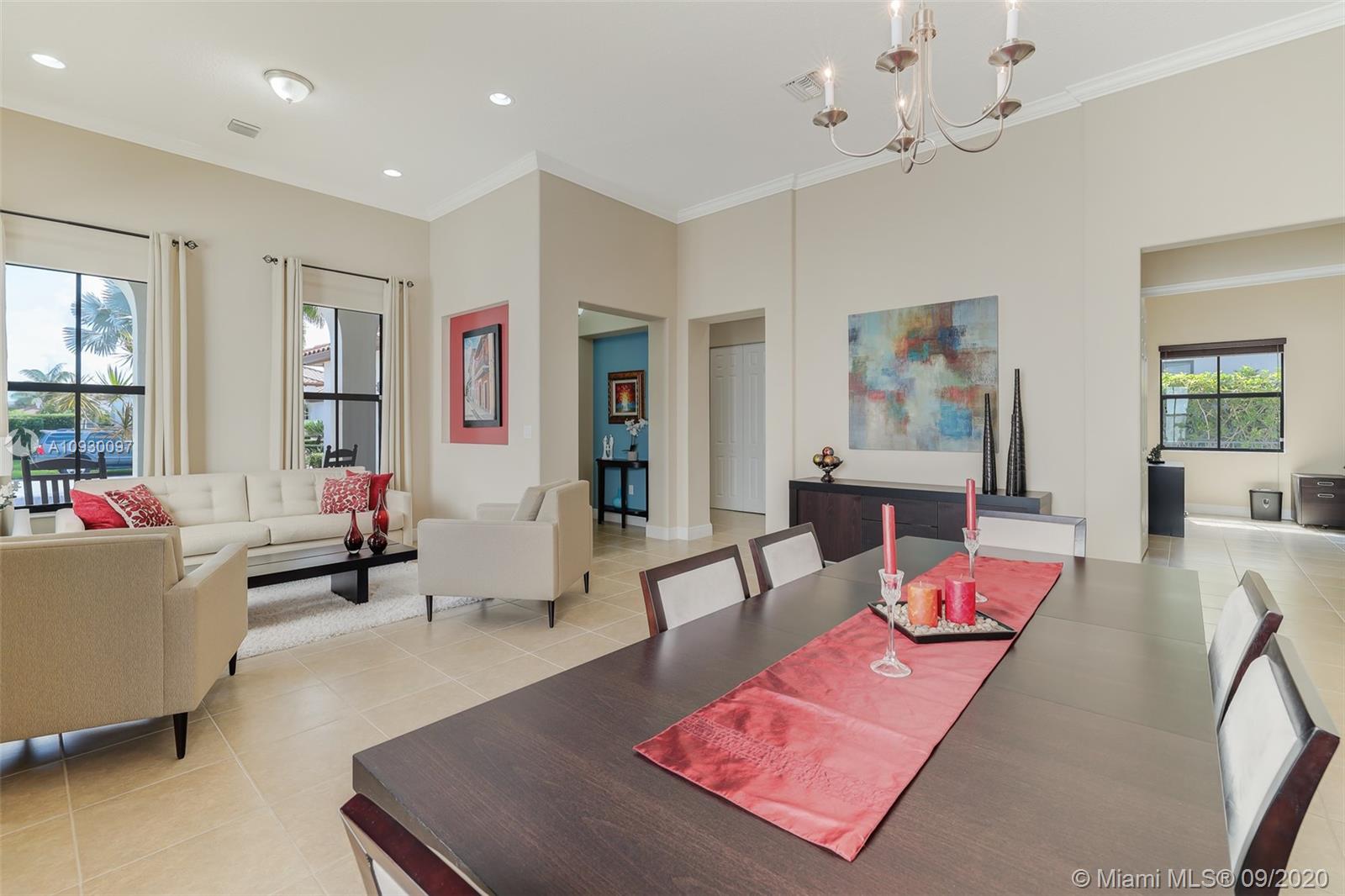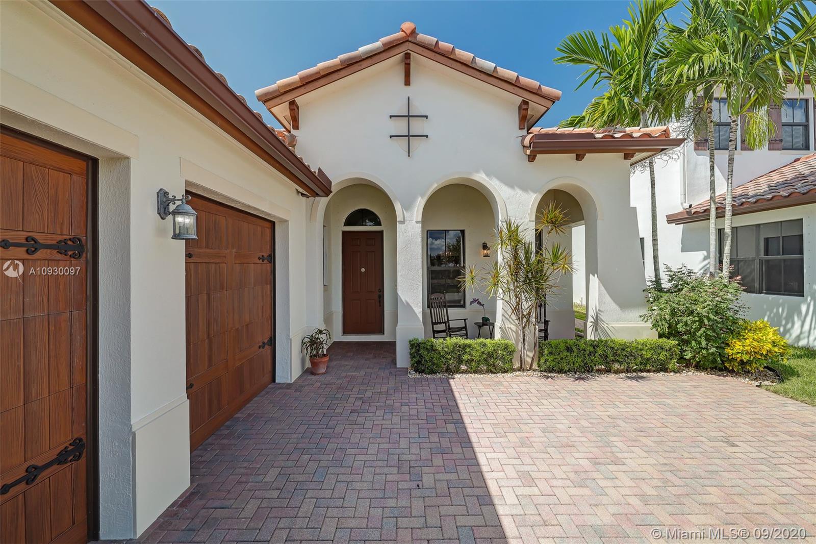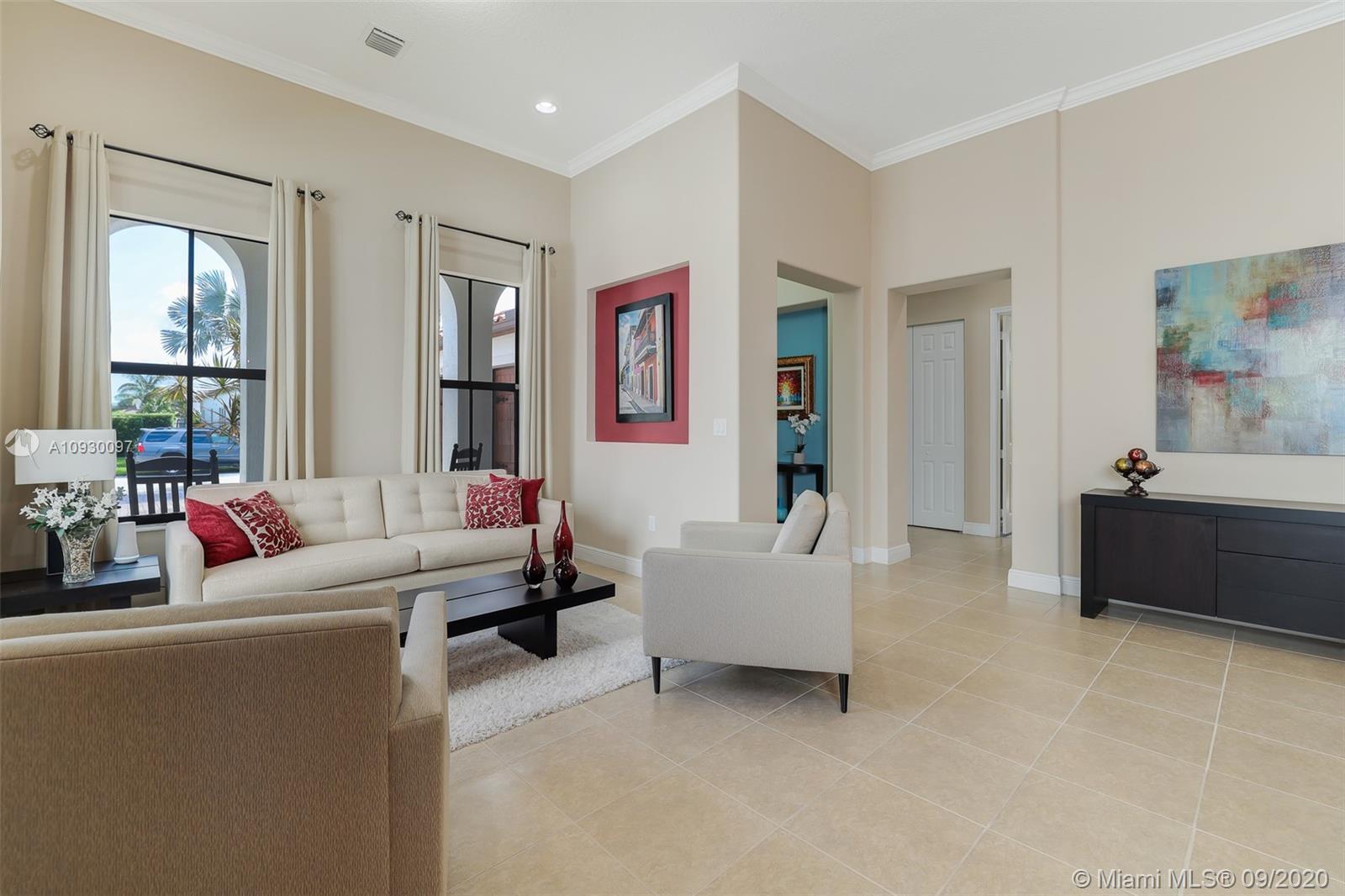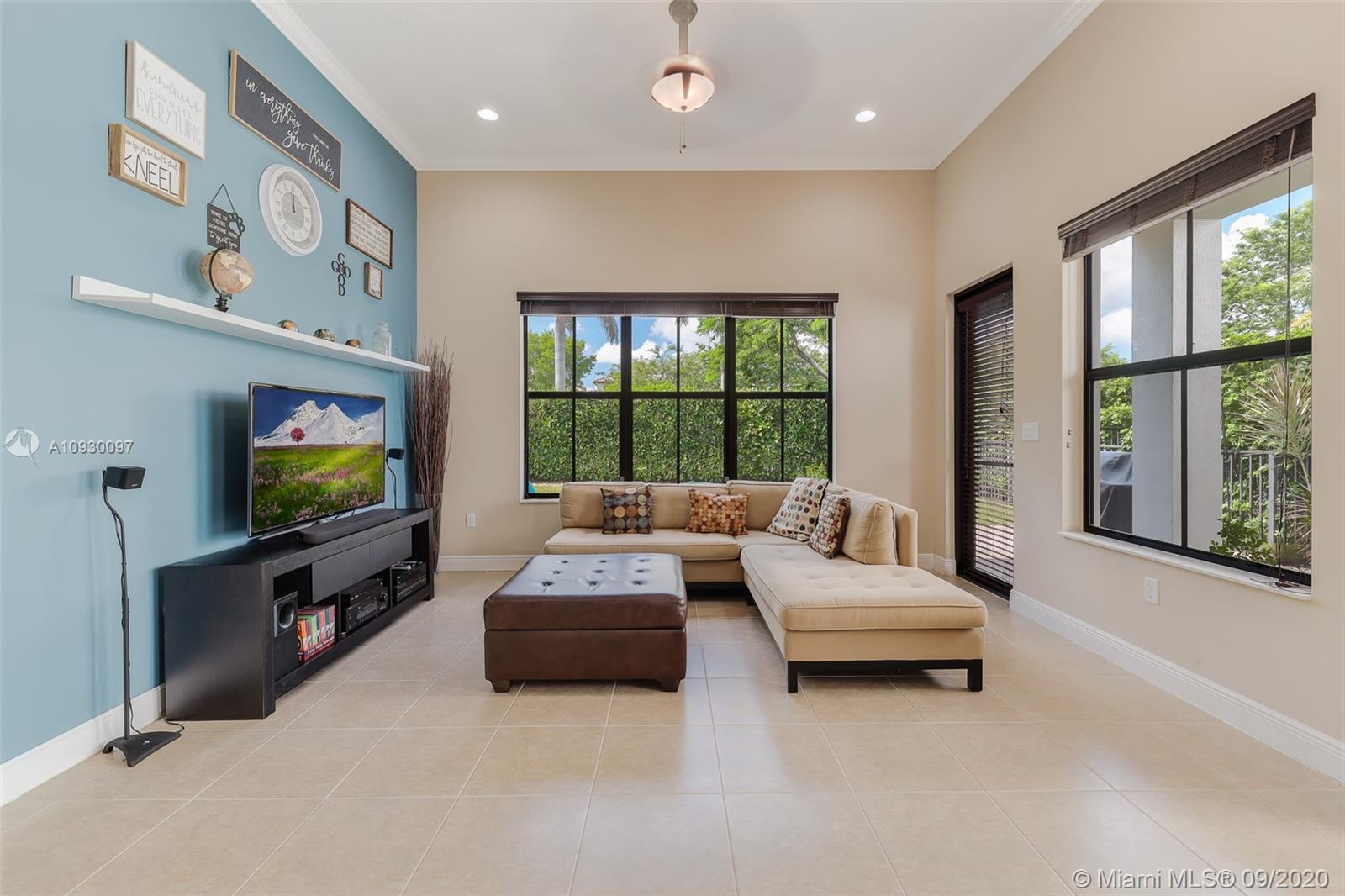 Stunning three bedrooms plus a Den, three full bathrooms home in desirable gated community- Monterra surrounded by pristine lakes and natural preserves. This rarely available Chapala Model features elegant 12' raised ceilings throughout, dramatic coffered ceiling in master suite, textured finish walls & ceilings, hurricane doors, hurricane panels. Walk through the luxurious foyer, into an open & bright formal living and dinning room area, flowing well with accent walls, open kitchen with stainless steel appliances, wood cabinetry with 42" upper cabinets, granite countertops with 4" backsplash, overhead recessed lighting. Community features resort style amenities including over 8,500SF clubhouse & pool, tennis & basketball courts gym & more. Cooper City is known by having the best schools.