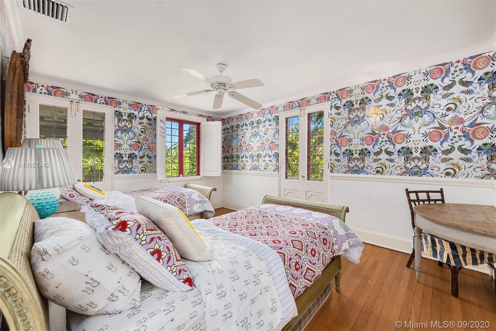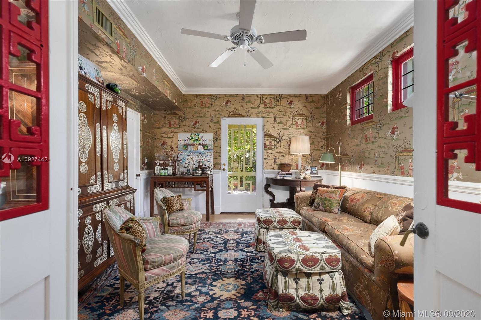 Hidden away in the City of Coral Gables is a gorgeous 3,696 SqFt Chinese residence, in one of George Merrick’s themed residential villages. With ivy-covered walls and a lovely front patio, it has Chinese architectural lines, curling roofs of ceramic glazed tile, and original Dade County pine floors. The first floor includes a kitchen, welcoming living and dining room, studio, and an additional room with a separate entrance. Upstairs are four bedrooms and a hallway with French doors that provide natural light and open to a balcony. Every room has beautiful wallpaper designs, with a mix of patterns and color palettes that transform each space and give the home a classic and inspiring look. Enjoy peaceful living close to shops, restaurants, schools and transport.