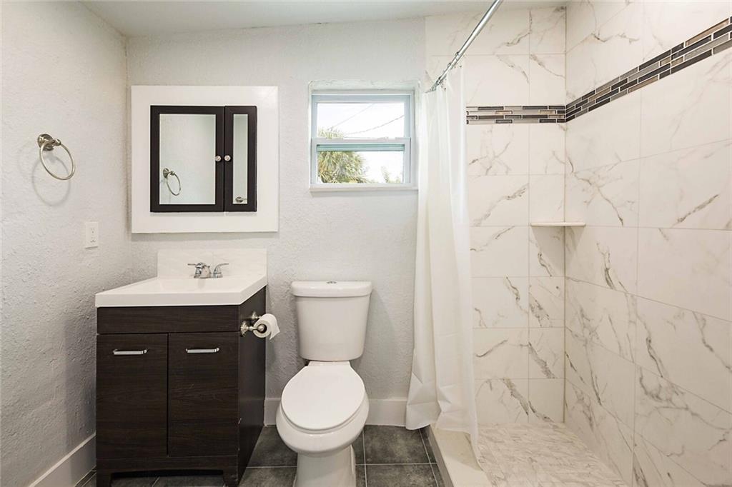 Great home waiting for the perfect family. Beautifully remodeled 3 bed, 1 bath single family home. New bathroom. New kitchen with kitchen island that seats 4-5 people with storage cabinets underneath. It also features new kitchen cabinets. The floors are newly tiled throughout, new doors and mostly new windows, some of which are impact. Each room Includes a window A/C unit and ceiling fan. A space saver combo washer and dryer unit are also included. Your purchase will include a stainless-steel stove, over the range microwave oven and fridge. There is a spacious back yard and a two-car brick paver and concrete driveway. If new sounds good to you, you must see this home. It is move in ready today. All renovations are done for you.