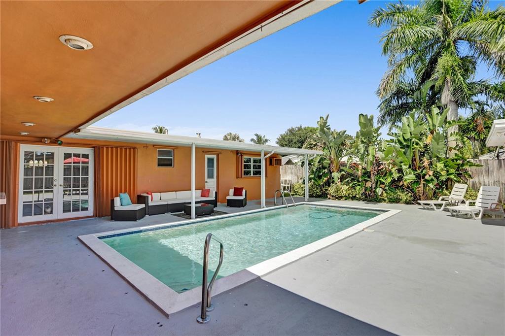 Amazing opportunity!! 3/2 + den or could be a 4th bedroom pool home on oversized fenced lot in Hollywood. Spacious open floor plan with french doors that lead out to the pretty pool area with a covered patio, large deck area and a fee standing CBS workshop/storage shed. BRAND NEW stainless appliances in large eat in kitchen with wood cabinets. Large utility room has great storage with washer and dryer. Electrical panel has been updated and seller will installed hurricane shutters for openings not protected prior to closing. $9500 credit will be given to buyer at closing to replace roof!!! Close to schools, park, shopping and highways !!!