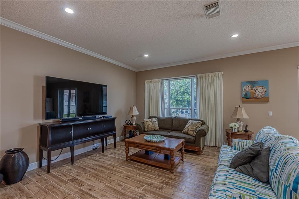 This beautiful, spacious 3/2 home is located in the attractive residential area of Oakridge. The home features a large open living/dining room area, volume ceilings, crown molding, wood-look tile floorings, spacious updated kitchen with stainless appliances, breakfast bar and eat in area, split floor plan, the Master Bedroom features custom drapes, built in closets, a large bathroom with dual sinks and a separate tub and shower. Large windows allow plenty of natural sunlight into the home and feature a retractable awning in the back of the home, accordian shutters, and all doors are hurricane rated for your safety. Come enjoy your bright new home in the 24 hr manned gated community of Oakridge offering amenities of tennis courts, walking trail, tot lot, and boat yard (fee).