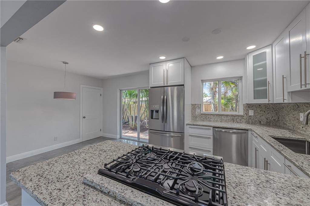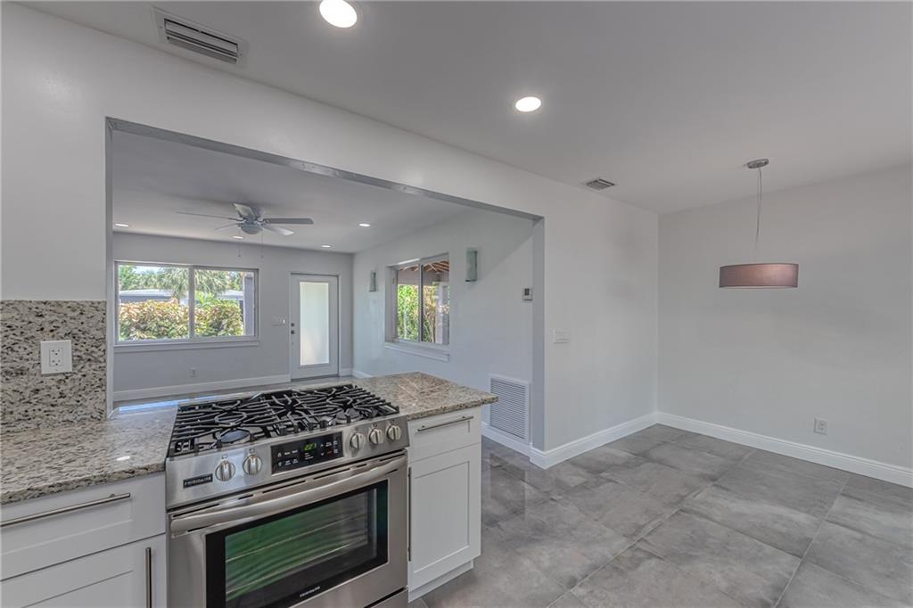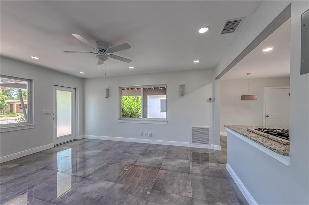 This house is DONE and ready for YOU! Renovated Kitchen with granite counters and backsplash & both bathrooms with Quartz counters. New porcelain floors throughout with 3 beds, 2 baths, Dining area, open Kitchen, indoor Laundry room. Owner's bedroom on the back of the house with a separate entry door. LED recessed hi hat lighting throughout. All impact windows and doors new in 2017, new roof in 2015, new A/C in 2013. Pleasant paver patio in the back yard with room for a pool. Fenced yard. Natural gas line to the house runs the stove, dryer, tankless hot water heater, and the A/C heater. One car carport with large storage room. Welcoming front porch -- freshly painted inside and out! Lovely home!