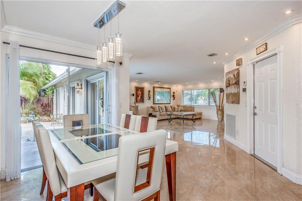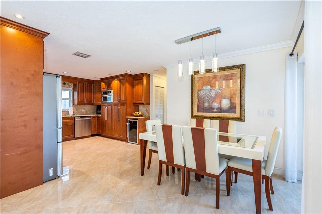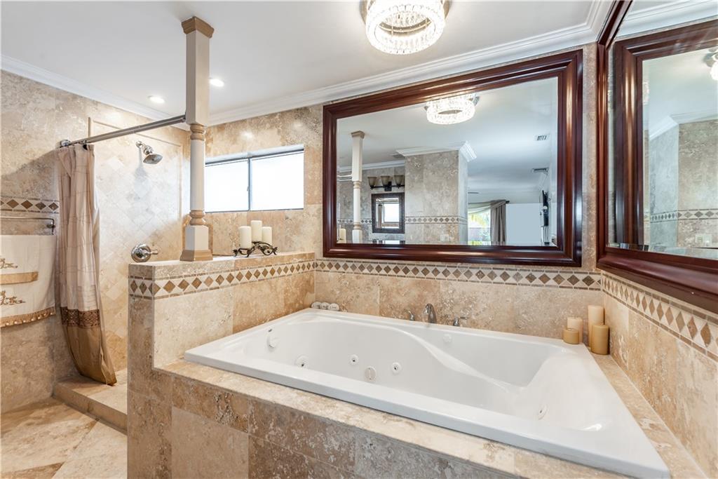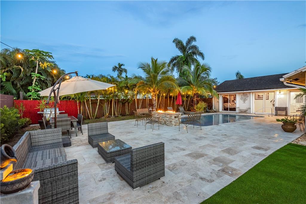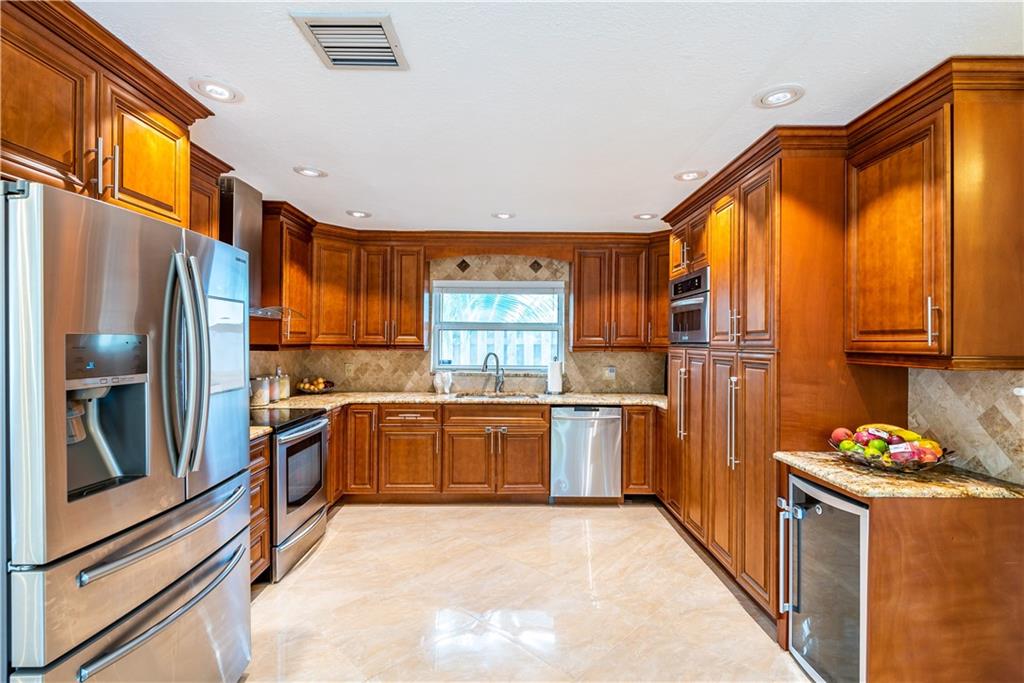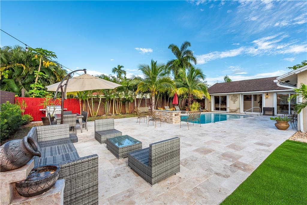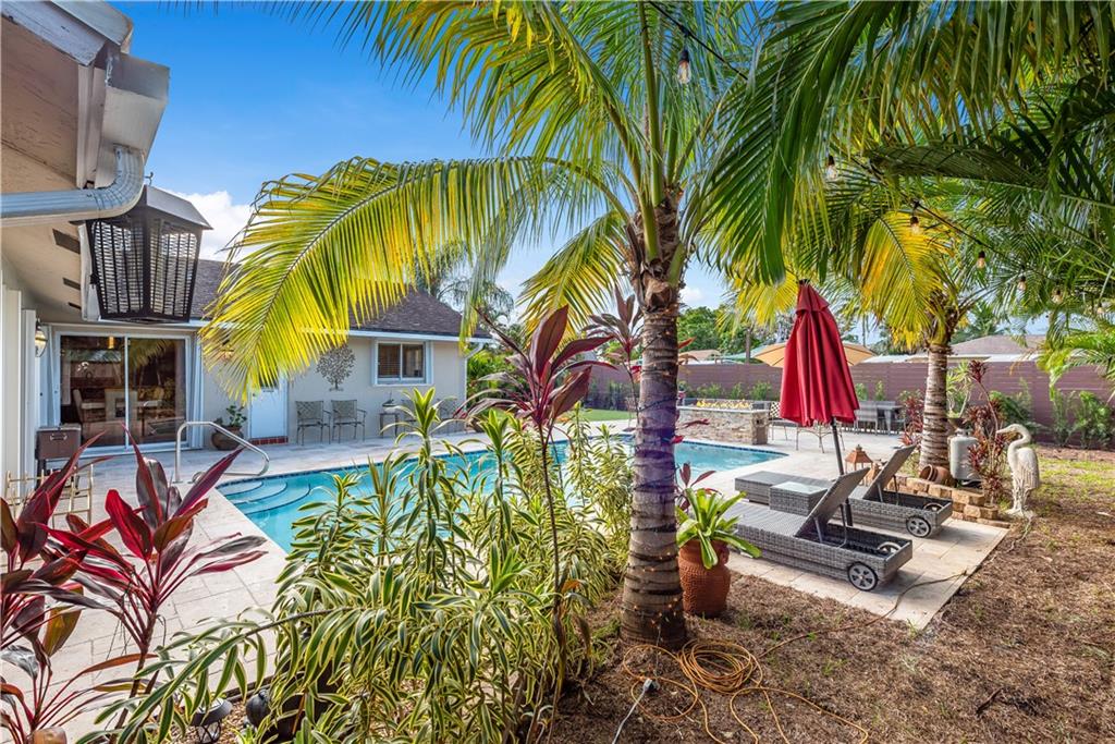 Floor Plan: 3/2 Open concept with slip floor plan for max privacy Flooring: Large porcelain tile throughout living area and Italian cherry wood in bedrooms Kitchen: The custom gourmet kitchen boast designer quality Italian wood cabinets with soft close feature, granite counter tops and state of the art stainless steel appliances Baths: Exotic floor to ceiling tiles in all bathrooms amazing craftsmanship Master bed His and hers walking closets Outdoors: True Oasis perfect for entertaining boosts lush landscaping and lighting throughout, lighted pool, extra-large patio, custom fireplace Cooling: Energy efficient AC 2 years old, thankless water heater. Parking: 2 driveways; huge space able to house an RV or Boat Security: Accordion shutters, motion lighting, camera & alarm system