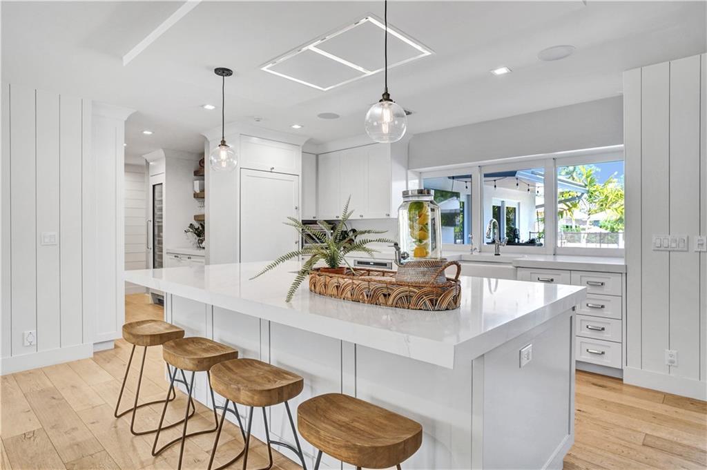 Coastal contemporary with exquisite attention to detail at every turn. COMPLETELY reconstructed in 2017 including: roof, impact windows/doors, NEW raised seawall, NEWLY built pool, kitchen, flooring, bathrooms and more. Light and bright open floorplan. Gourmet kitchen boasts quartz countertops, white shaker cabinetry and Wolf induction stove. Beautiful French White Oak flooring and Shiplap walls throughout. Master suite features custom closets, motorized blackout shades and spa like bath with steam shower and tub. Spacious secondary bedrooms. Backyard oasis with covered space for entertaining, pool, grass area and 85’ waterfront.
