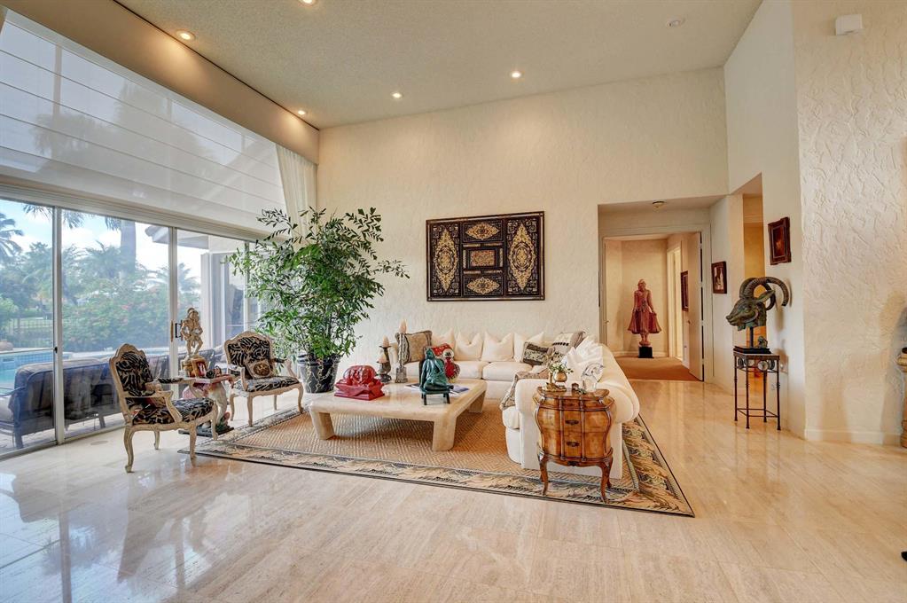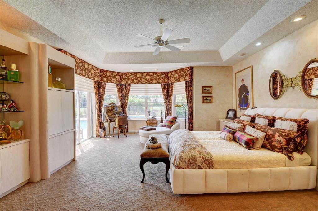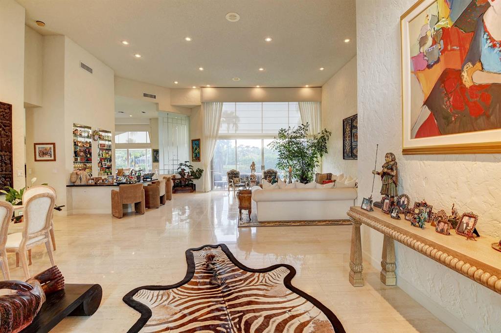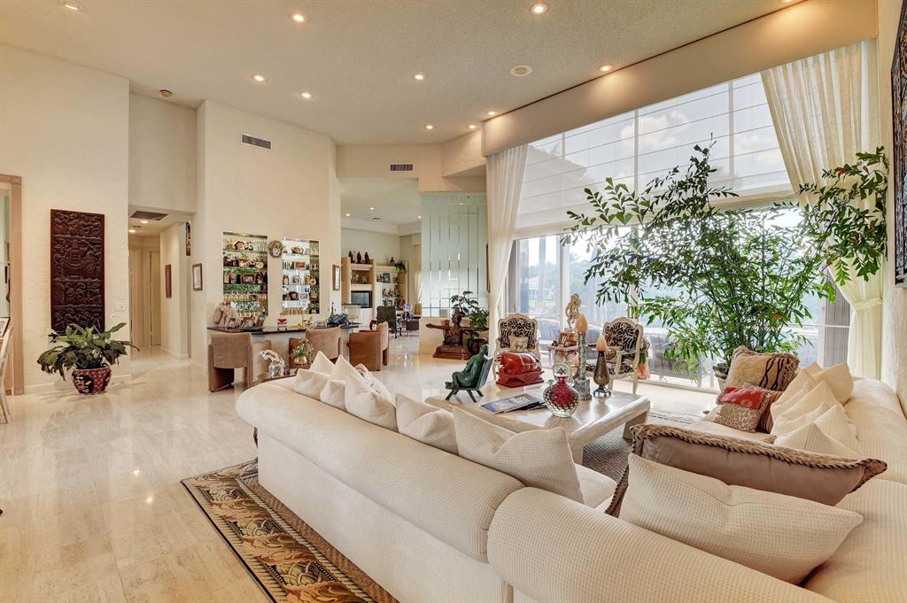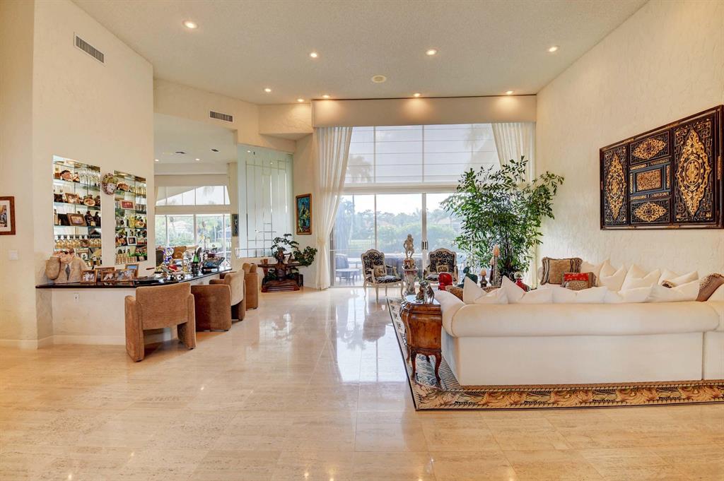 When you walk thru the double door entry of this beautiful home you will notice the spacious feeling, volume ceilings, and a lot of natural light. This immaculate, open and bright, one story home has 3 Bedrooms, 3.5 baths, plus office or den. Features include: neutral travertine tile, lots of hi-hats, fitted closets, fans, accordion shutters, sound system, wall oven, island kitchen, remote blinds, snack counter, 2 car plus golf cart garage, wood floor in office, and more. Entertain and enjoy the lifestyle on your private patio with large heated pool overlooking your serene lake view. Large master suite and master bath with jetted soaking tub, bidet, and 2 walk-in closets. Membership is mandatory w/ yearly dues and initiation fee paid before closing. Call for private showing. A must see!