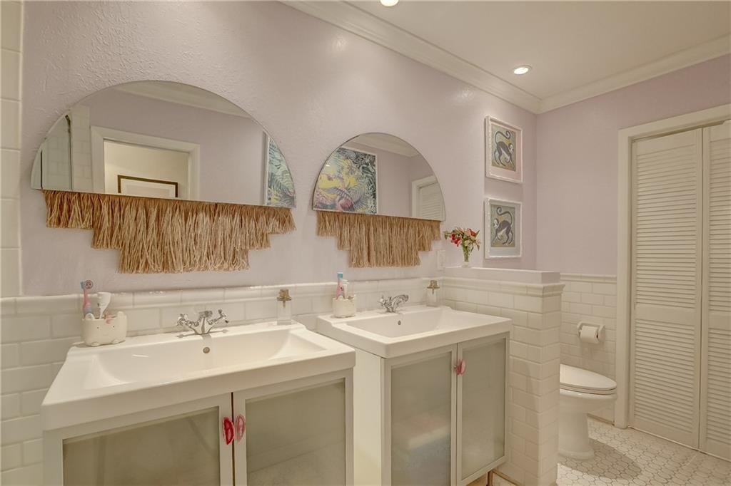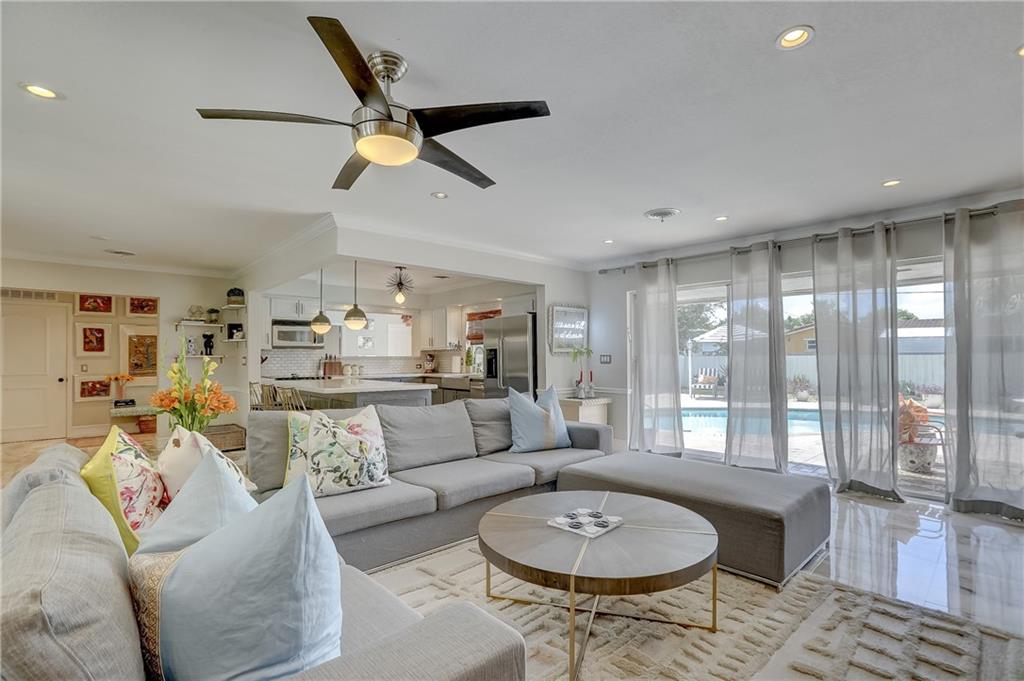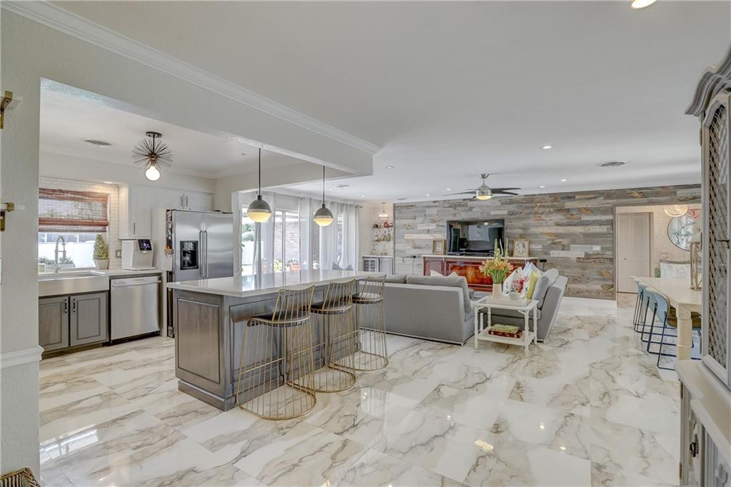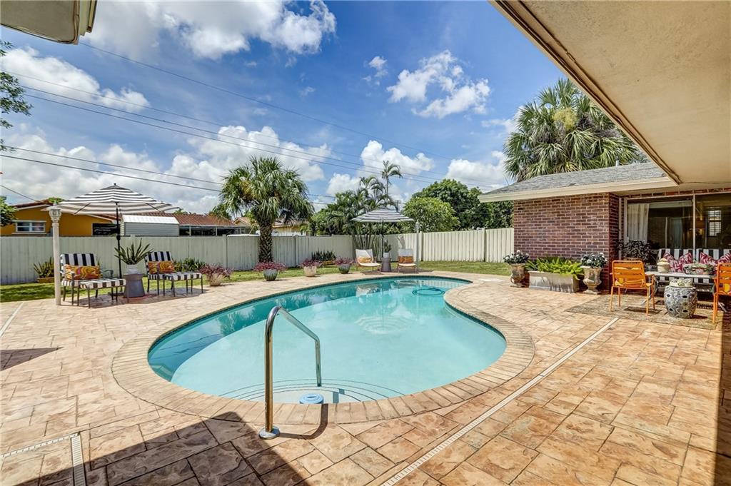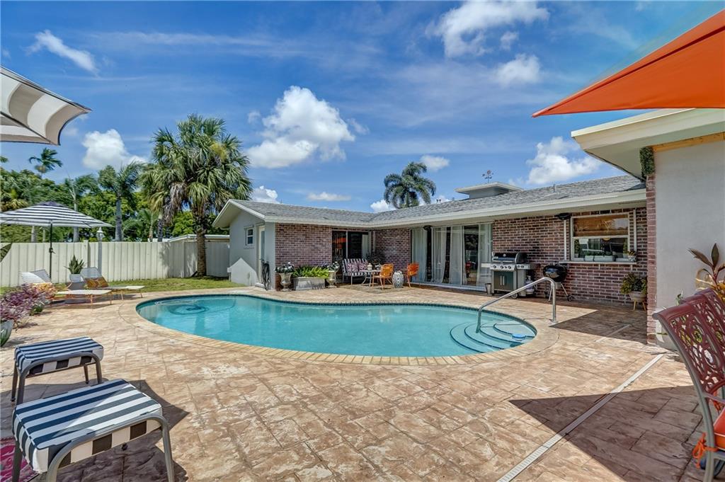 Nestled on a quiet street in the sought-after Hollywood Hills neighborhood, this split floor design offers a 2 car garage, 4 bedrooms and 4 full baths. Wood floors and stunning 24 x 24 porcelain tile run throughout the home. A Thibaut wallpapered-foyer welcomes instant views of the contemporary, open floor plan. A common living space is multi-functional and perfect for entertaining: outfitted with an over sized wood accent wall, a built-in wet bar with wine fridge, a freestanding island perfect for entertaining, as well as glass sliding pocket doors that open up to beautiful pool views. A updated kitchen is equipped with quartz countertops & subway tile backsplash. DOUBLE MASTER SUITES with sliding glass door's opening to resort style pool complete with Bose speakers. Welcome home!