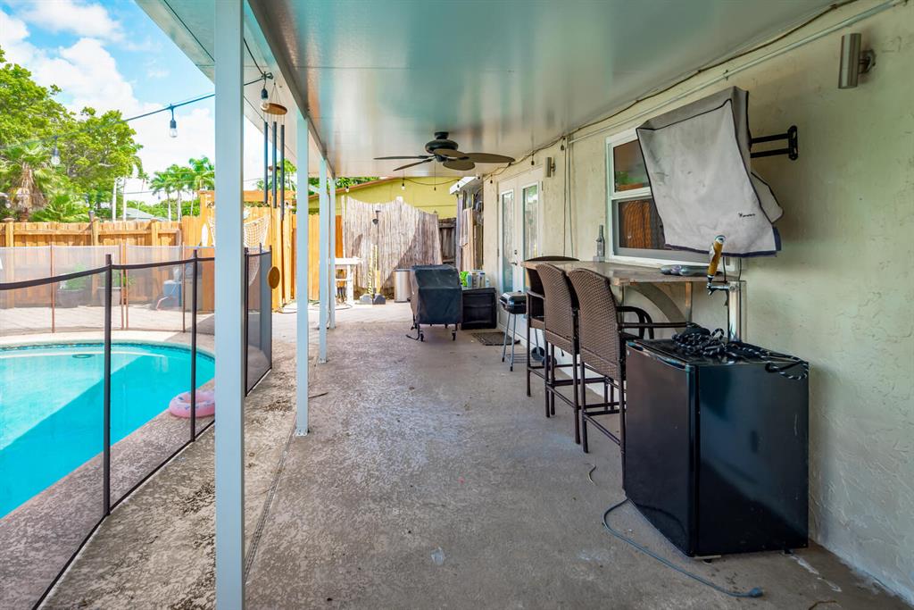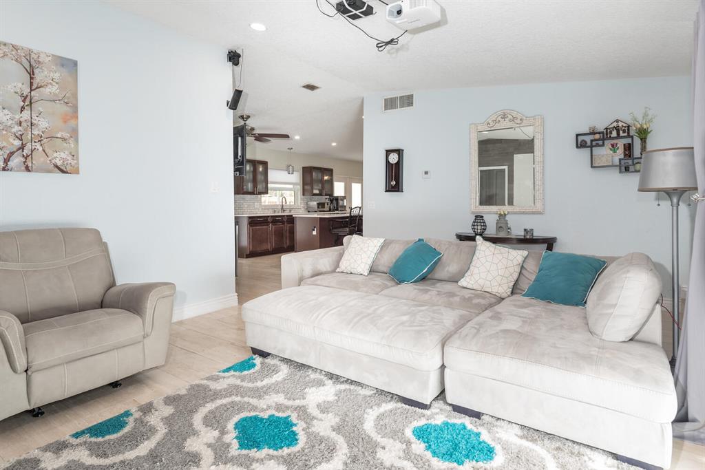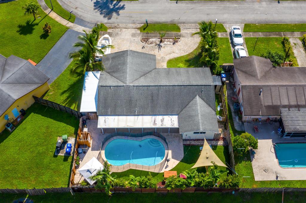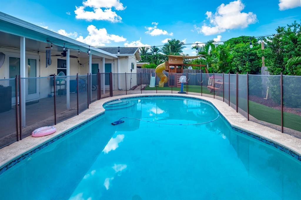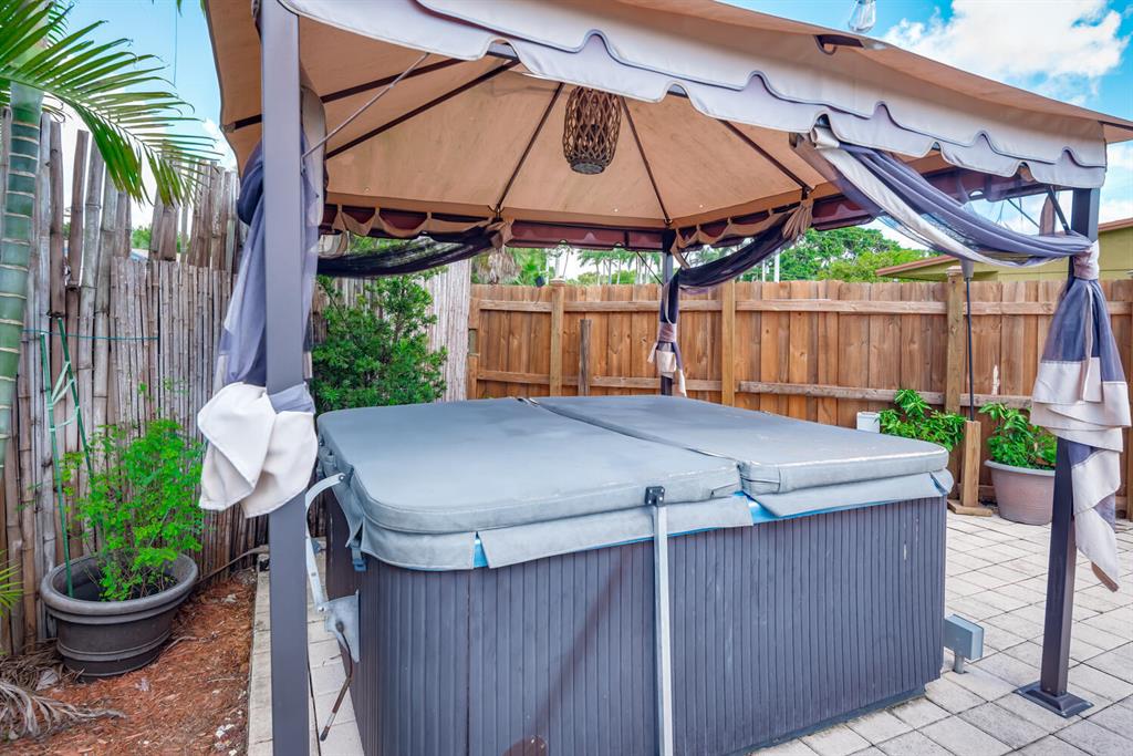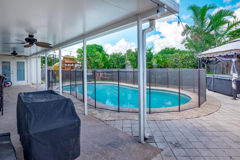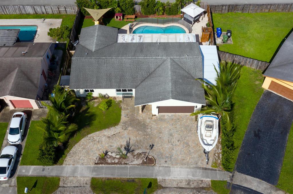 Welcome to Paradise! Beautiful totally updated 3 bedroom 2 bathroom home with hurricane impact windows & doors throughout & spectacular Salt water pool with outdoor shower & Gazebo for plenty of outdoor living. Travertine floors throughout living/kitchen area with beautiful stove top island with quartz counter-tops & beautiful cabinets. Hardwood floors in master bedroom with walk-in closet & marble top vanity in master bathroom with beautiful shower with jets & LED shower head. Bamboo flooring in the other bedrooms with built in floating organizer in closets. Newer AC with UV antibacterial lamp. Tank-less Hot Water heater. Newer electrical panel in garage. 9 camera system with monitor. Stainless steel appliances. Circular paved Driveway with 2 car garage. Move-in Ready! Priced to sell!