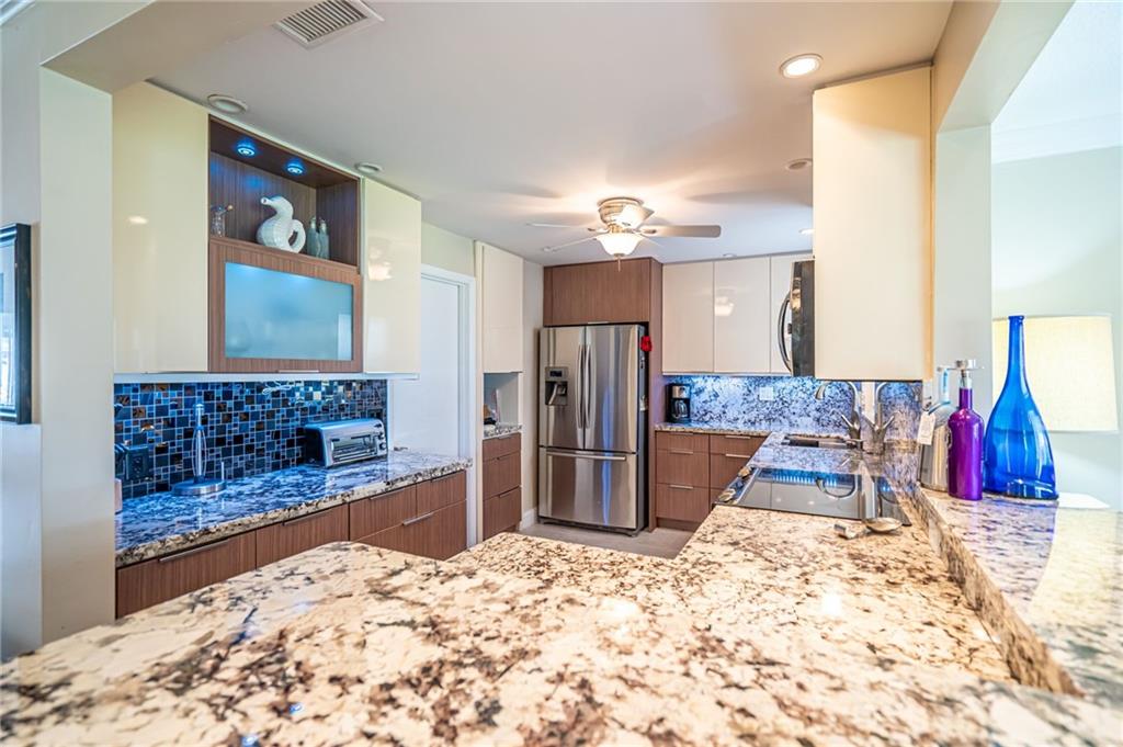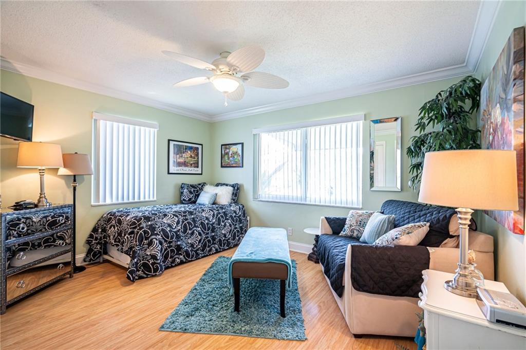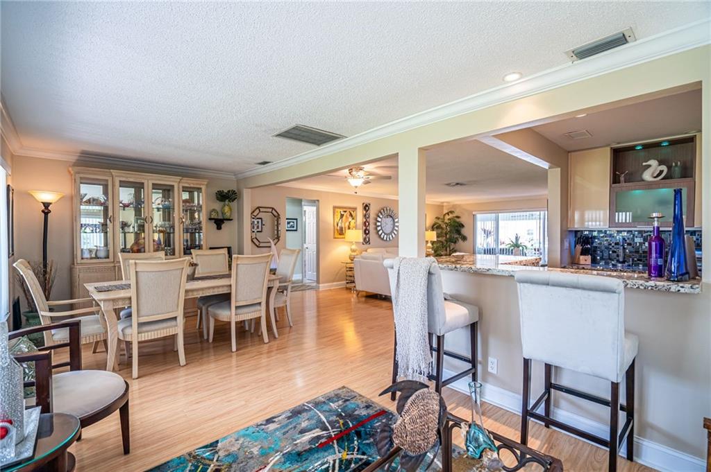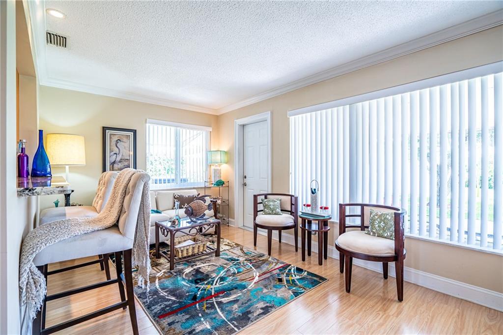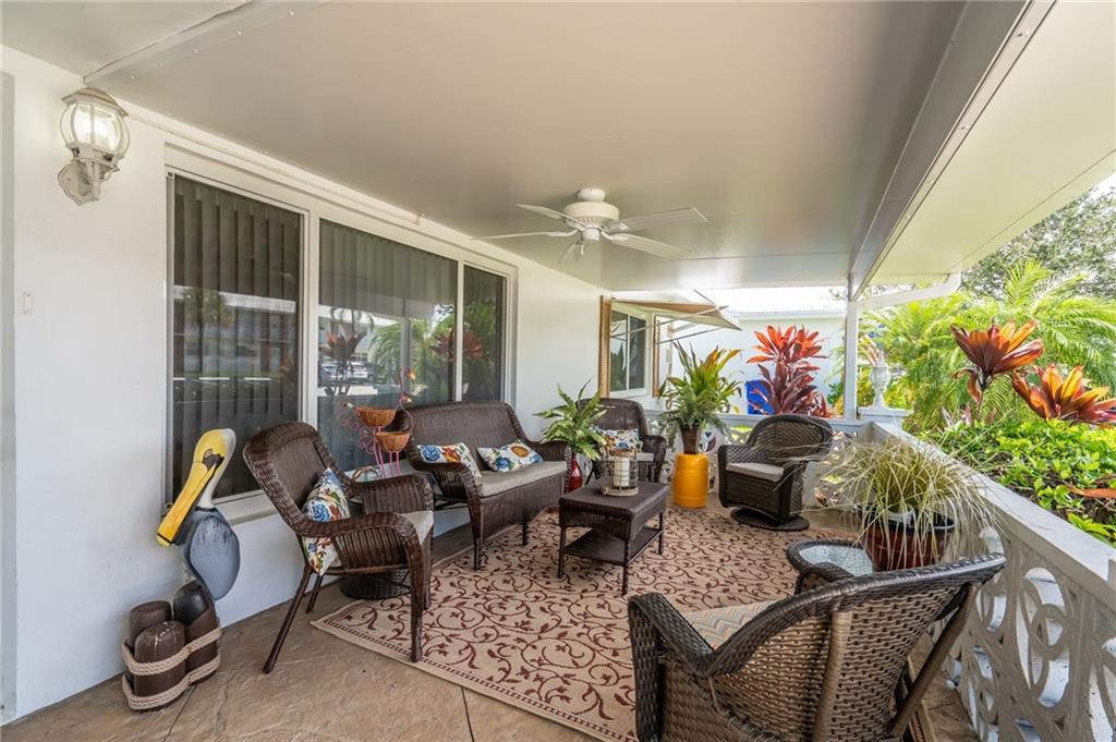 Gorgeous turnkey 2/2 + extended Florida room updated throughout. Featuring beautiful cabinetry, countertops, breakfast bar, high end stainless steel appliances and tile flooring. The living room and Florida room share wood flooring, and crown molding extending into guest bedroom and hallway. The bedrooms and bathrooms have been completely renovated with an excellent design and decor. Add the newer roof, hurricane windows and a/c. +entertain on the open porch and back patio. 55+ Community