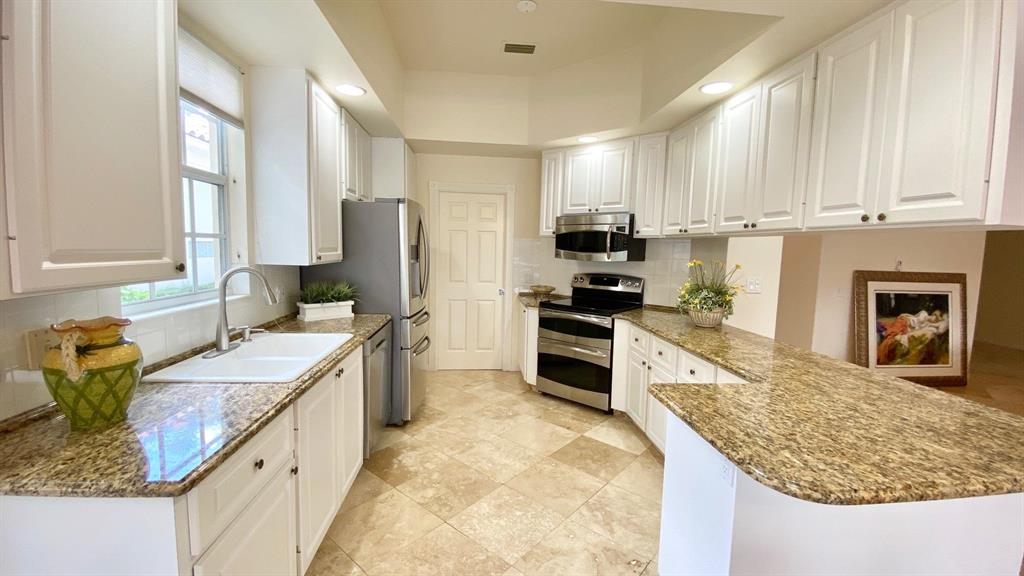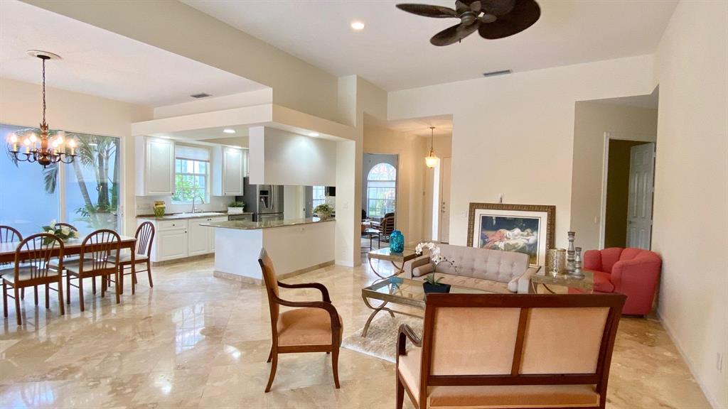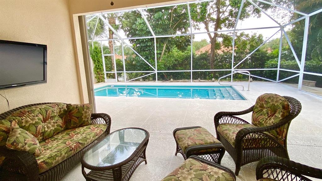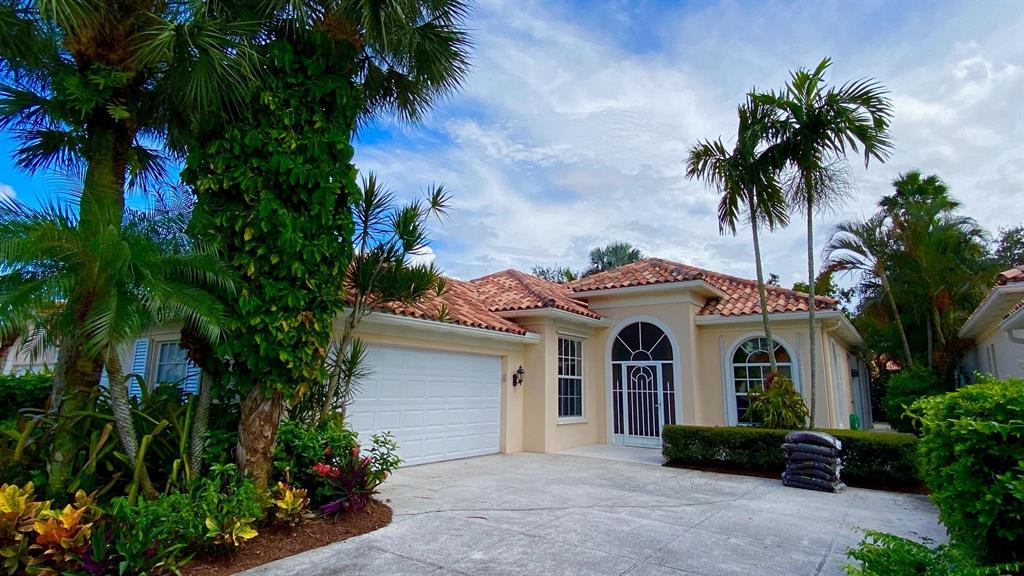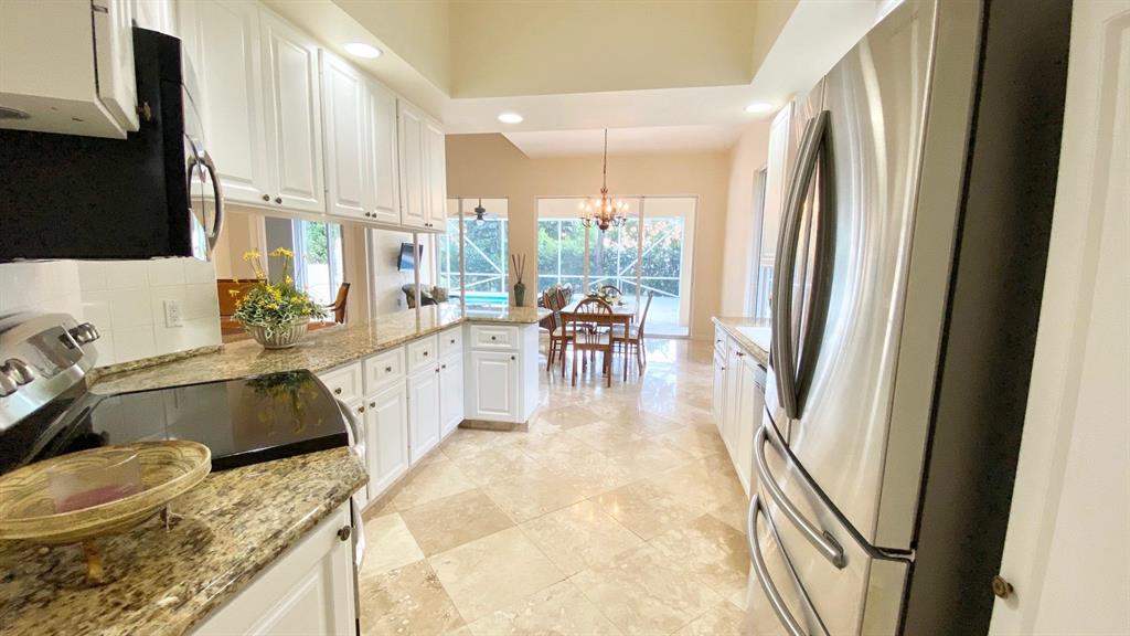 This gorgeous Oakmont offers total privacy with lush tropical landscaping around the property but still with access to the beautiful lake. Stylish travertine flooring through the main living areas, granite counters, stainless appliances... all add to the charm of this desirable home. 12 ft volume ceilings in the great room, a spacious master suite with a unique double bathroom arrangement, a den with large arched windows, covered lanai leading to the screened pool, central vacuum system, alarm system, laundry room with utility sink. This property is move in ready!