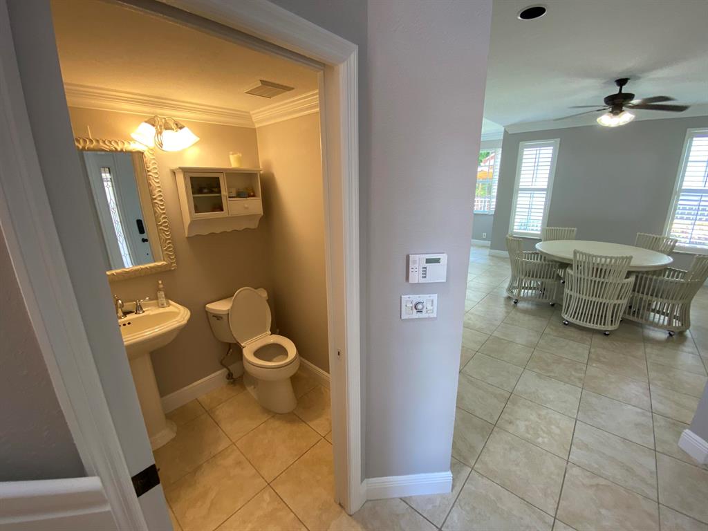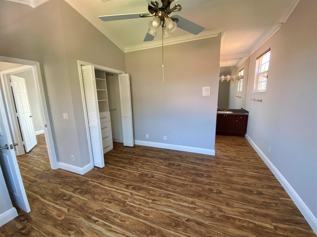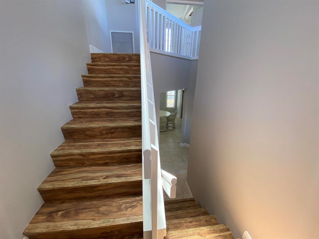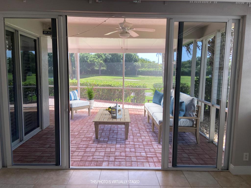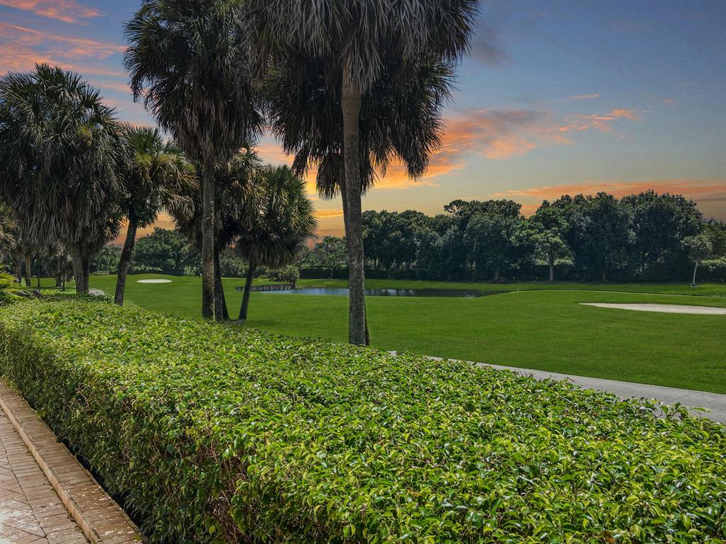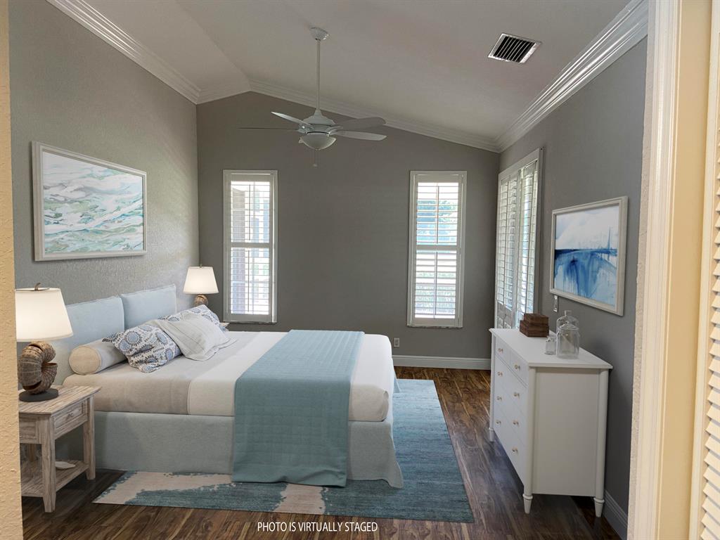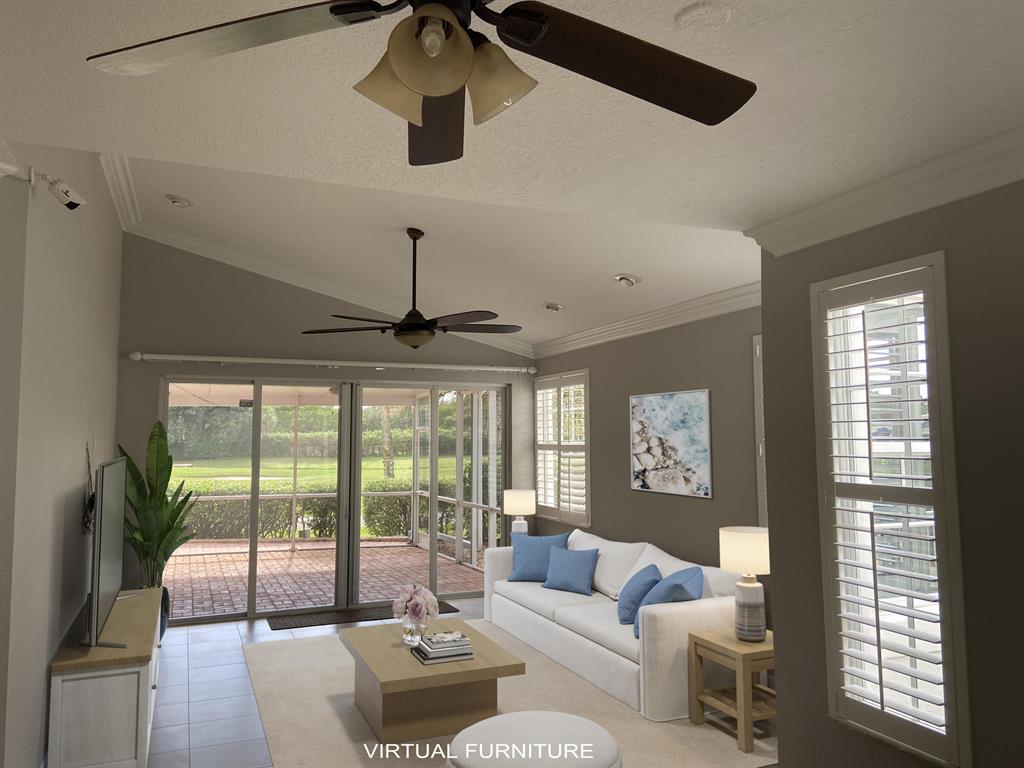 Fabulously beautiful 3 BR 2.5 BA, single family home with a direct golf course view. Large master BR on main level, upstairs has 2 BR with Jack and Jill BA. This 2-story charmer has premium decorative touches including crown molding, plantation shutters, wainscoting and new quartz countertops in the oversized eat-in kitchen. The house has brand new laminate wood floors in all three bedrooms and fresh paint inside and out. Back screened-in patio overlooking golf course was expanded for dining. Side yard is gated for dog. This home has hurricane impact glass. HOA includes lawn care, exterior maint, roof maint and roof replacement, cable and security with 24-hour gate. Membership for golf, tennis and social are available, but not mandatory.