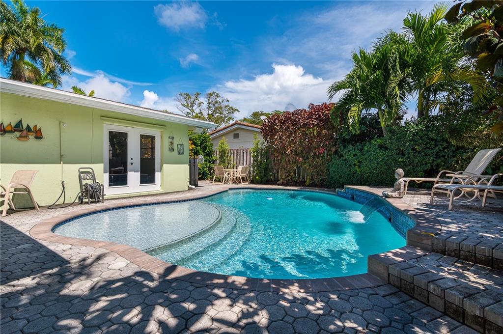 This gorgeous 3 bedroom/2 bath home features an oasis-style backyard with pool, lush foliage, landscape lighting, outdoor shower, and fenced for privacy. It features tons of natural light, open floor plan, nice-sized kitchen open to dining, a Florida Room, and large laundry with storage, two-car garage, and attic storage. The master has private seating area with access to backyard, master bath with dual sinks and large tub/shower combo, and spacious walk-in closet. Tons of natural light floods the home from all sides, and has currently been converted to a two bedroom, but easily converted back to a three. Property is located on a tree-lined street in the A-rated Floranada School District. Close to shopping, restaurants, and just over 1.5 miles to Lauderdale-By-The-Sea Beach.