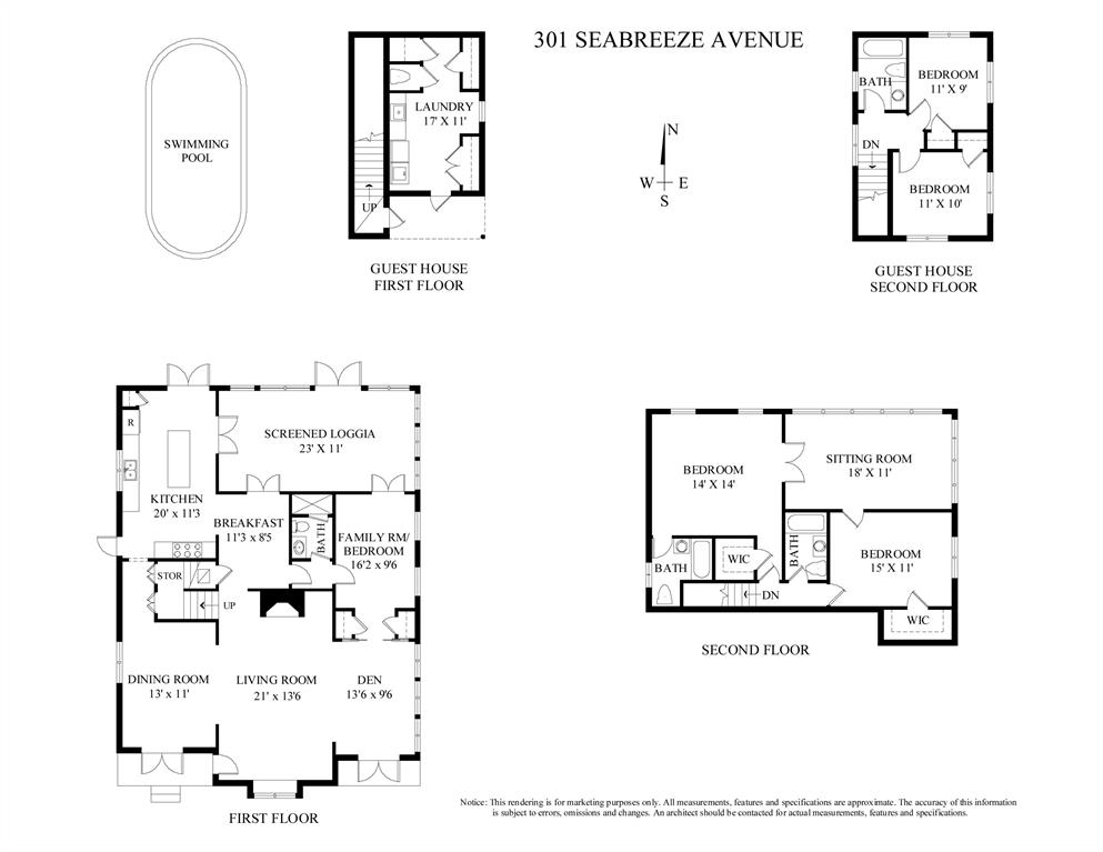 A classic Palm Beach cottage, totally renovated in 2011 with high-end kitchen appliances and new baths. Wolf gas range with double-ovens, Sub-Zero fridge and a pleasant breakfast nook. Two upstairs bedrooms plus a large sitting room/exercise area that sits above an absolutely idyllic large screened porch. First floor study with full bath and closets that can be closed off as a downstairs bedroom. Separate dining room and inviting living room with beautiful masonry fireplace.Guest cottage features two bedrooms, full bath and laundry room. Garage could be restored with entrance off the Clarke Street alleyway.Charming family home or great income property with a strong rental history, sited in the quiet center of the block. Close to all the walkable in-town amenities everyone loves.
