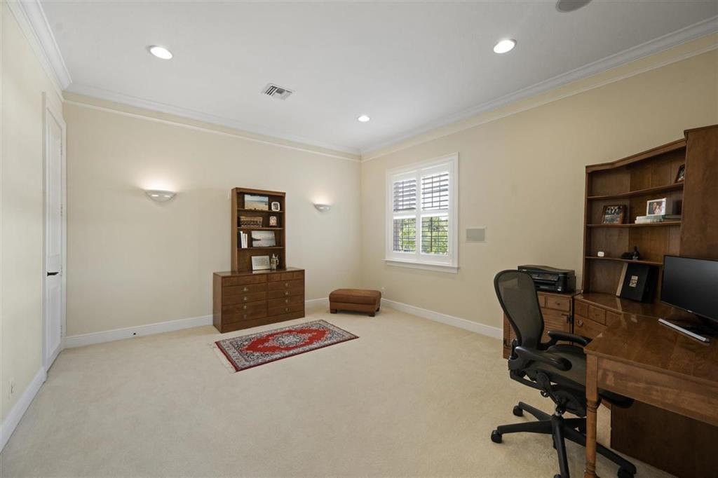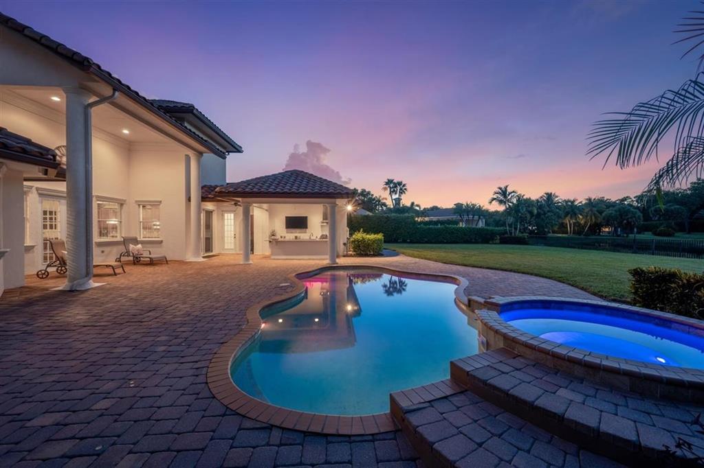 Stately Mediterranean custom designed home in the beautiful gated community of Breakers West. Completed in 2009, this 2-story home has 5 Bedrooms + Office, 5 full and 2 half baths on an amazingly private 1/2 acre lake view lot. Popular Great Room floor plan with gas fireplace opens beautiful center island kitchen with plenty of storage and Thermador gas range, French door refrig (2020), dishwasher (2019). Entertaining is easy with tremendous outdoor patio featuring a summer kitchen/bar, tranquil pool (salt chlorinated & heated) and spa, outdoor speakers and open grassy yard for play area or for gardening. Downstairs Office and Master Suite are conveniently adjacent to each other, both feature wood flooring. Master Bedroom has custom fitted closet, marble master bath with separate tub
