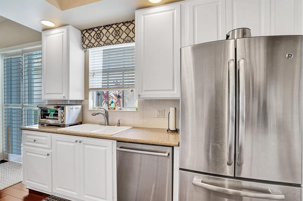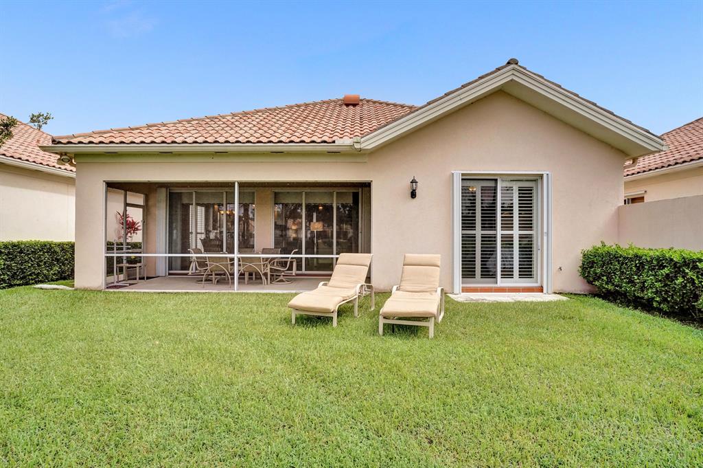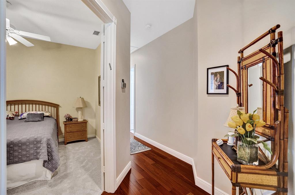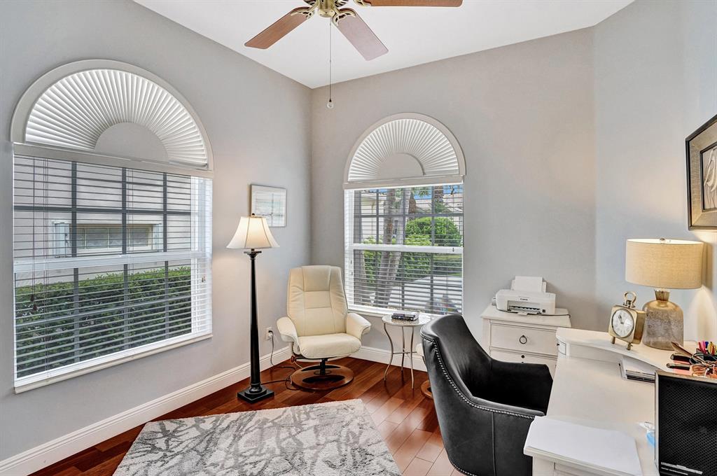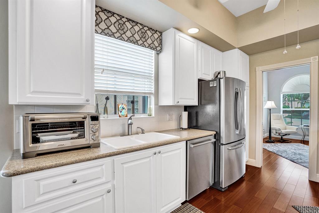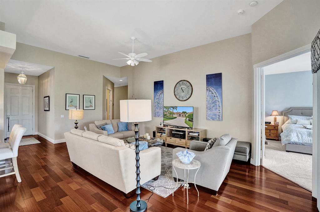 Immaculate lakefront beauty located in the desirable resort-like community of Riverwalk. Enter this spacious 3 bedroom, 2 bath + den/office Oakmont model through double-doors, where you'll immediately take notice of the beautiful hardwood floors that run throughout the main areas of this well-maintained home. A large, bright kitchen with newer stainless steel appliances, granite counters, lots of cabinets, and plenty of counter space overlooks the dining area and great room with 12' ceilings. The master bath has a unique his and her layout with dual entry to the glass enclosed shower. Enjoy amazing sunsets with lots of privacy from your covered, over-sized screened-in patio with serene lake views! Situated near the cul de sac, this location offers easy access to the Town Center with all