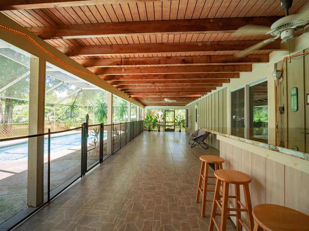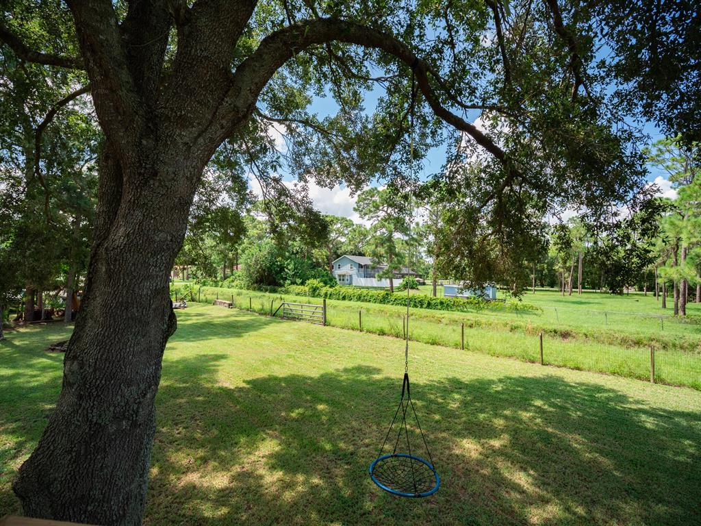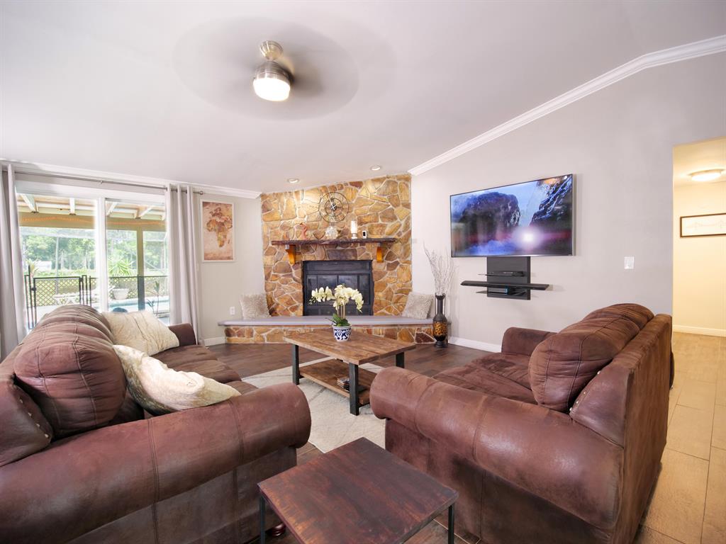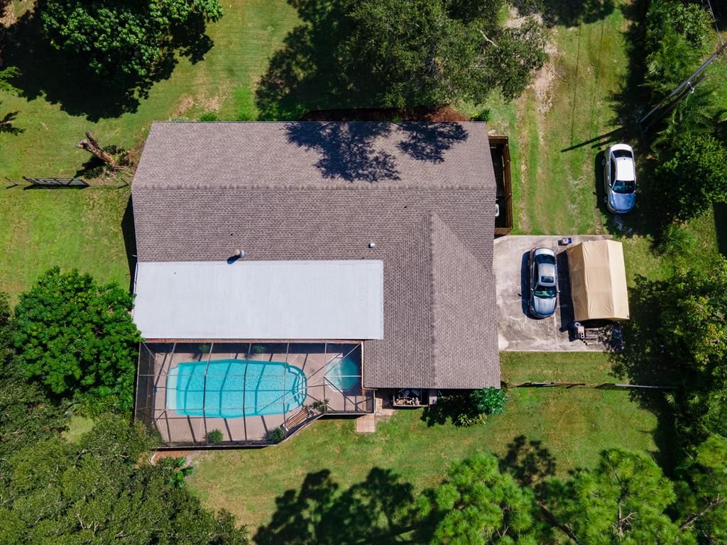 Open concept pool home on a paved road that has been completely renovated throughout. Brand new roof 2018 and flat roof over patio 2019. This home has ceramic wood tile throughout. Kitchen has exotic granite counter tops. Crownmolding in every room with 3 wood barn doors. Real wood burning fireplace with custom vinyl upholstered seating area in front. Every room has a walk in closet. Large indoor laundry room. 3.5 car garage. Self flushing water system with peroxide and reverse osmosis drinking water. Back patio has custom moveable outdoor bar for entertaining with exotic granite countertop. Screened in patio with pool and hot tub. Backyard has a large treehouse and is filled with 100 year old oak trees that provide ample shade. Fruit producing mango and papaya trees. 1.25 acres and NO HOA