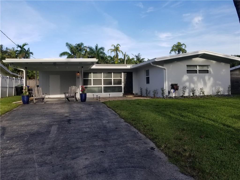 Welcome to one of Fort Lauderdale's most desirable communities with NO HOA, Lauderdale Isles. The WOW factor begins with an open concept, vaulted ceilings and exposed rafters. 3 bedroom, 2 bath home with covered carport, family room and indoor laundry. Step thru the French doors and quickly realize this home was built for outdoor living and entertaining. A large fenced yard and huge paver patio await with massive pergola, shiplap feature wall wired for TV, and built-in fire-pit. Freshly painted inside and out with wood-like tile floors. Brand new washer/dryer set and complete stainless-steel kitchen appliance package. Impact windows everywhere except family room. Dual-zone HVAC system, both units replaced 2013 and 2018. Side gate opens for boat trailer or RV storage. Boat ramp nearby.