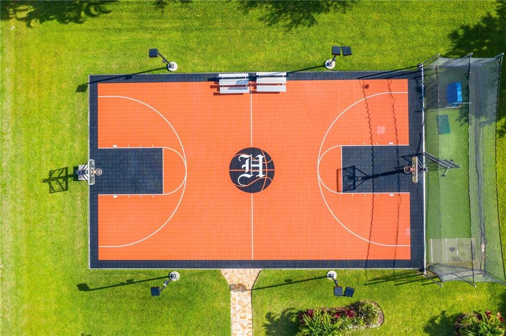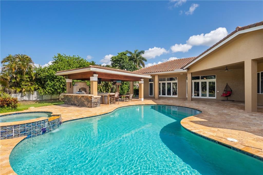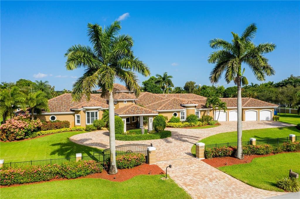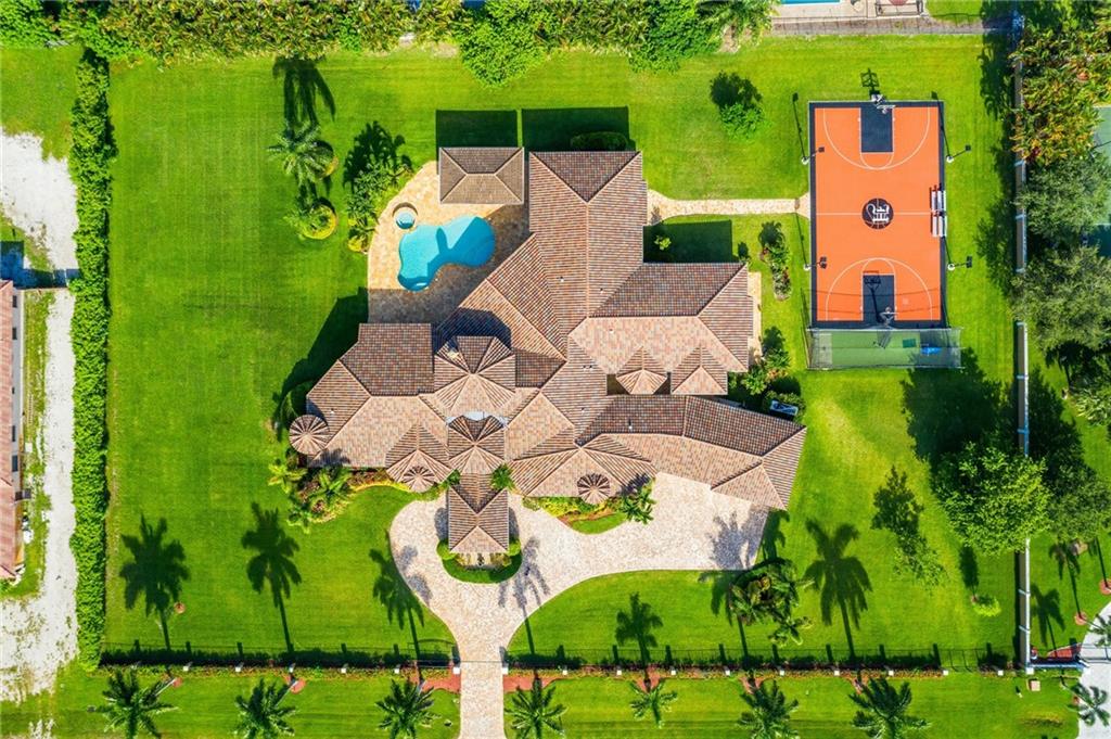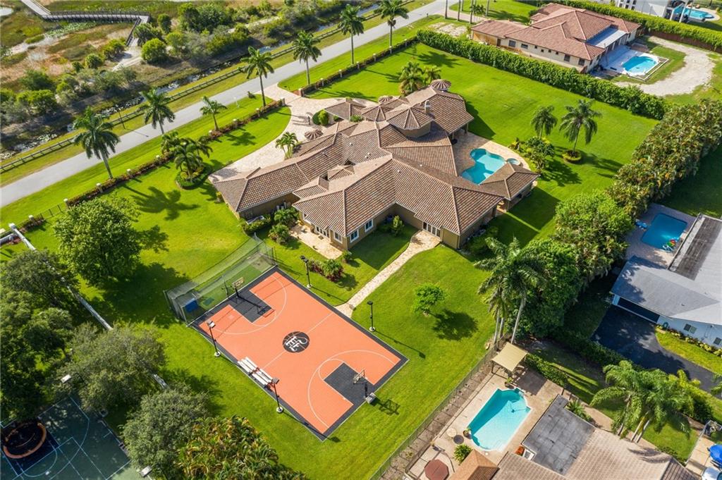 Transitional style custom 2.5 acre gated compound w 2 yr new roof. Porte Cochère drive, open plan w foyer entry into lobby style living room & bar w fireplace, adjacent den & tropical saltwater fish tank. Free form pool & spa, covered patio & poolside resort style kitchen & bar. Formal dining & new contemporary kitchen accented w quartz counters, top caliber Thermador appliances & built-in wine cooler & cabinet. Massive owner's suite & sitting area, huge bathroom & 3 walk-in closets. Separate 4 bedroom wing each w ensuite baths. Additional rooms include home theater w resplendent sunken lounge seating, game/homework room, upscale fitness gym w steam & sauna,full court lit basketball w sport court surface, baseball pitching & batting cage. Whole home generator, impact windows & 5 zone AC.