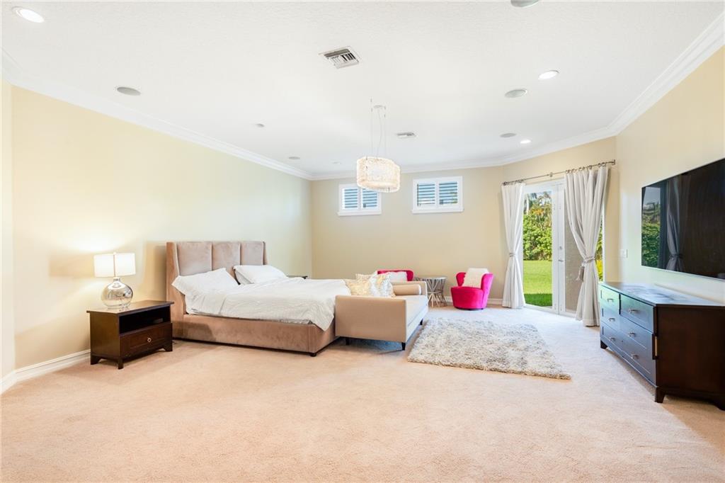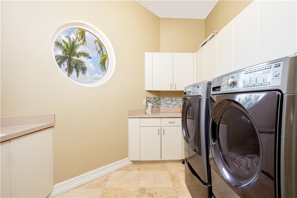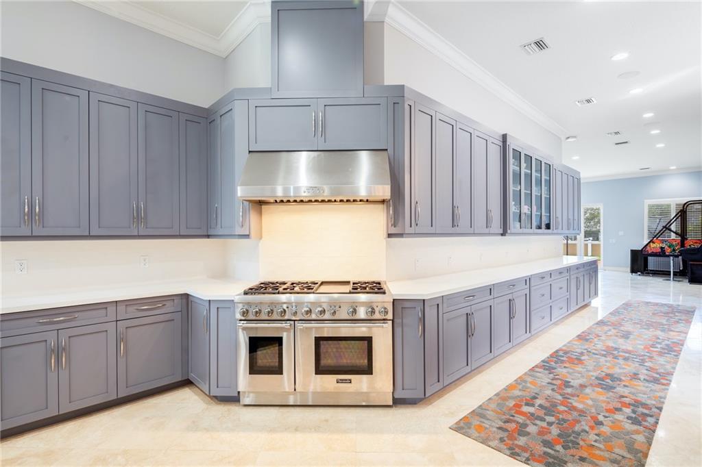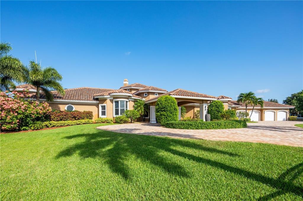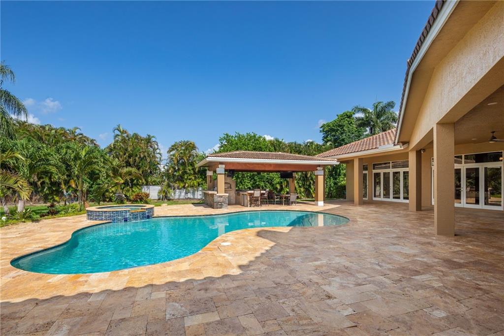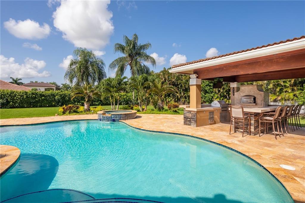 Transitional style custom 2.5 acre gated compound w 2 yr new roof. Porte Cochère drive, open plan w foyer entry into lobby style living room & bar w fireplace, adjacent den & tropical saltwater fish tank. Free form pool & spa, covered patio & poolside resort style kitchen & bar. Formal dining & new contemporary kitchen accented w quartz counters, top caliber Thermador appliances & built-in wine cooler & cabinet. Massive owner's suite & sitting area, huge bathroom & 3 walk-in closets. Separate 4 bedroom wing each w ensuite baths. Additional rooms include home theater w resplendent sunken lounge seating, game/homework room, upscale fitness gym w steam & sauna,full court lit basketball w sport court surface, baseball pitching & batting cage. Whole home generator, impact windows & 5 zone AC.