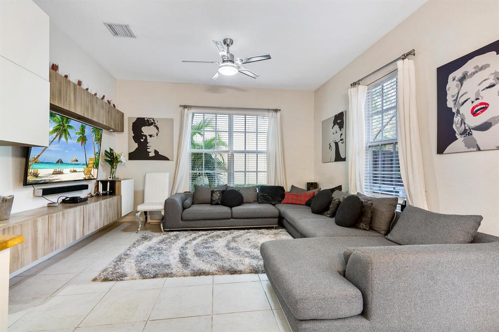 This spacious TH is conveniently located in the Ventura Greens community and borders the Emerald Dunes golf course. The 3 bed and 3 1/2 bath, almost 2000 sq ft unit boast 10-foot ceilings, hurricane impact windows, 1 car garage, driveway, and it is situated at the end of the building allowing light to pour into every room. Every bedroom has its own balcony and access to its own bathroom. The Master suite features his & her walk-in closets, dual sinks, separate tub/shower and a large balcony overlooking the backyard.