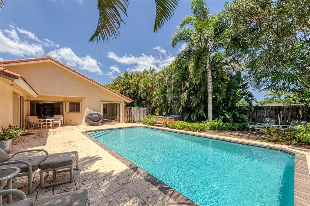 Great layout. 3 way bed rm split. Very private & tropical pool area. Large pool. Great for swimming laps. Free standing Hot Tub. Huge patio. Eat in Kitchen with Etura counter tops w/ breakfast bar area. Home is light & bright. The 4th bed rm is approx 381/sf & was added on in 2014. 4th bed rm is being used as a music room/den. Has a closet. Master bath rm was tastefully remodeled in 2019. A/C 2014. New disposal. Inside Washer/Dryer . Vaulted ceilings. Cabana Bath. White Tile throughout the living , dinning, kitchen & 4th bed rm. Accordion shutters on all windows. End of a Cul De Sac. Big size lot almost 10,000/sf. Owners have kept this home up. Walking distance to Verde Elementary. In Omni Middle & Spanish River High district. Walk to the Town Center mall, shopping & restaurants.