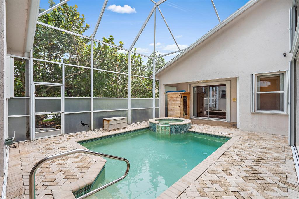 Rare 3 bedroom, 3 full bath courtyard style pool home in beautiful Preserve at Ironhorse! This home features 2BR/2BA in the main house plus a 1BR/1BA detached guest house. Light, bright and spacious, this home is on a corner lot, adjacent to a quiet cul-de-sac. Fabulous home for entertaining with screened pool, spa and sauna! Desirable side load 2 car garage, plus golf cart garage! Closet and storage space galore! Accordion Hurricane shutters throughout. Ironhorse has several membership options available, however membership to the club is not mandatory. This beautiful club offers golf, clubhouse, fitness center, resort style pool, tennis and dining.