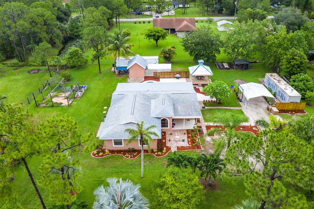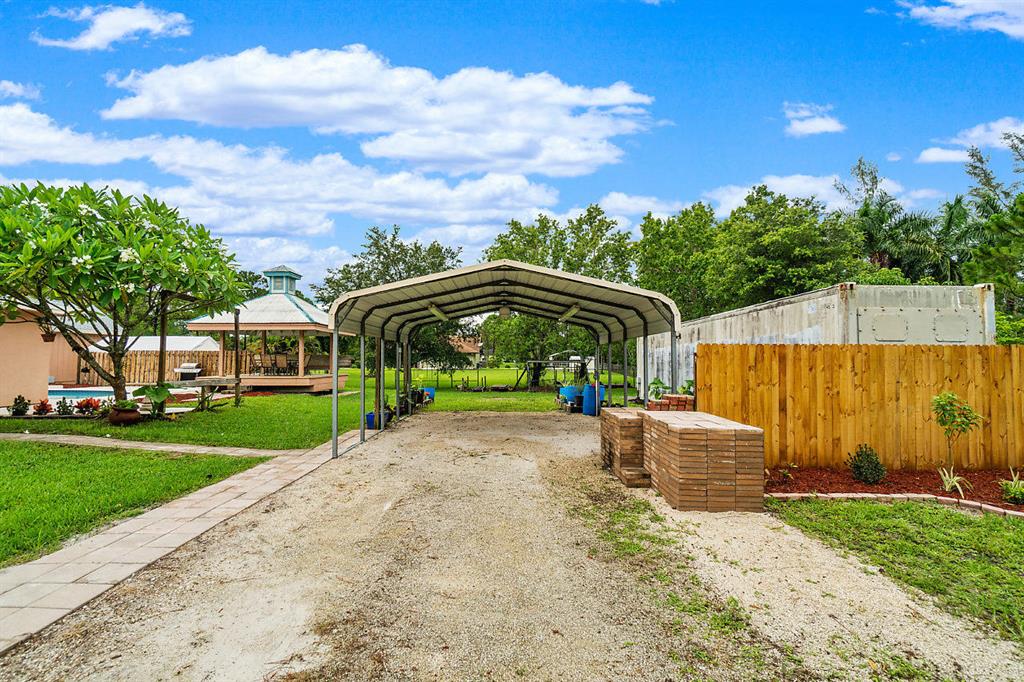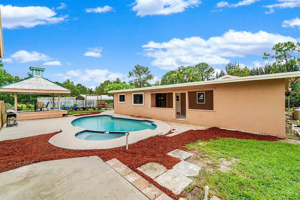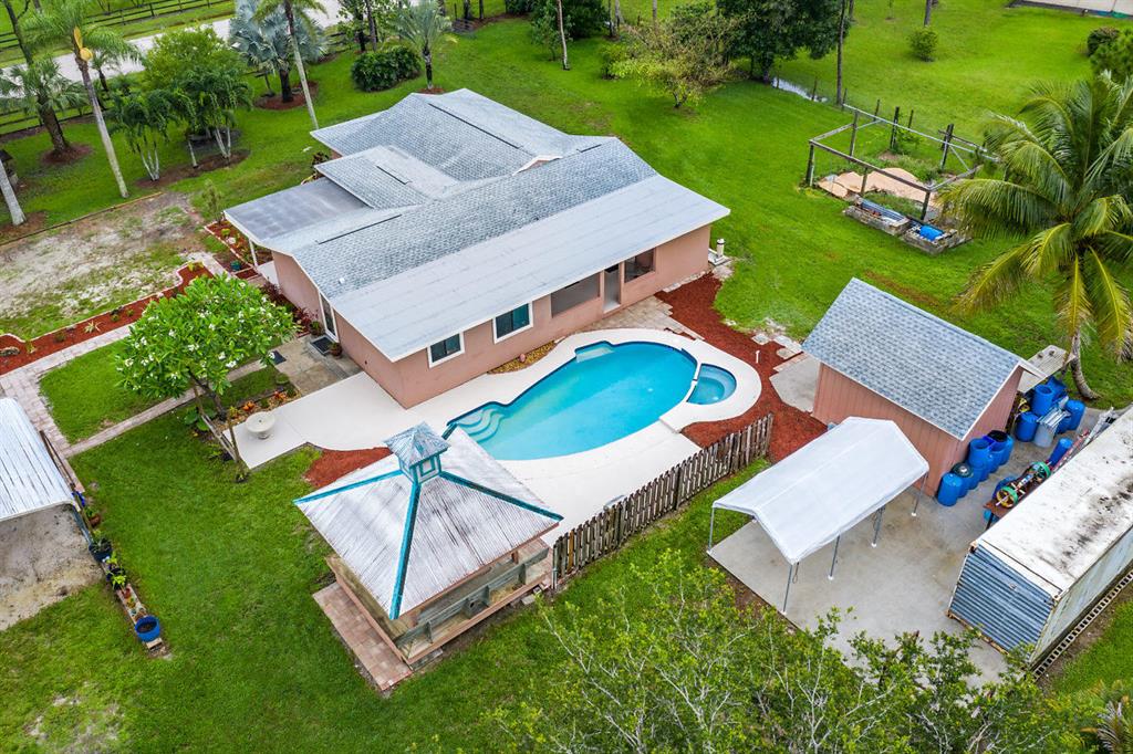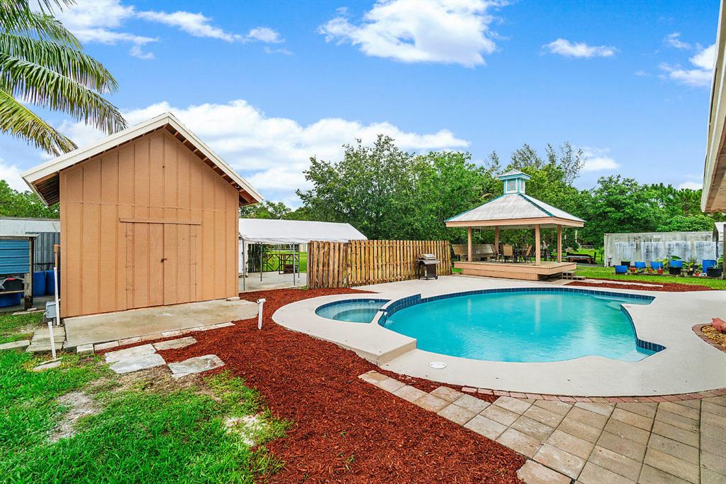 Beautiful POOL home, just in time for summer! Brand new shingle roof (2020) & public water! Well cared for, large home with vaulted ceilings and hardwood flooring in main living areas. Open concept remodeled kitchen with wood cabinetry, granite countertops, breakfast bar and stainless steel appliances. Real cypress wood trim and door casings. Updated cabana bath. Tons of storage and large closets. Huge indoor laundry room with front load washer/dryer. R-19 insulation and thermal barrier. Open pool and gazebo for backyard entertaining. Property is fully fenced and includes 2 gates, 2 car carport, detached matching shed, food garden and fruit trees. Empty shipping containers convey!