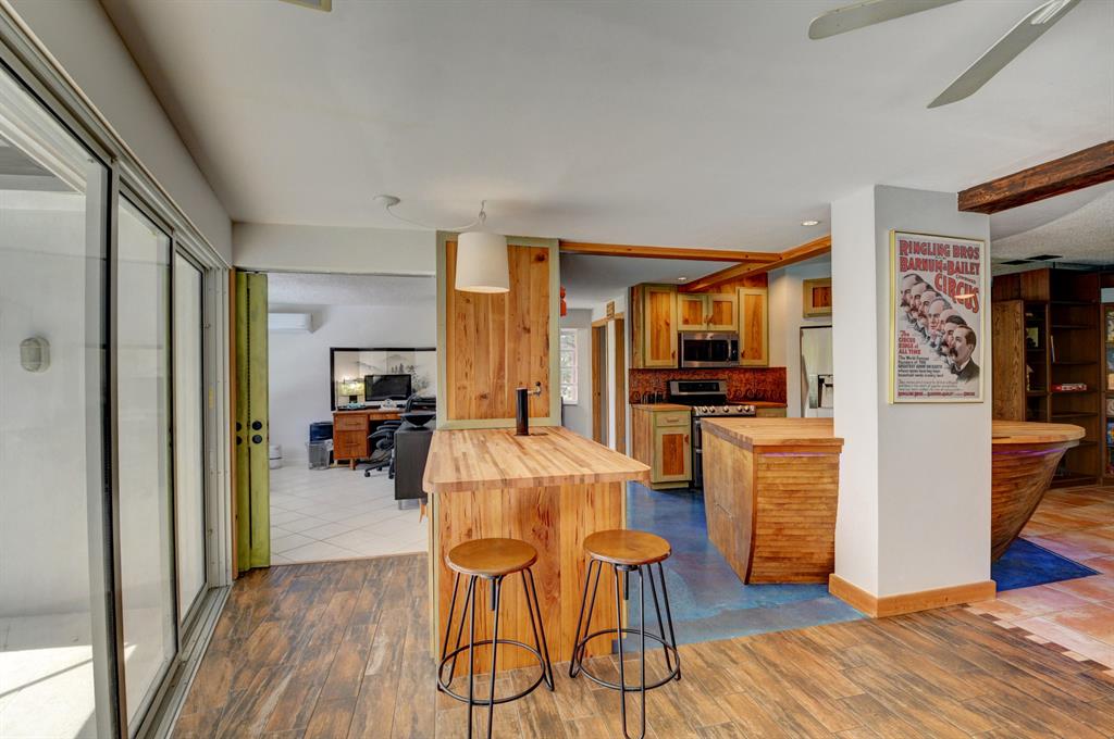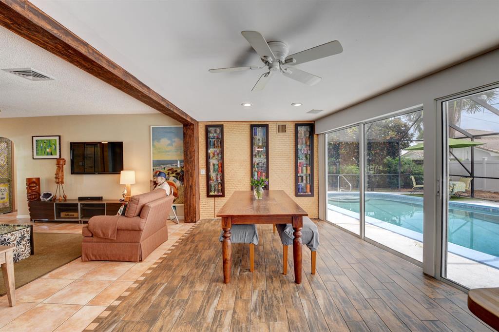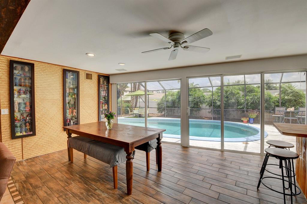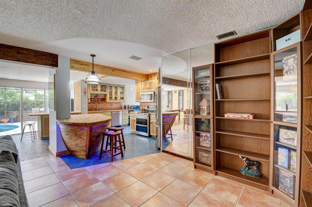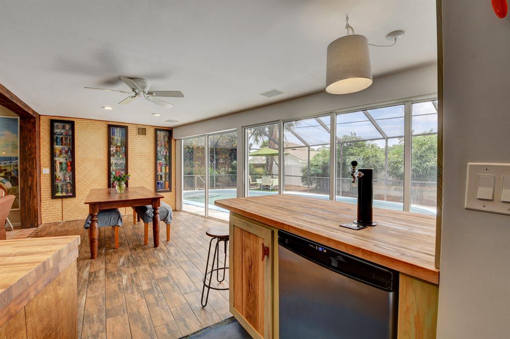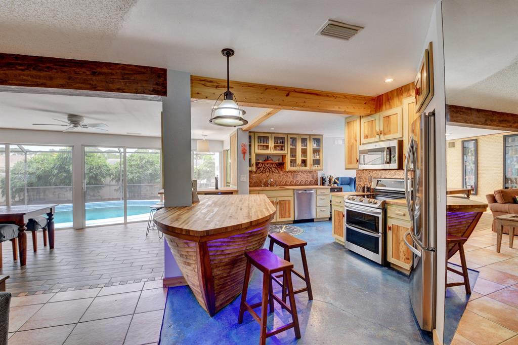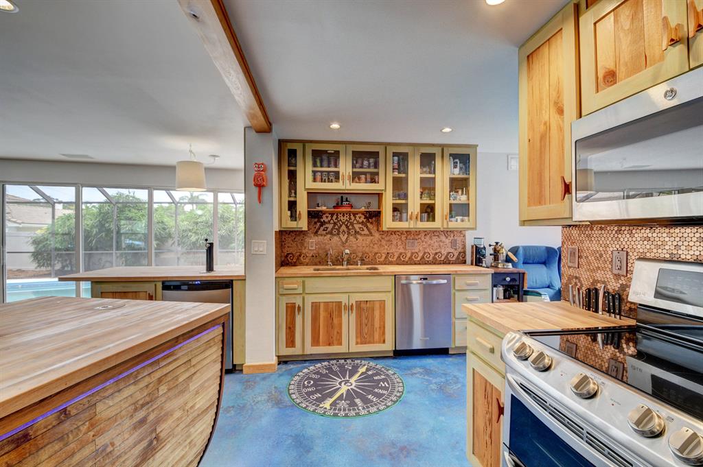Enjoy the tropical tiki life in this one of a kind 2/2 plus den, 2 car garage, pool home. Features include impact windows, 1 yr old AC, large laundry room, LED lighting, tankless hot water, custom built kitchen including an island made in the shape of a bow of a boat and mozaic backsplash made from pennies. Both bathrooms have been updated. Minutes away from Town Center Shops and easy access to I-95 in the quiet neighborhood of Paradise Palms.