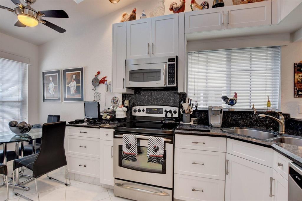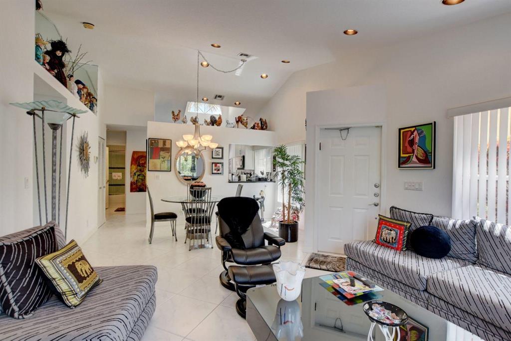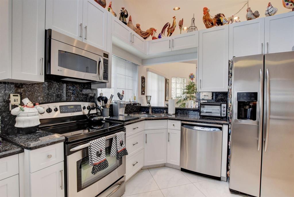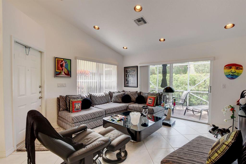Adorable one story home in popular Panache subdivision of Boca Pointe. This charming 2/2 with a one car garage has an updated kitchen with white cabinets, granite counters and stainless steel appliances plus a pass through to the dining room all done approximately 5 years ago. The main living areas have large white and gray tile floor and bedrooms are carpeted. Enjoy the private garden views from the screened in patio. Roof replaced 2009. Lots of high hat lighting through out. Full accordion hurricane shutters. Large walk in closet in master bedroom. Gutters recently replaced.