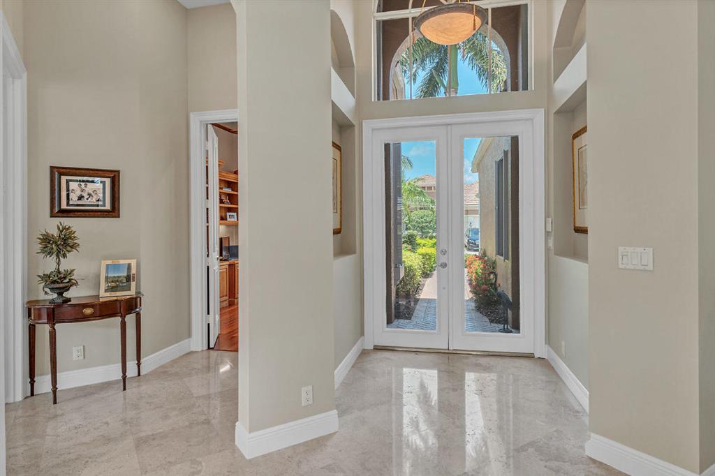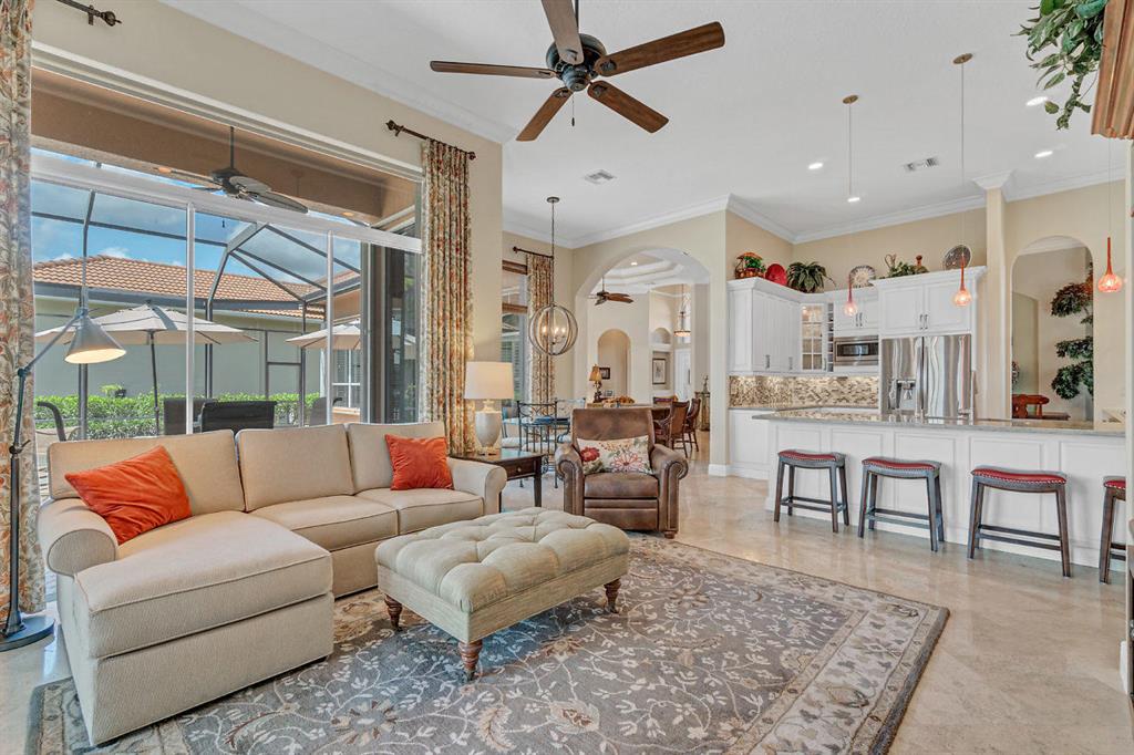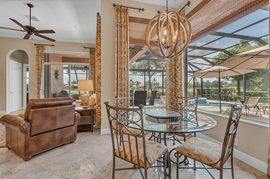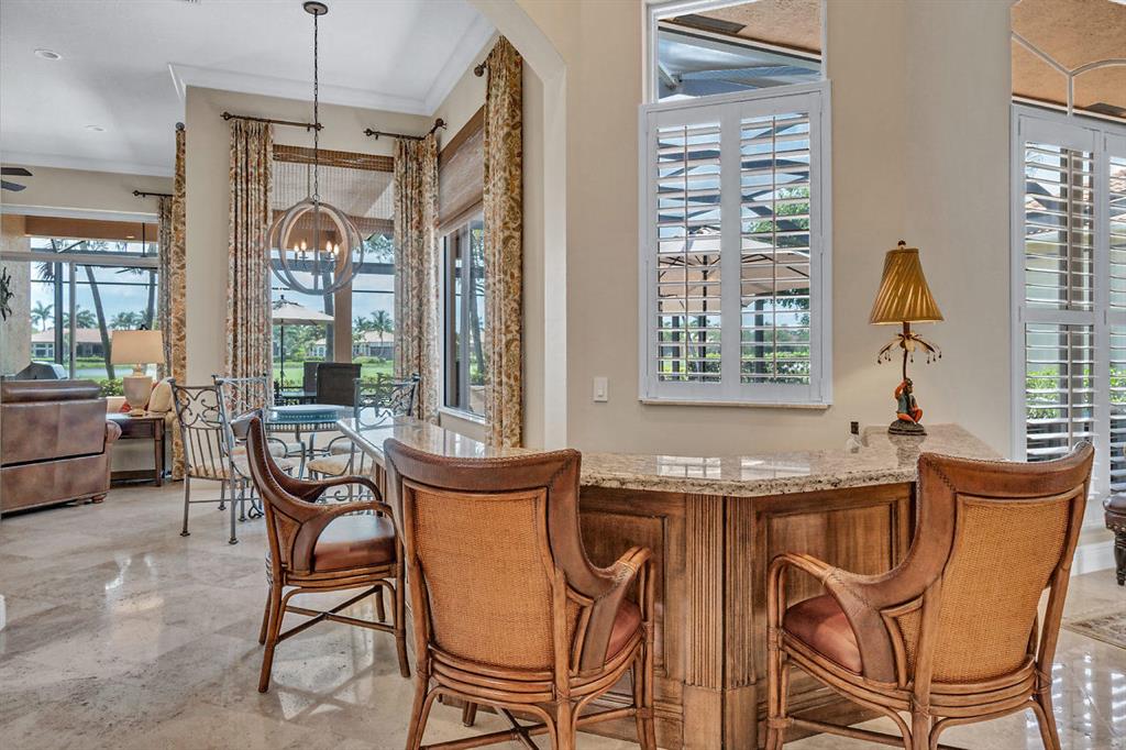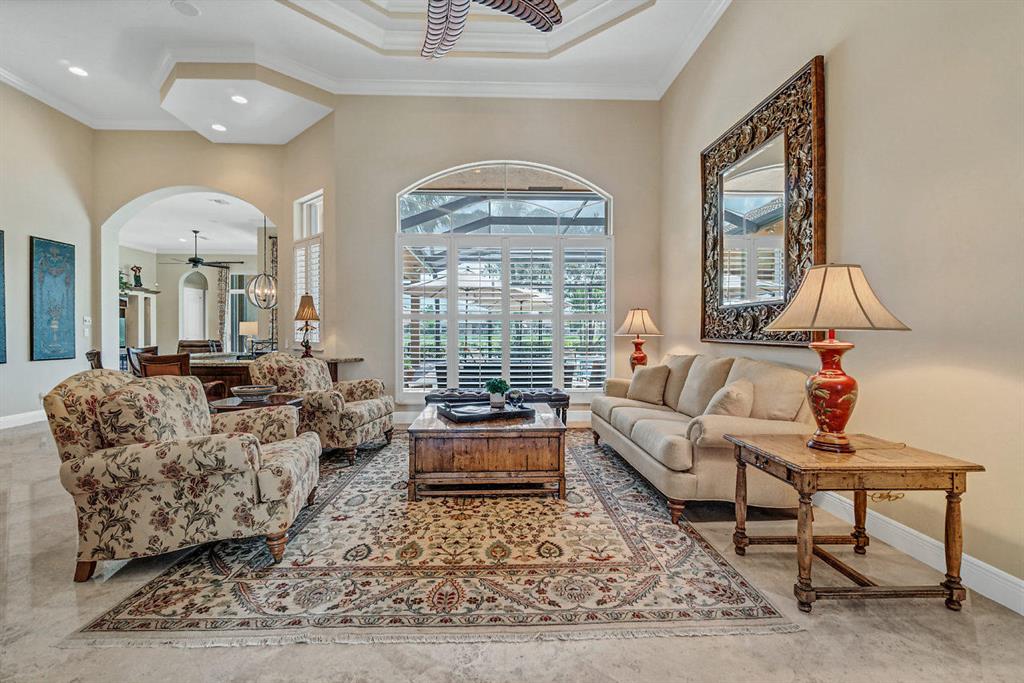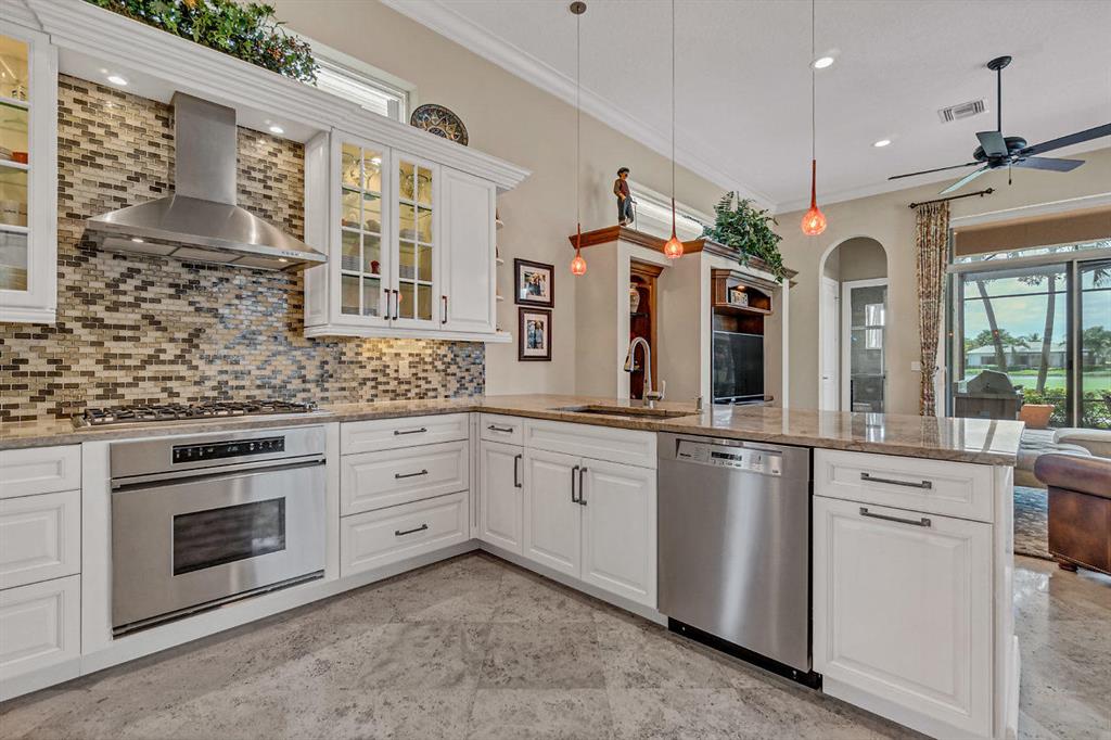 Check out the NEW 360 Degree virtual tour! Gorgeous move in ready home! Rarely available model offering 3 bedrooms plus a den and 4 full baths. Accordion hurricane shutters, marble floors, crown molding, office built-ins, plantation shutters, and neutral colors throughout. Fully renovated kitchen! White cabinets, quartz countertops, mosaic backsplash, natural gas range with vented hood. Adjacent family room and cabana bath. Huge master bedroom suite with wood floors. Both guest bedrooms have private baths. The patio is amazing!! Enormous pool and spa, fully screened! Enjoy beautiful sunsets with golf and water views. A true paradise!