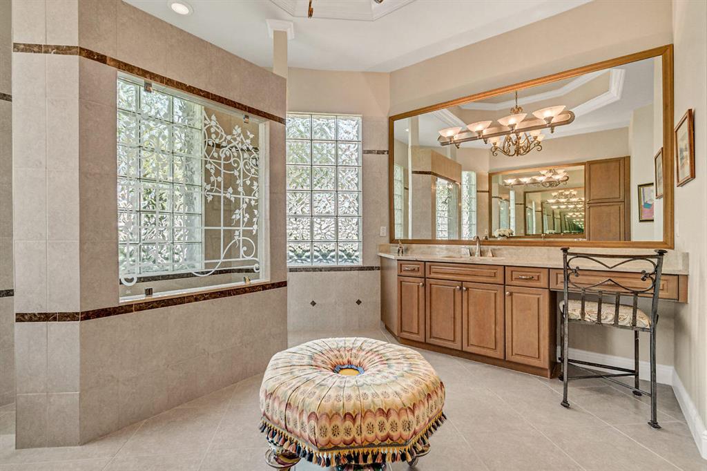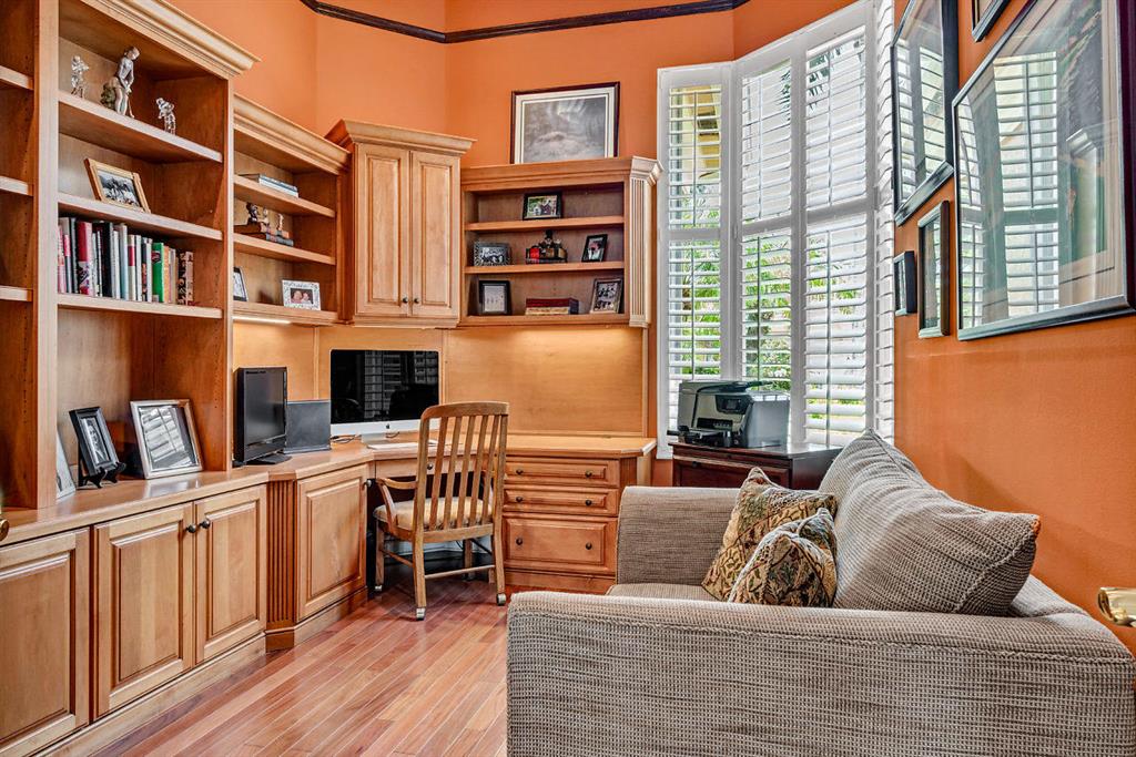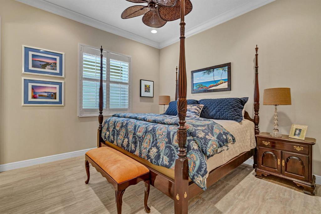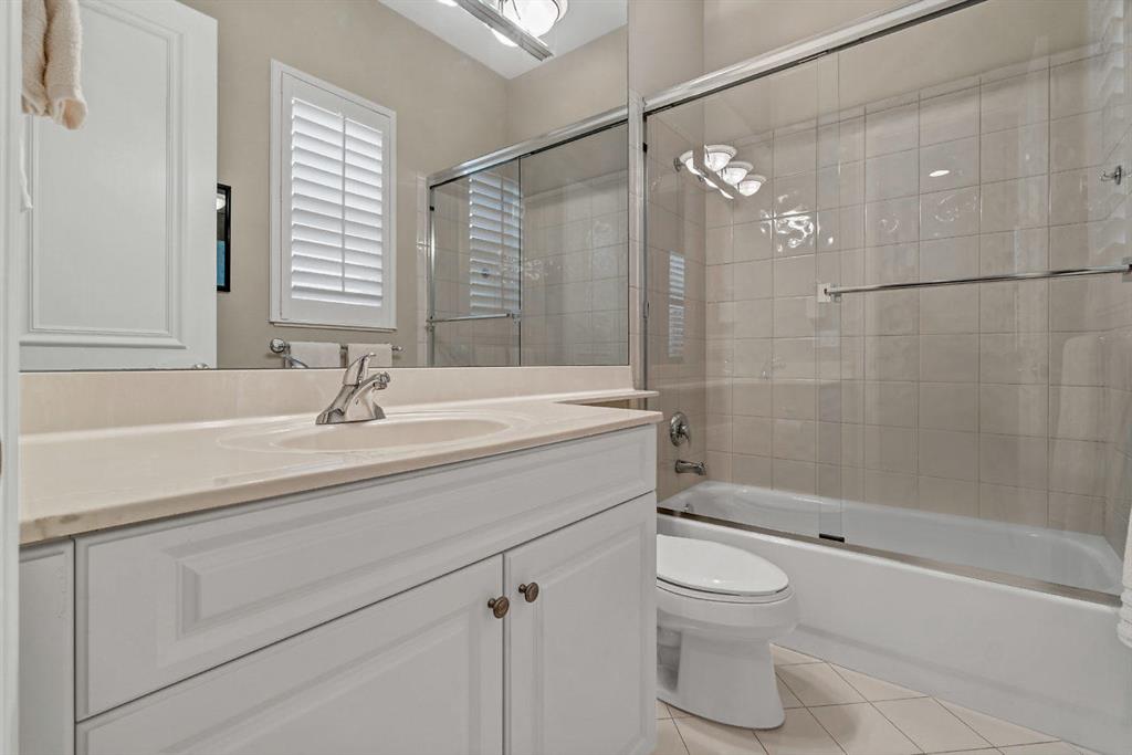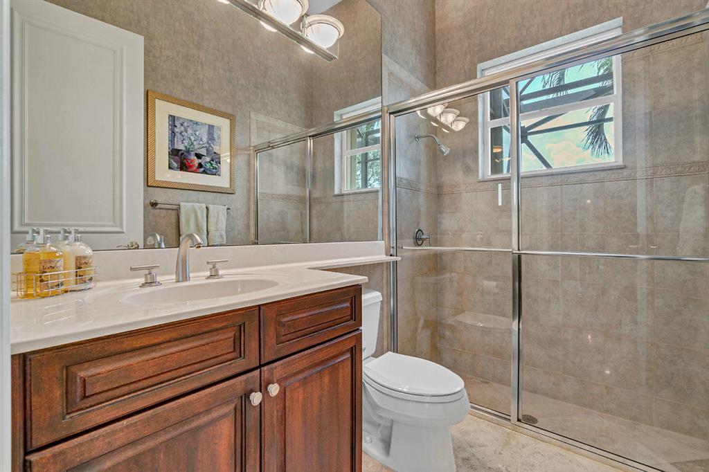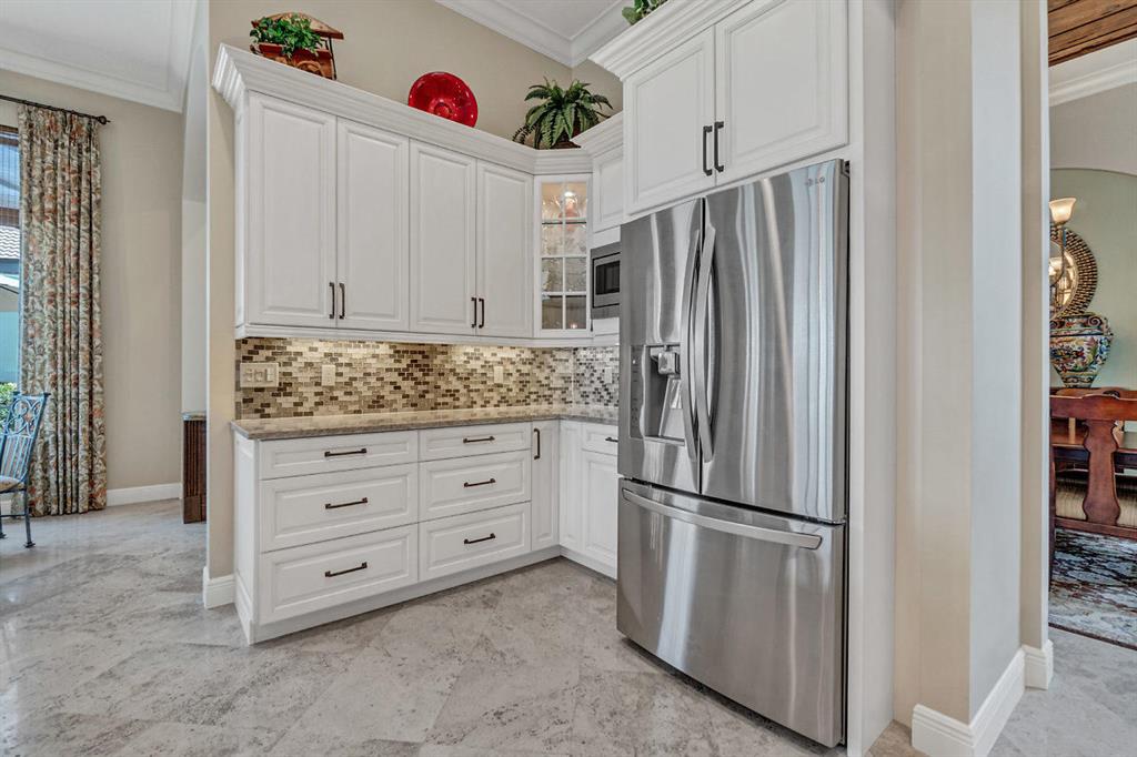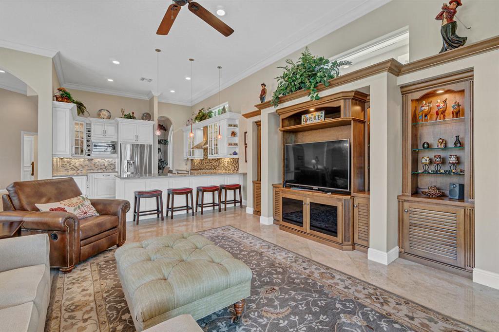 Check out the NEW 360 Degree virtual tour! Gorgeous move in ready home! Rarely available model offering 3 bedrooms plus a den and 4 full baths. Accordion hurricane shutters, marble floors, crown molding, office built-ins, plantation shutters, and neutral colors throughout. Fully renovated kitchen! White cabinets, quartz countertops, mosaic backsplash, natural gas range with vented hood. Adjacent family room and cabana bath. Huge master bedroom suite with wood floors. Both guest bedrooms have private baths. The patio is amazing!! Enormous pool and spa, fully screened! Enjoy beautiful sunsets with golf and water views. A true paradise!