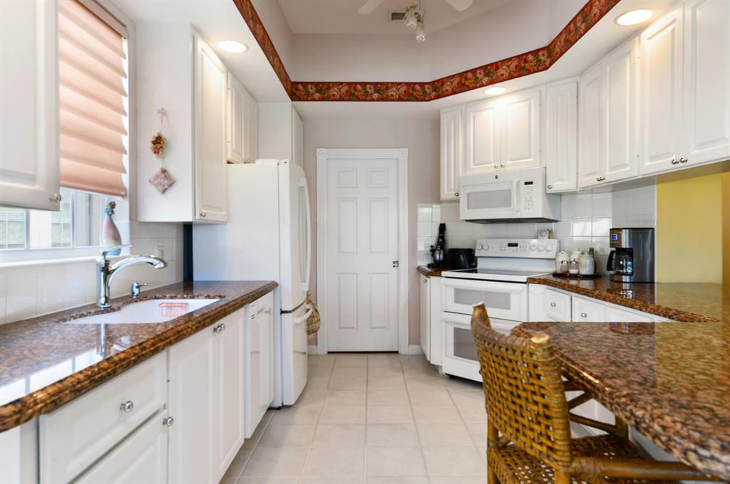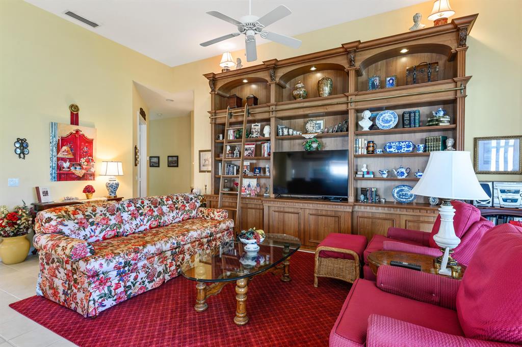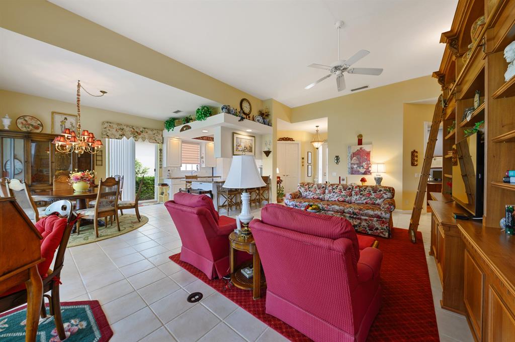 This Oakmont, on a Gorgeous Extensively Landscaped Lakeside Lot, has an Ambiance & a Level of Sophistication that Separates it From the Rest! I The Inviting Lush Motor Court with a Side Load Garage leads to The Screened Covered Entry, with A Stunning New Leaded Glass Door & Side Window, that Opens to the Tile Foyer with a Newer Fixture leading to the Tile Great Room with a 12 Foot Ceiling & a Gorgeous One of a Kind Wood, Furniture Quality Bookcase/Entertainment Center, with a Ladder, giving it an English Library Feel & also To the Tile Dining room, that combined with the Great Room have 18 Feet of Sliding Glass Doors that Open to a 22 Foot Lanai with views of the Lake & the Lushly Landscaped Grounds & Garden! It also has another Set of Sliding Glass Doors that open to a Private Landscaped